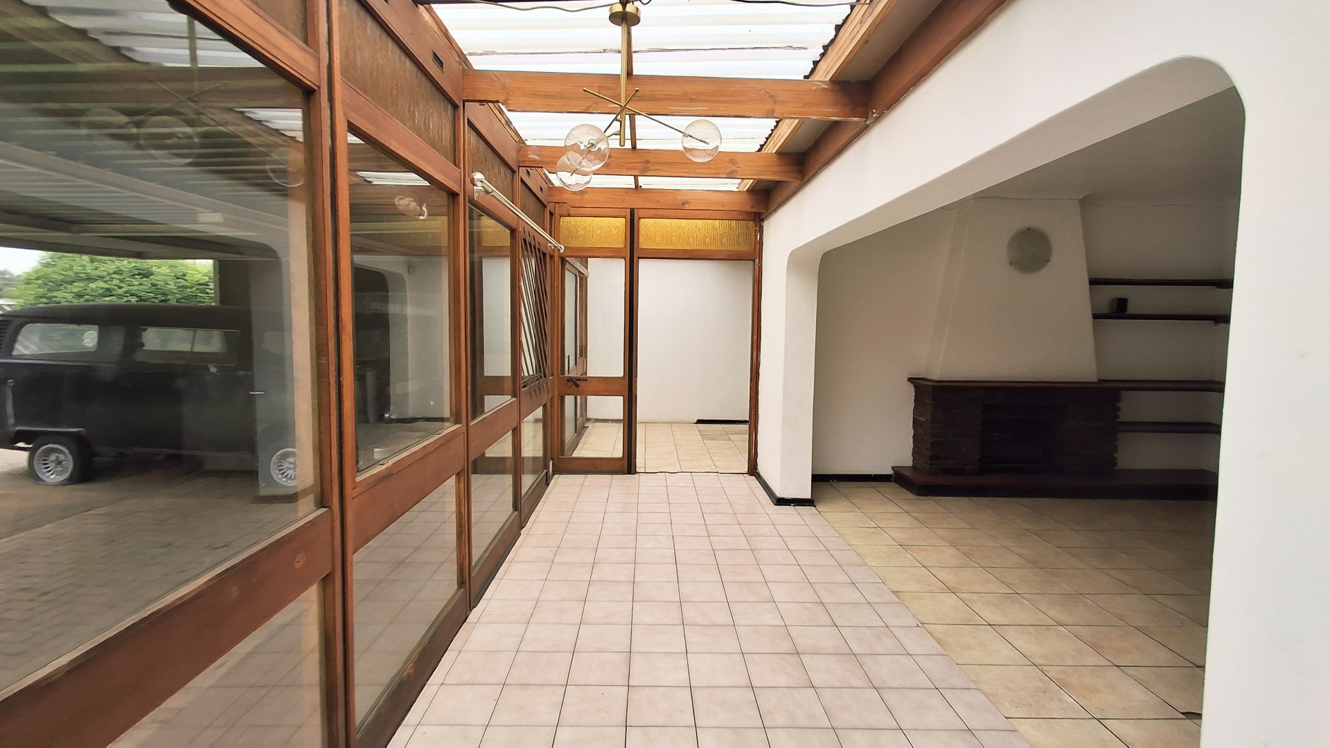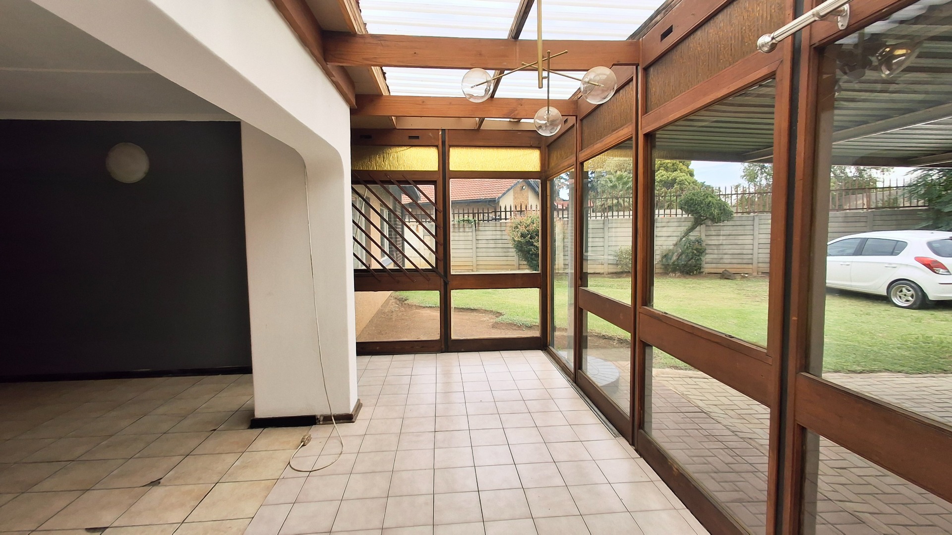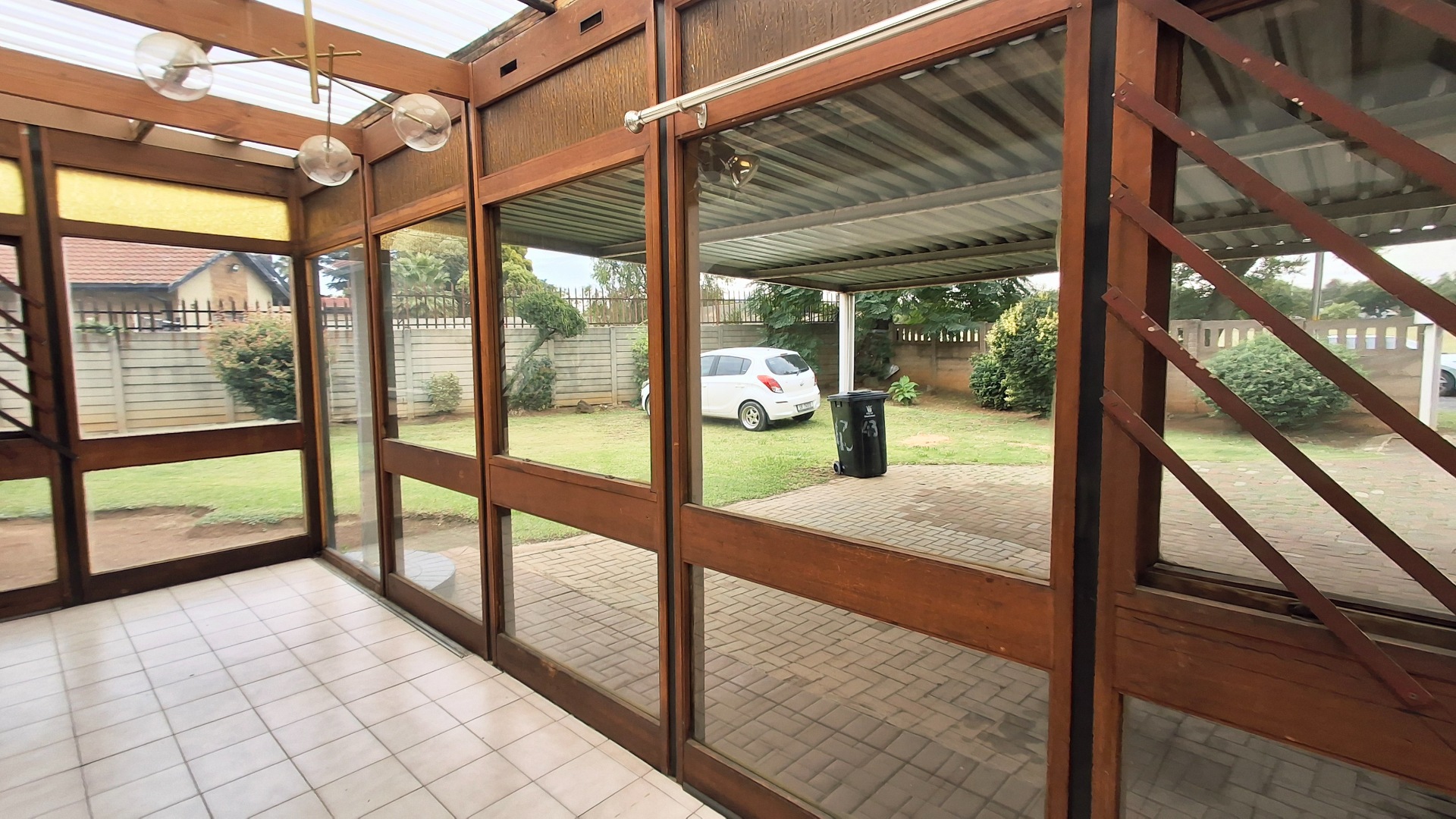 Set on a generous 1160 sqm erf, this home offers significant potential for modernization and personalization. The exterior features a paved driveway leading to a substantial covered carport, providing ample parking. An enclosed front patio or sunroom, with its extensive wooden-framed glass panels and translucent roof, adds versatile living space and allows abundant natural light to flood the interior. This bright, open-plan area seamlessly connects to the main living spaces, including a lounge and a dedicated dining room.