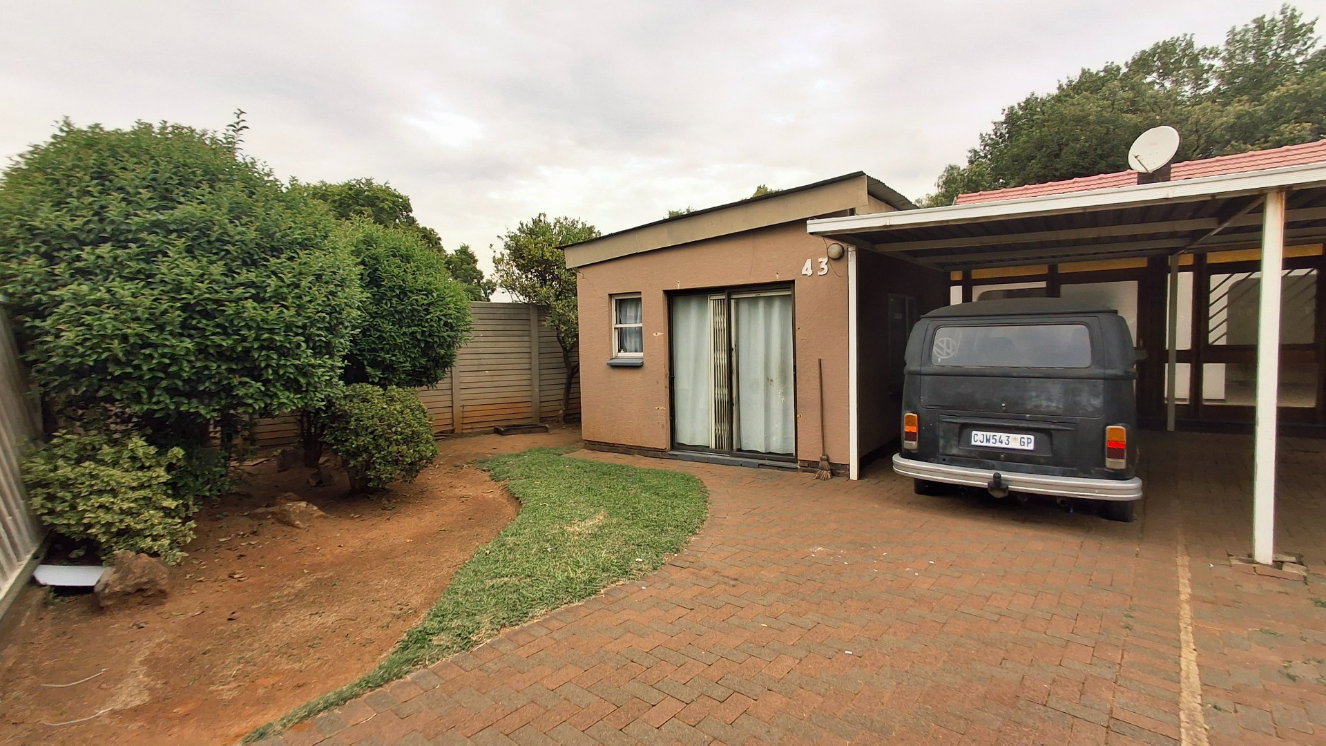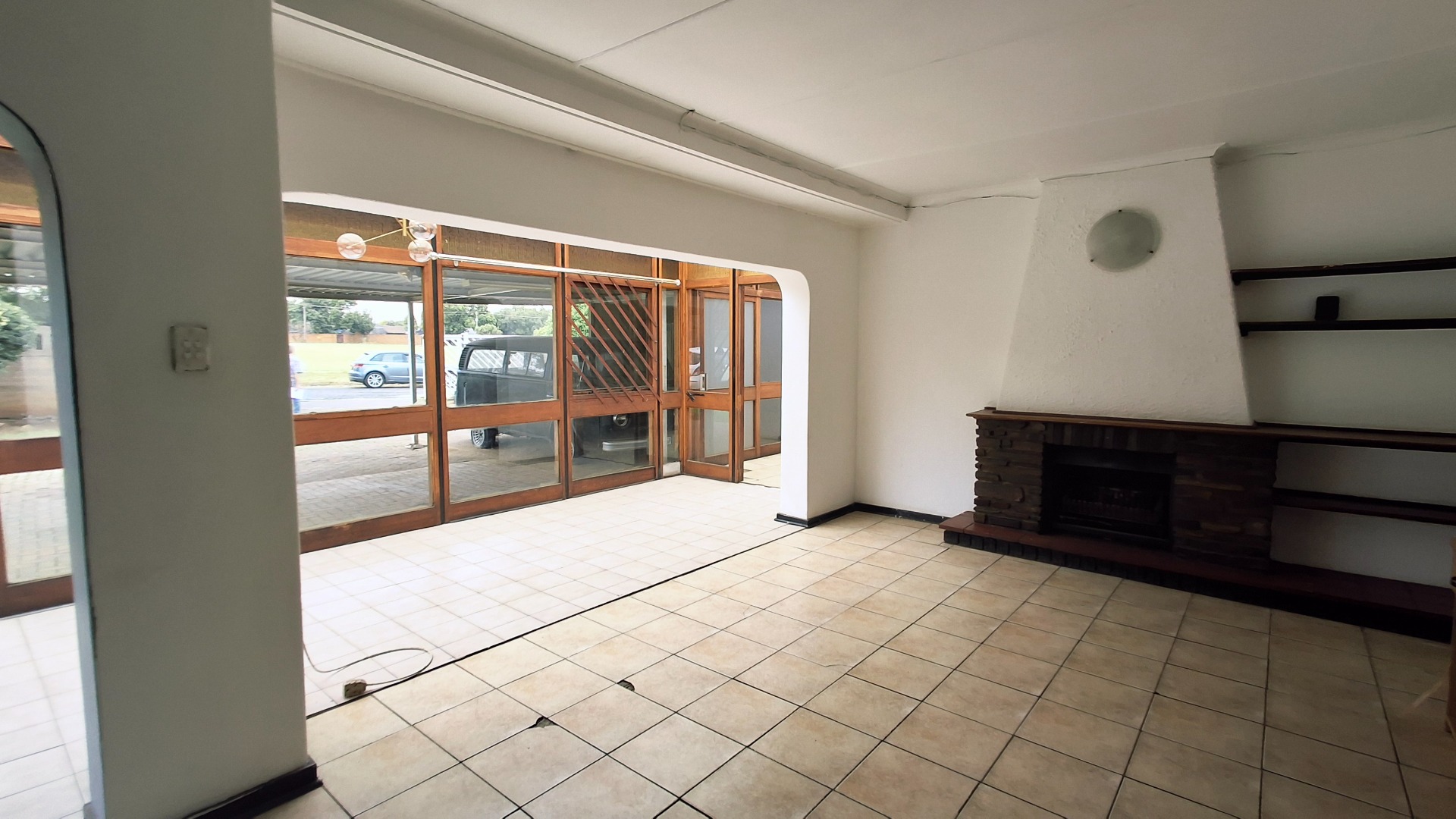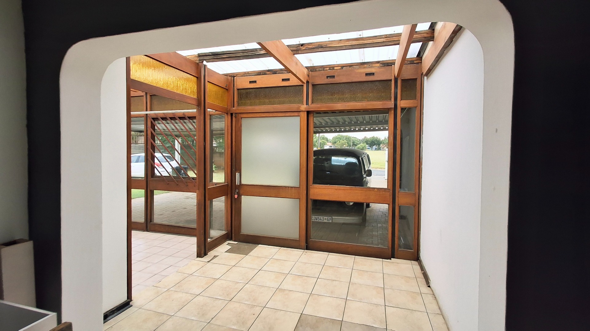 Set on a generous 1160 sqm erf, this home offers significant potential for modernization and personalization. The exterior features a paved driveway leading to a substantial covered carport, providing ample parking. An enclosed front patio or sunroom, with its extensive wooden-framed glass panels and translucent roof, adds versatile living space and allows abundant natural light to flood the interior. This bright, open-plan area seamlessly connects to the main living spaces, including a lounge and a dedicated dining room.