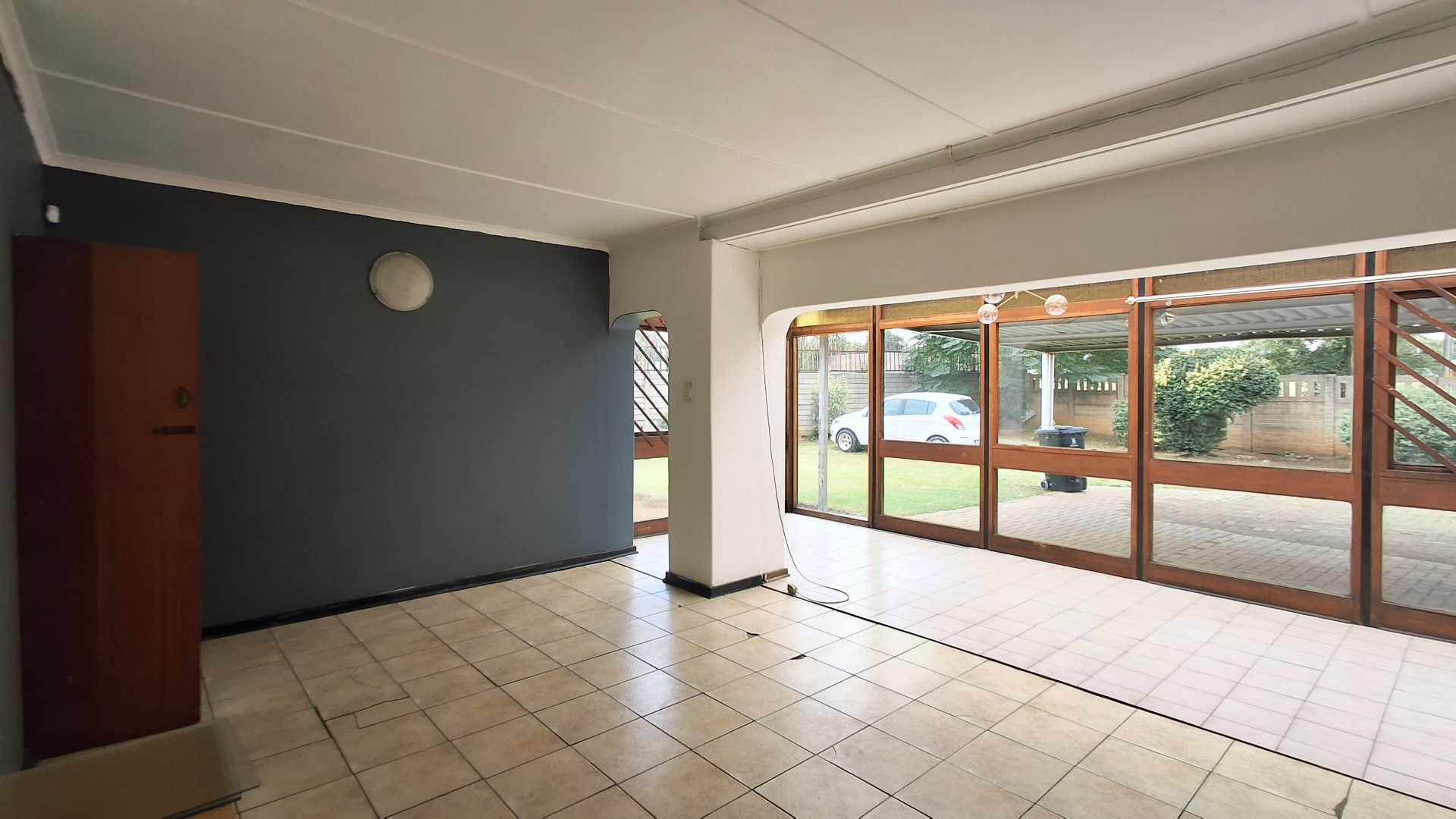 Set on a generous 1160 sqm erf, this home offers significant potential for modernization and personalization. The exterior features a paved driveway leading to a substantial covered carport, providing ample parking. An enclosed front patio or sunroom, with its extensive wooden-framed glass panels and translucent roof, adds versatile living space and allows abundant natural light to flood the interior. This bright, open-plan area seamlessly connects to the main living spaces, including a lounge and a dedicated dining room.