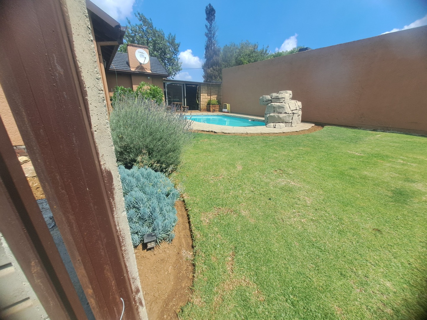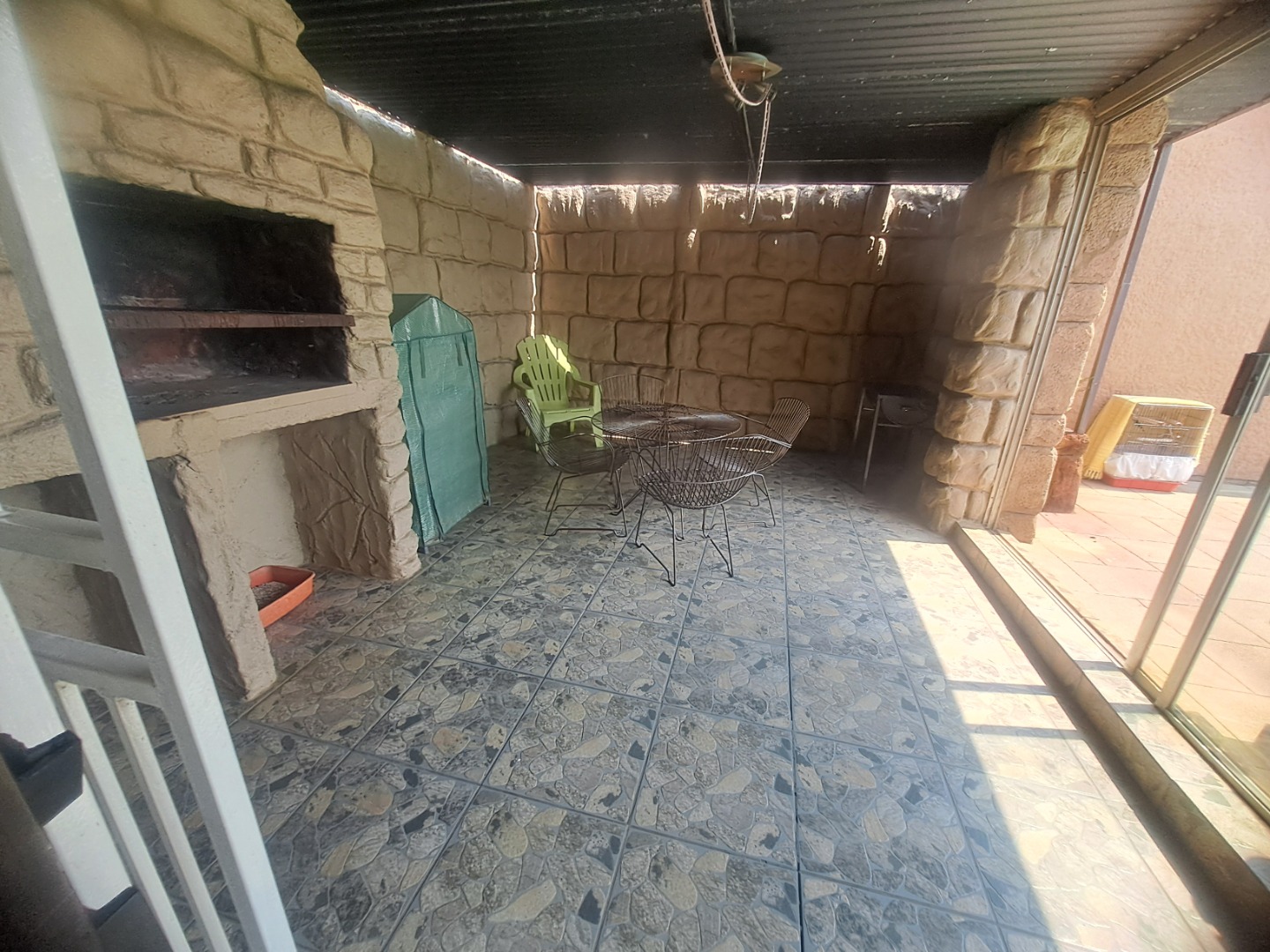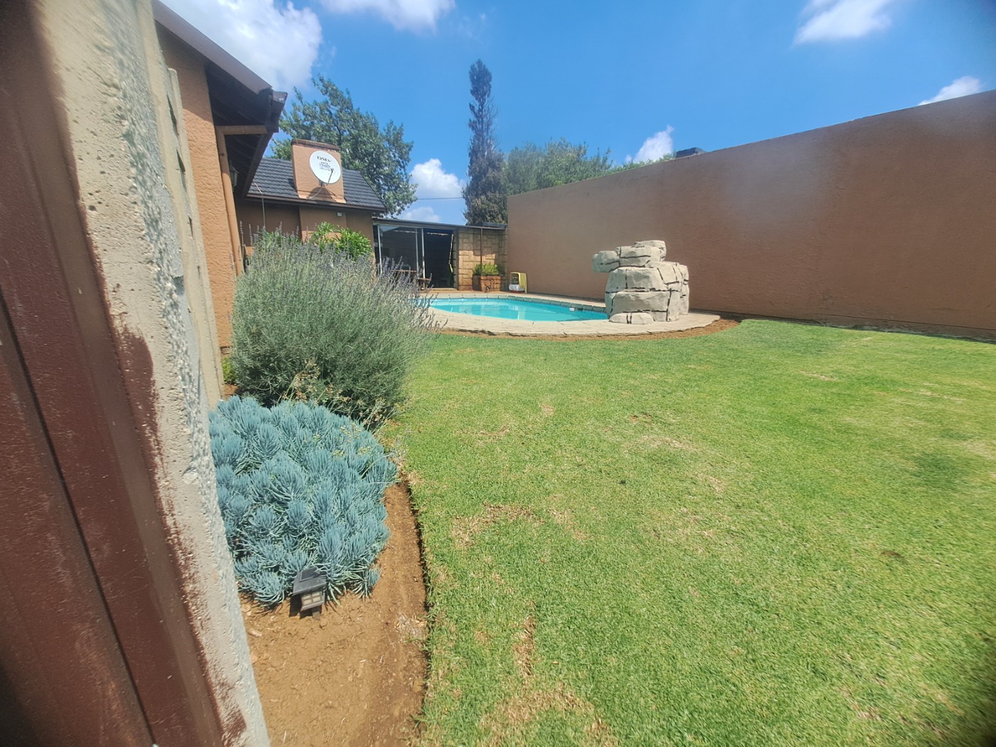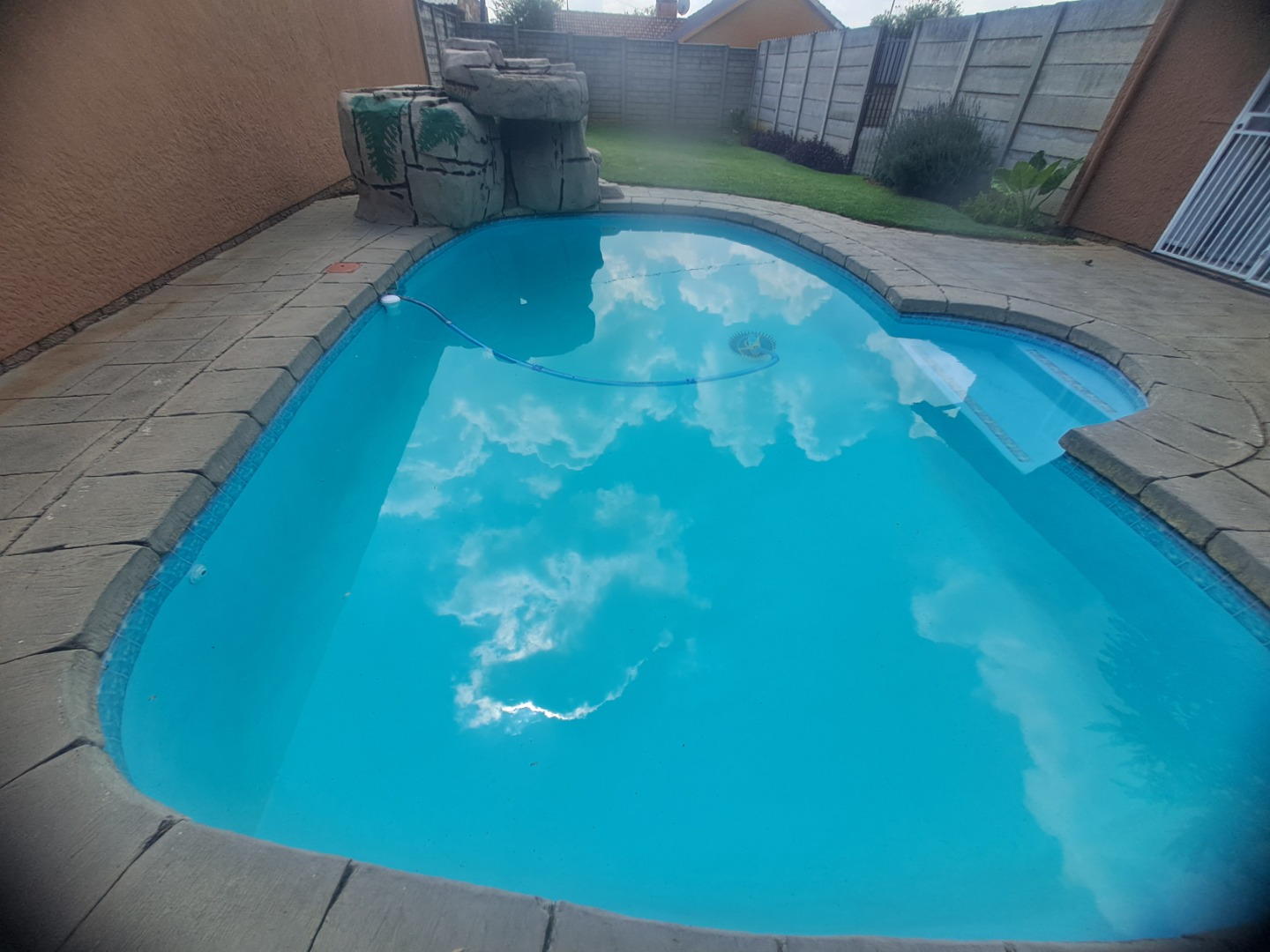 Outdoors, the property continues to impress with a large, well-maintained garden and a secure perimeter fence, perfect for pets and outdoor activities. Enjoy the water in a sky blue swimming pool and a built-in braai for entertaining, complemented by a fireplace for cooler evenings. Parking is well catered for with a double garage and additional open parking spaces.