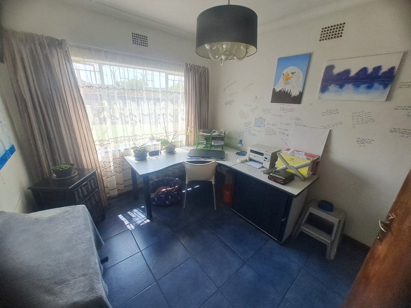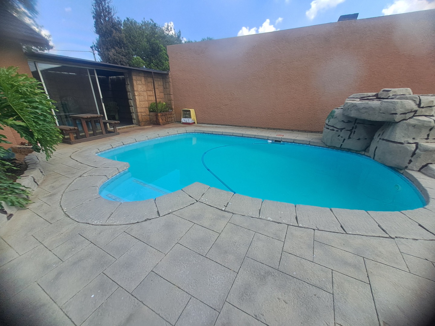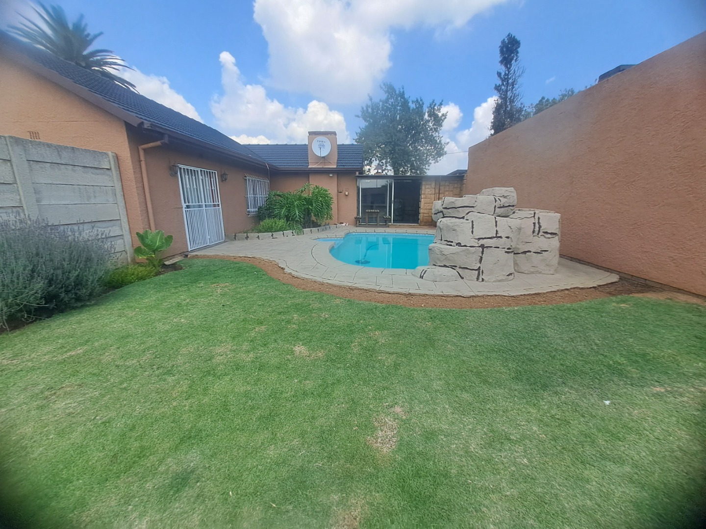 Outdoors, the property continues to impress with a large, well-maintained garden and a secure perimeter fence, perfect for pets and outdoor activities. Enjoy the water in a sky blue swimming pool and a built-in braai for entertaining, complemented by a fireplace for cooler evenings. Parking is well catered for with a double garage and additional open parking spaces.
