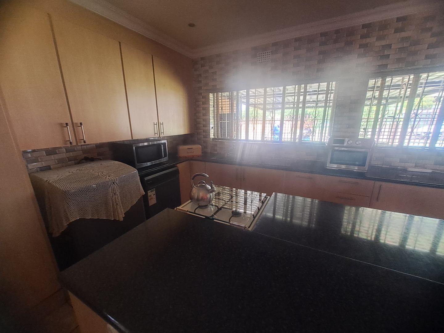 Step inside to an open-plan living environment, where natural light floods the spacious kitchen, lounge and dining area. The kitchen boasts ample light wood cabinetry, dark granite countertops, and a practical island with a built-in hob, a gas stove, making it ideal for both everyday meals and entertaining. Tiled flooring ensures easy maintenance throughout.