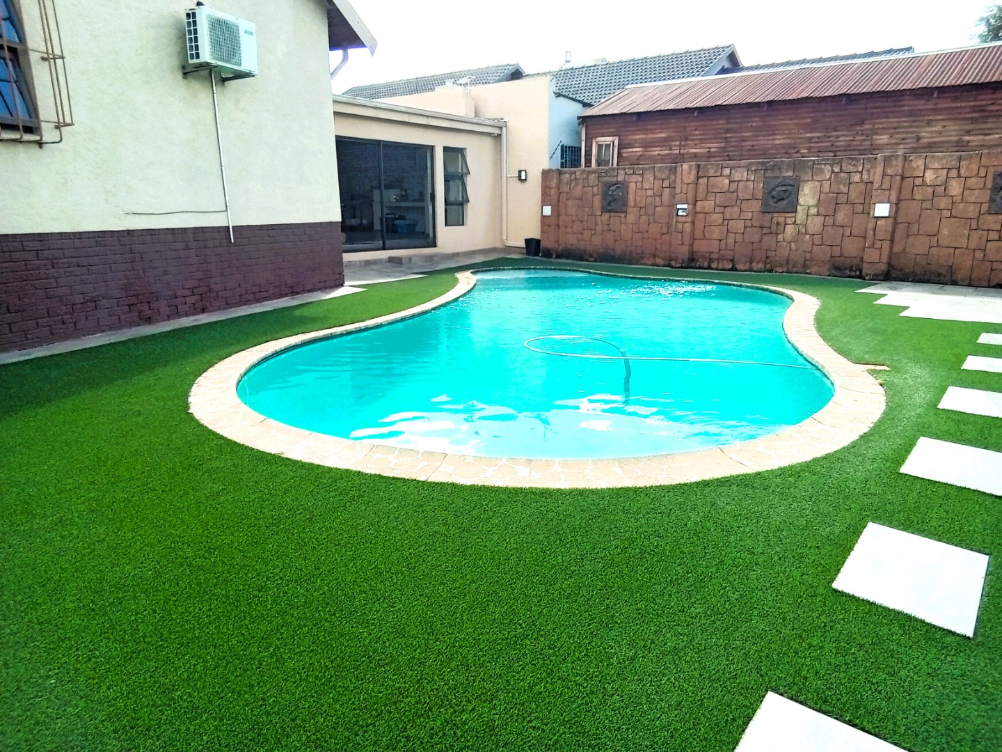 The interior features two spacious bedrooms, both equipped with air conditioning, as well as a lounge with air conditioning and a cozy fireplace, perfect for relaxing on chilly evenings. The lounge also includes a bar and entertainment area, ideal for socializing and entertaining guests. The kitchen is well-appointed with sleek granite tops, and the outdoor area features a large swimming pool, nestled in a private section of the house, perfect for soaking up the sun or enjoying a refreshing dip. Located on a quiet street, this beautiful home faces a picturesque park, offering a tranquil and serene atmosphere, perfect for those seeking a peaceful retreat.