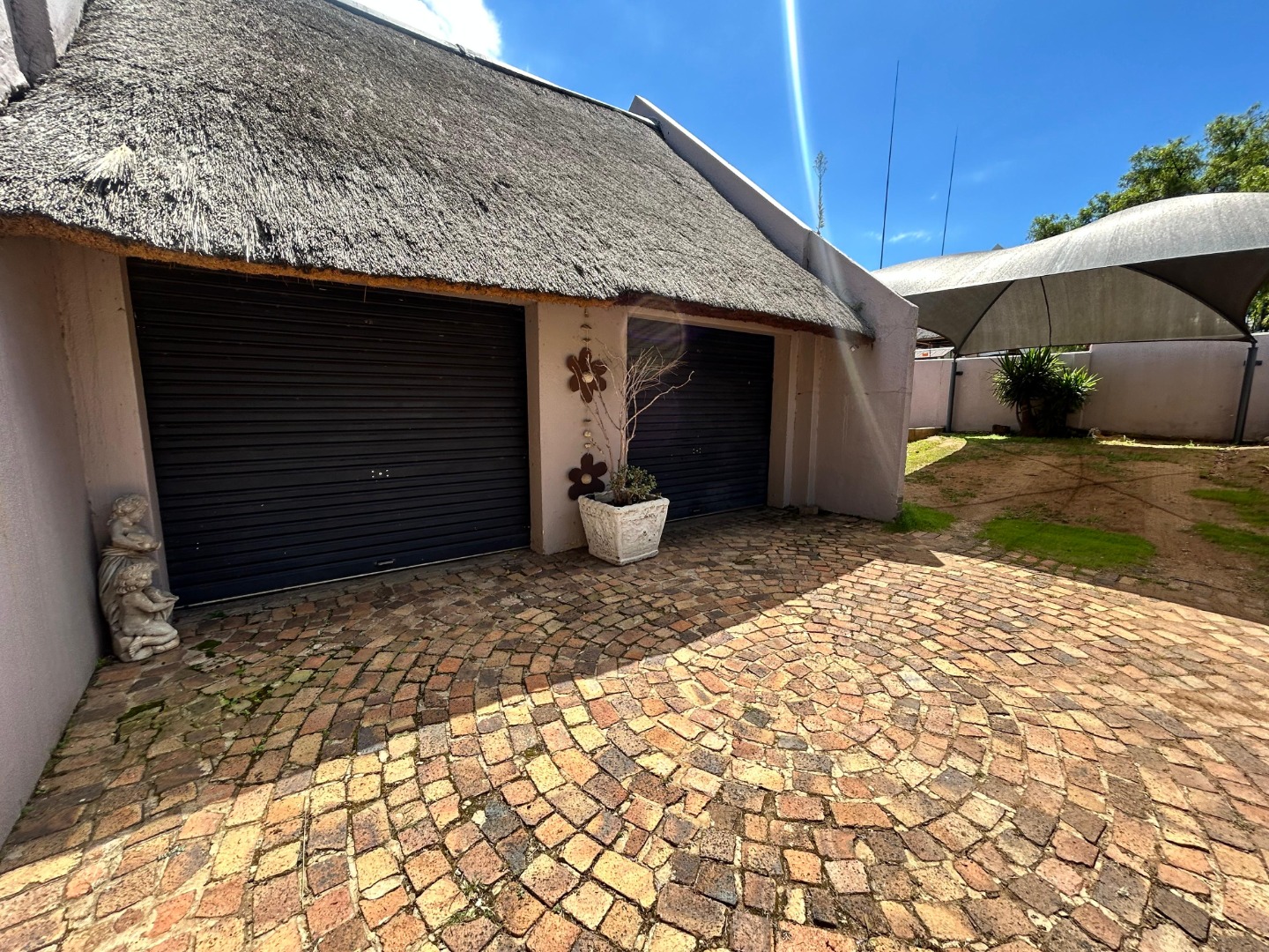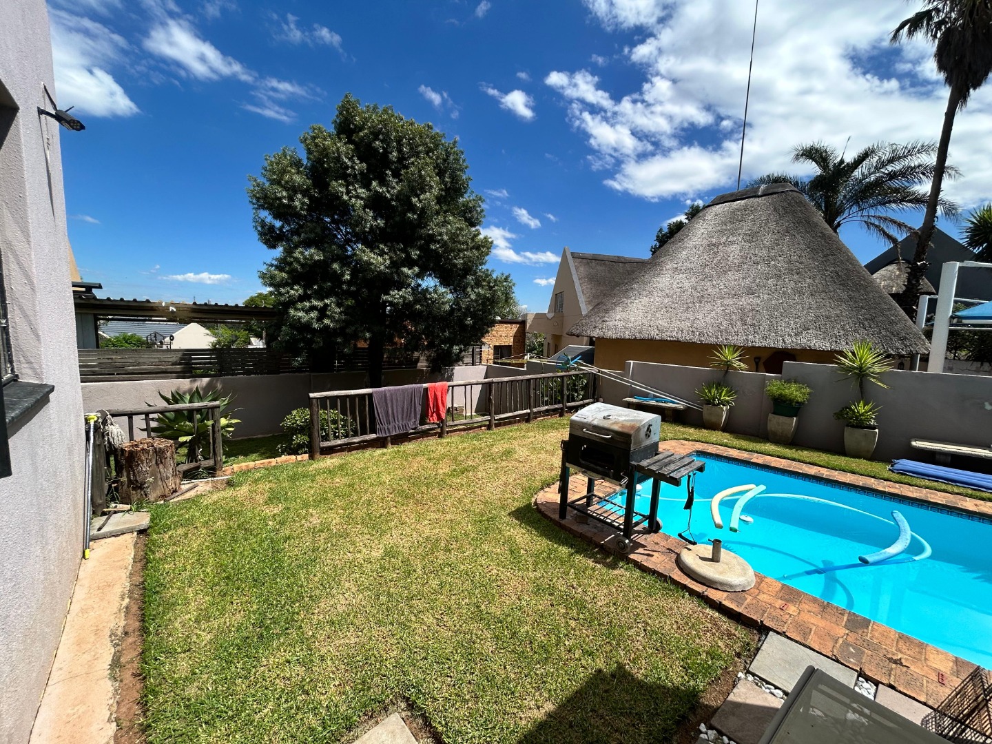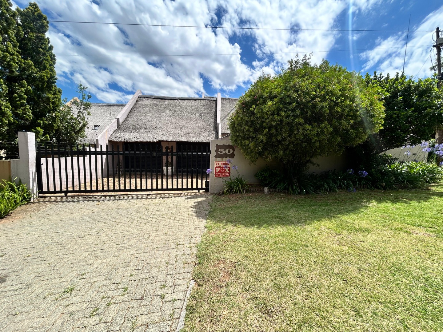 Discover this distinctive 3-bedroom, 2-bathroom residence nestled in the suburban heart of Elandshaven, Germiston. Boasting a unique thatched roof design, this property immediately captures attention with its charming kerb appeal. Secure gated access, a paved driveway, and a well-maintained garden with mature landscaping create an inviting first impression, complemented by visible 24-hour security signage for peace of mind.