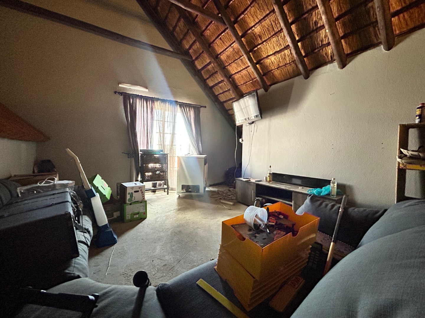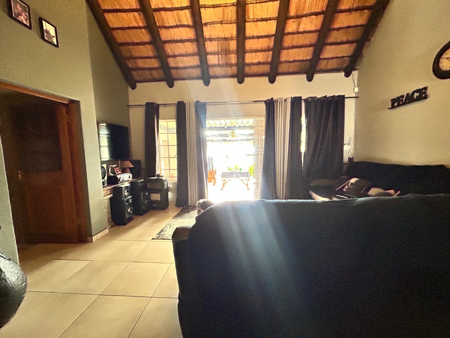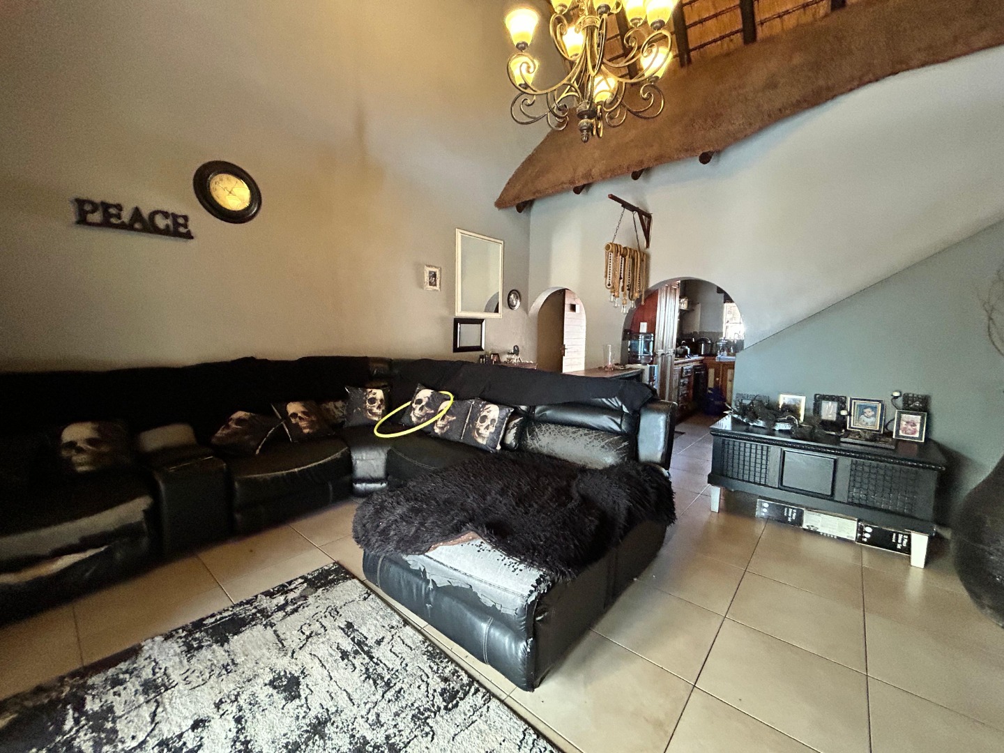 The interior unfolds into a spacious, open-plan living area, characterized by striking vaulted thatched ceilings and elegant chandeliers that add significant architectural character. Durable tiled flooring extends throughout these communal spaces, which include a dedicated lounge and dining room, offering ample room for relaxation and entertaining. Large glass doors provide excellent natural light and seamless access to the outdoor areas, enhancing the flow of the home.