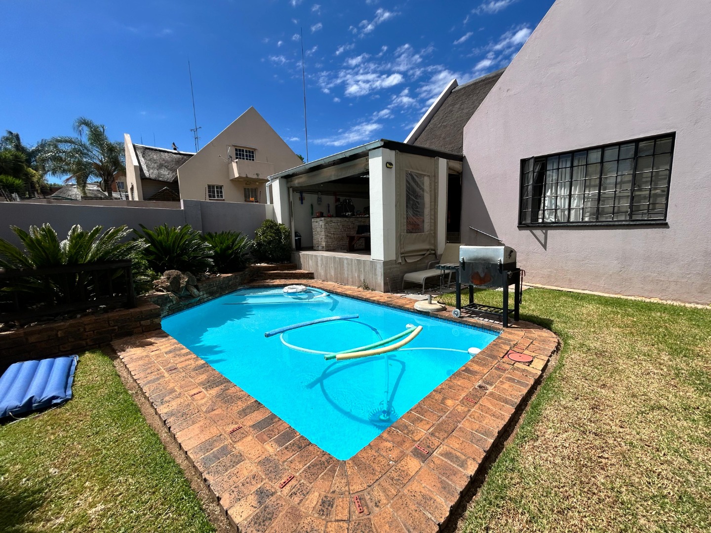 Outdoor living is a highlight, with a private pool and deck perfect for leisure and entertaining. The property also features a lapa, ideal for outdoor gatherings, and a well-maintained garden. Practical amenities include a double garage, domestic rooms, and the property is pet-friendly, making it suitable for families. Security is enhanced by a fence, access gate, and burglar bars.