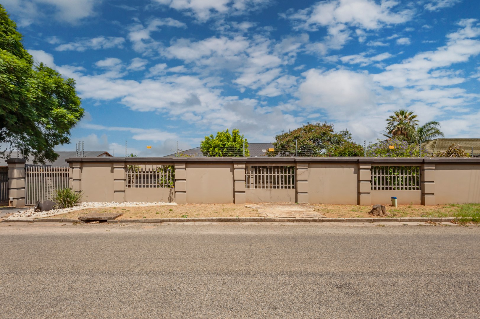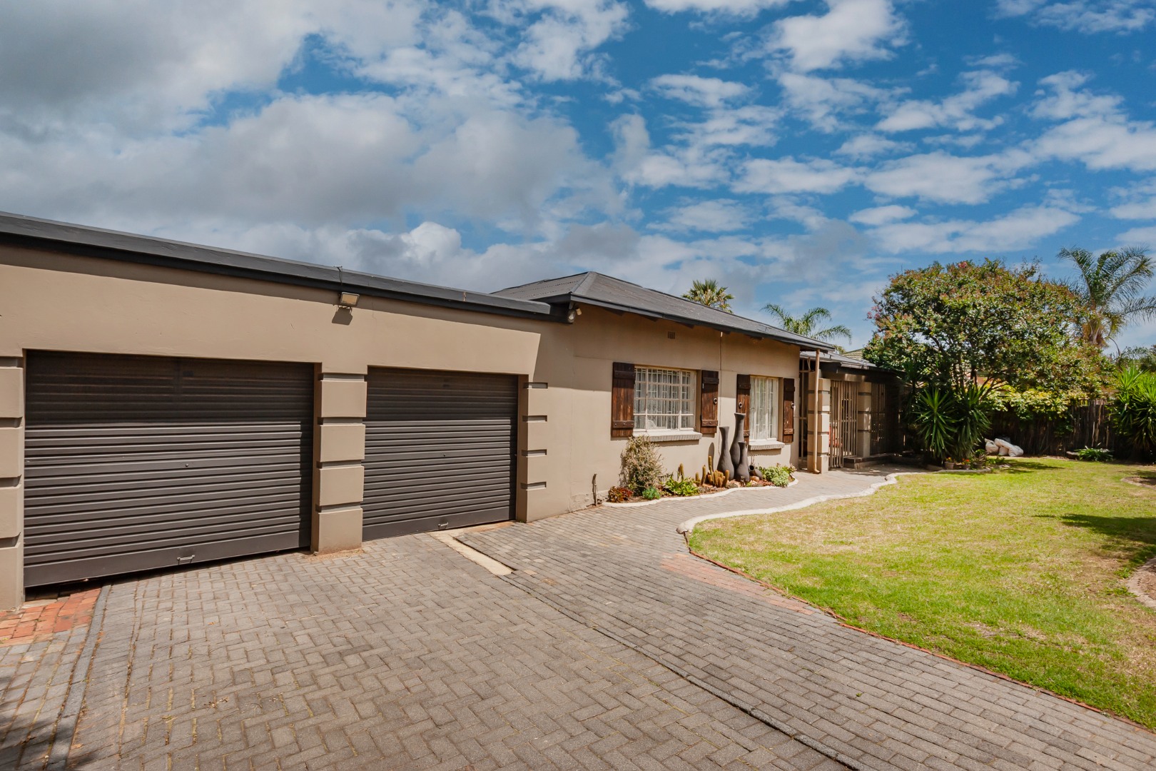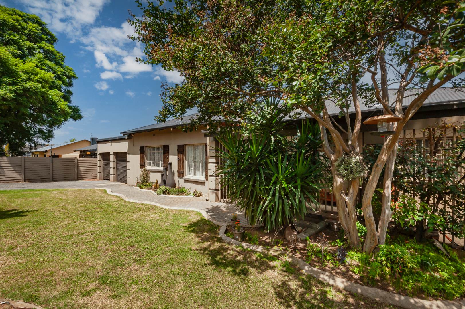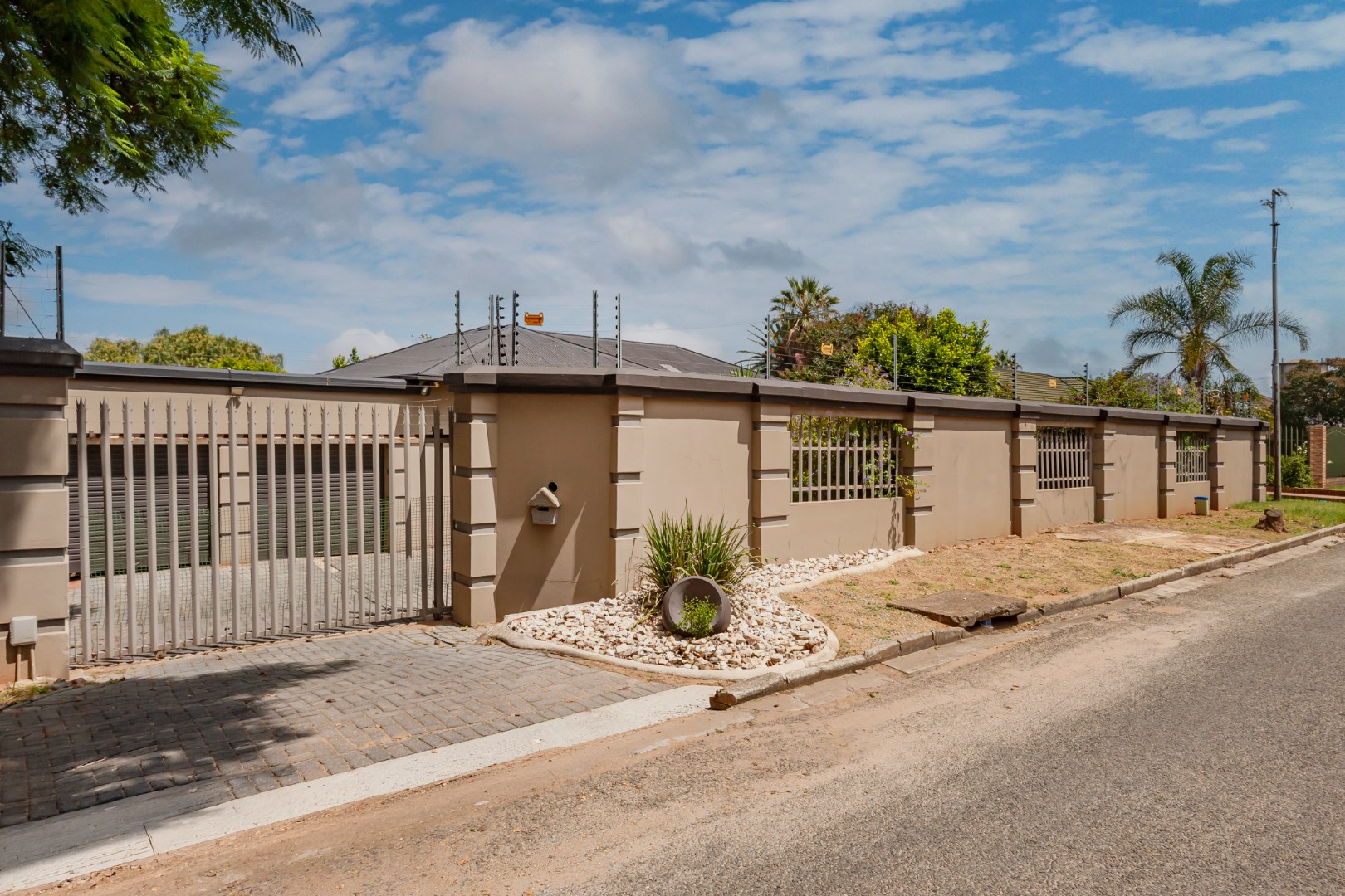 This Home Boasting excellent curb appeal. The property features a well-maintained exterior, a spacious, manicured front yard with mature trees, and a paved driveway leading to a double garage, offering ample parking for up to four vehicles. Enhanced security includes a perimeter wall, electric fencing, an access gate, and security bars on windows, complemented by classic wooden shutters.