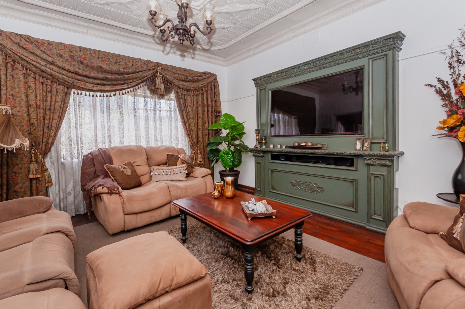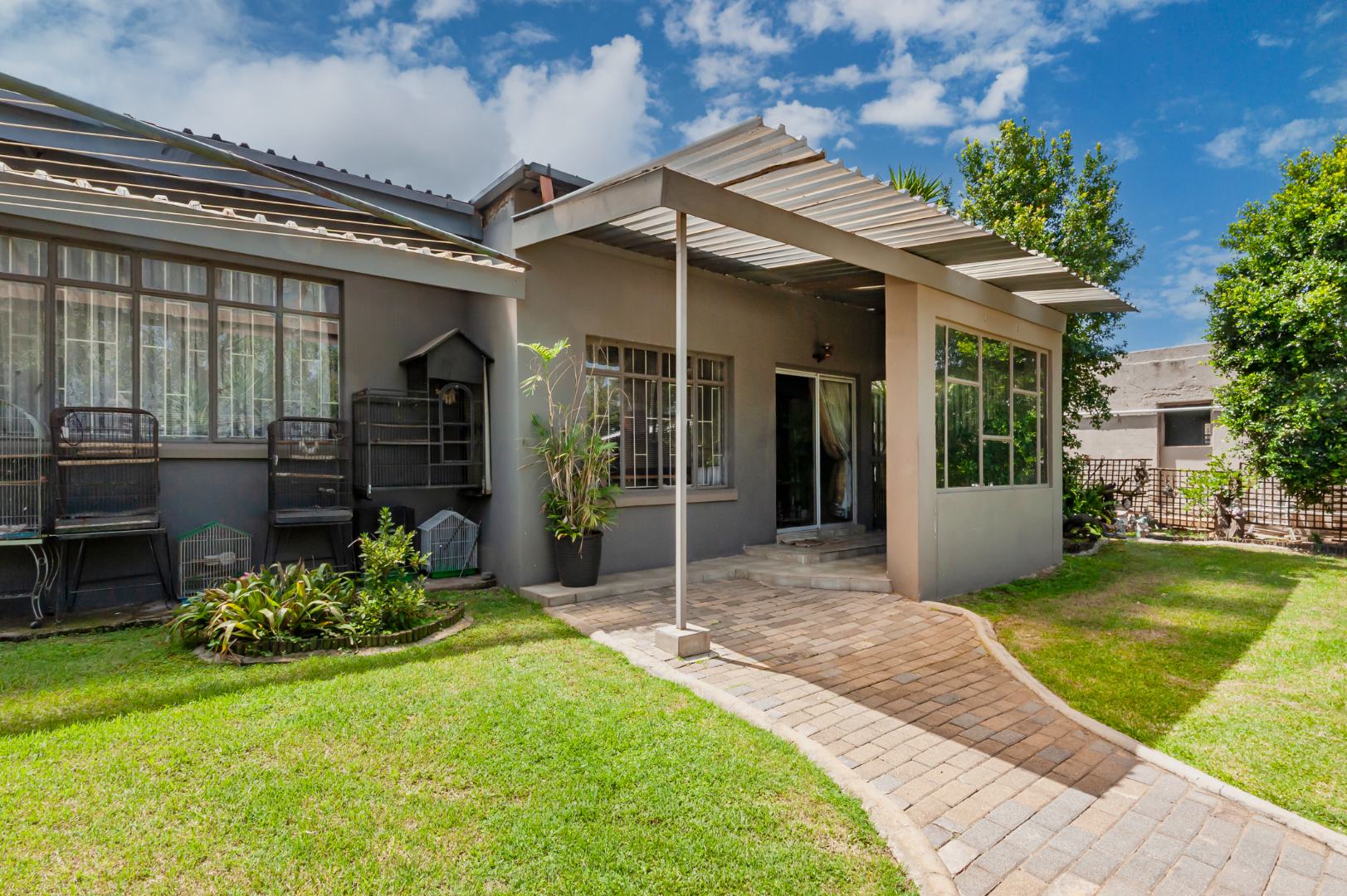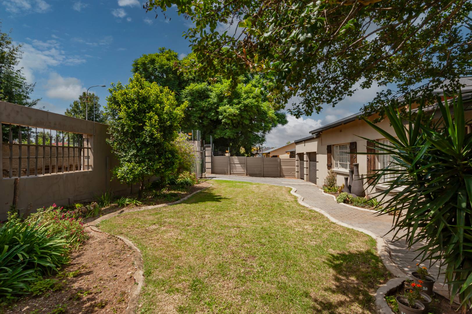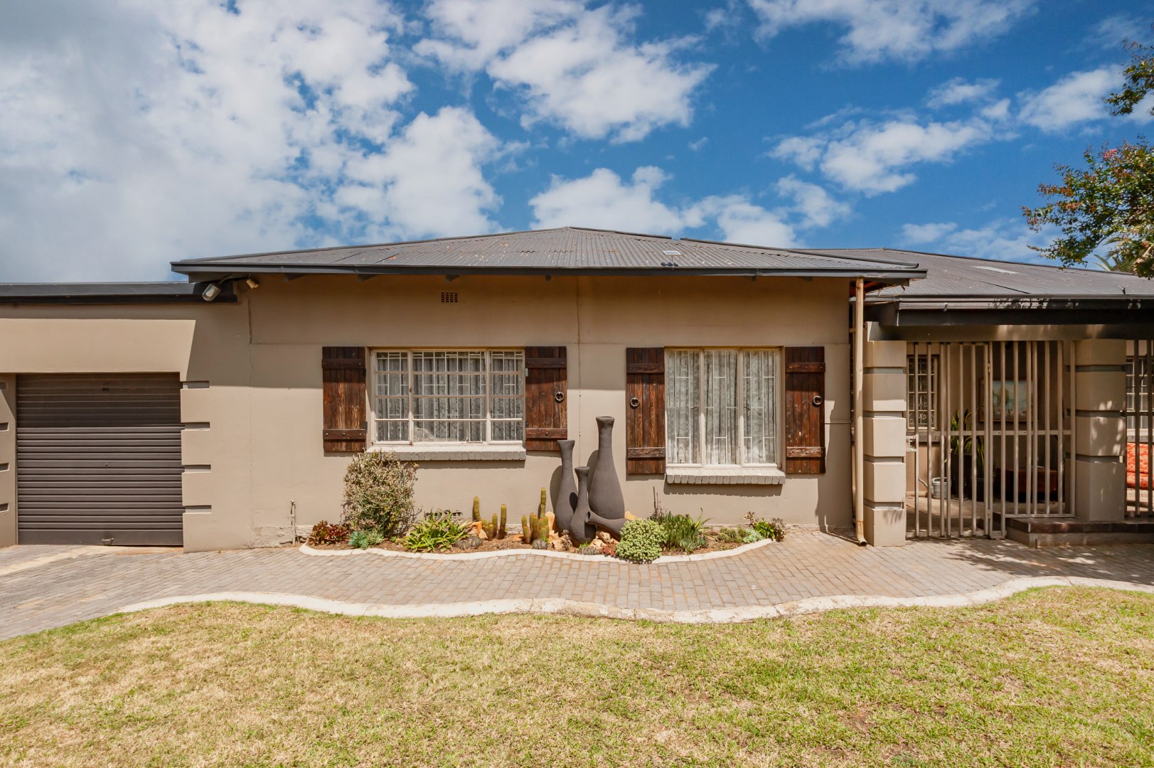 This Home Boasting excellent curb appeal. The property features a well-maintained exterior, a spacious, manicured front yard with mature trees, and a paved driveway leading to a double garage, offering ample parking for up to four vehicles. Enhanced security includes a perimeter wall, electric fencing, an access gate, and security bars on windows, complemented by classic wooden shutters.