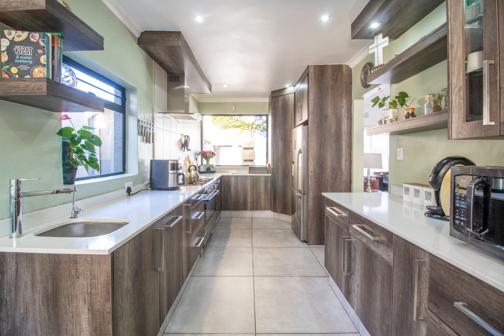Discover a realm of refined living within this expansive suburban residence, boasting a generous 635 sqm under roof. The luminous open-plan living and dining areas, adorned with elegant laminate wood flooring, invite seamless entertaining and sophisticated daily comfort. A captivating fireplace anchors the main lounge, offering a focal point for intimate gatherings. The heart of this home is its contemporary kitchen, a culinary haven featuring sleek wood-look cabinetry, pristine light countertops, and a suite of integrated stainless steel appliances. Dual sink areas and abundant storage ensure both unparalleled functionality and sophisticated design, bathed in natural light from multiple windows.