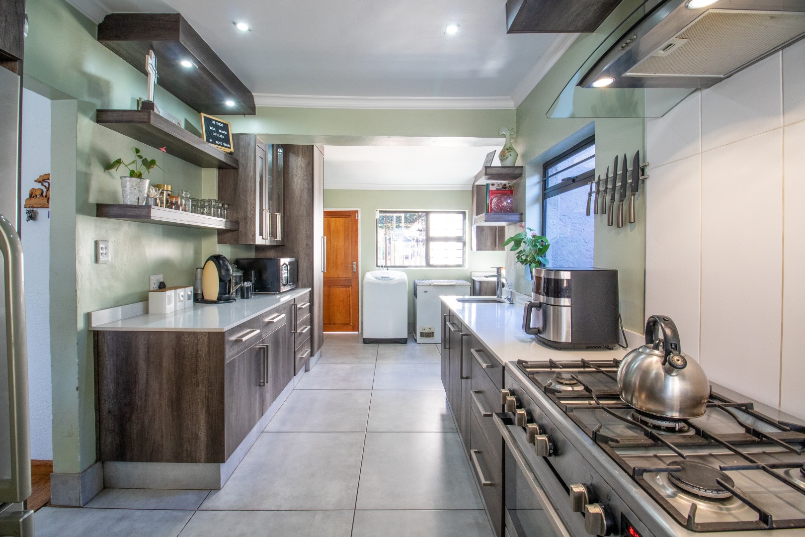Discover a realm of refined living within this expansive suburban residence, boasting a generous 635 sqm under roof. The luminous open-plan living and dining areas, adorned with elegant laminate wood flooring, invite seamless entertaining and sophisticated daily comfort. A captivating fireplace anchors the main lounge, offering a focal point for intimate gatherings. The heart of this home is its contemporary kitchen, a culinary haven featuring sleek wood-look cabinetry, pristine light countertops, and a suite of integrated stainless steel appliances. Dual sink areas and abundant storage ensure both unparalleled functionality and sophisticated design, bathed in natural light from multiple windows.
