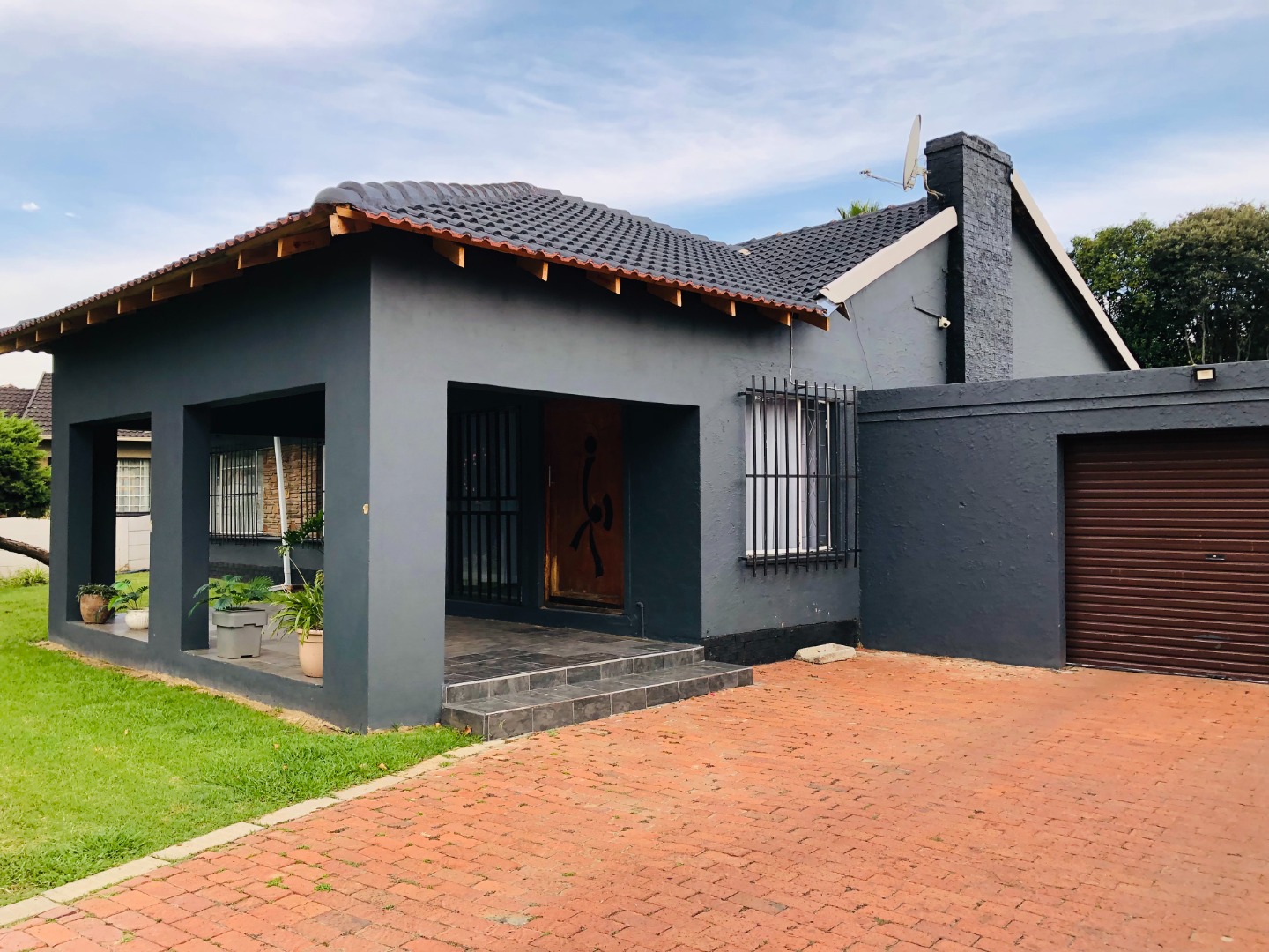 Discover this inviting 3-bedroom, 2-bathroom family home located in the suburban heart of Elspark, Germiston. Boasting a modern dark grey exterior with attractive stone accents, the property immediately impresses with its well-maintained front lawn and a welcoming covered porch featuring a distinctive carved wooden door. An attached single garage and a paved driveway offering six additional parking spaces enhance convenience and kerb appeal.