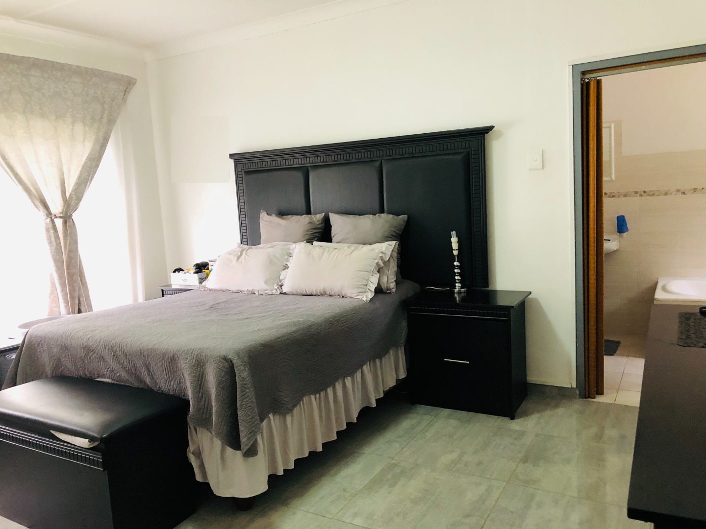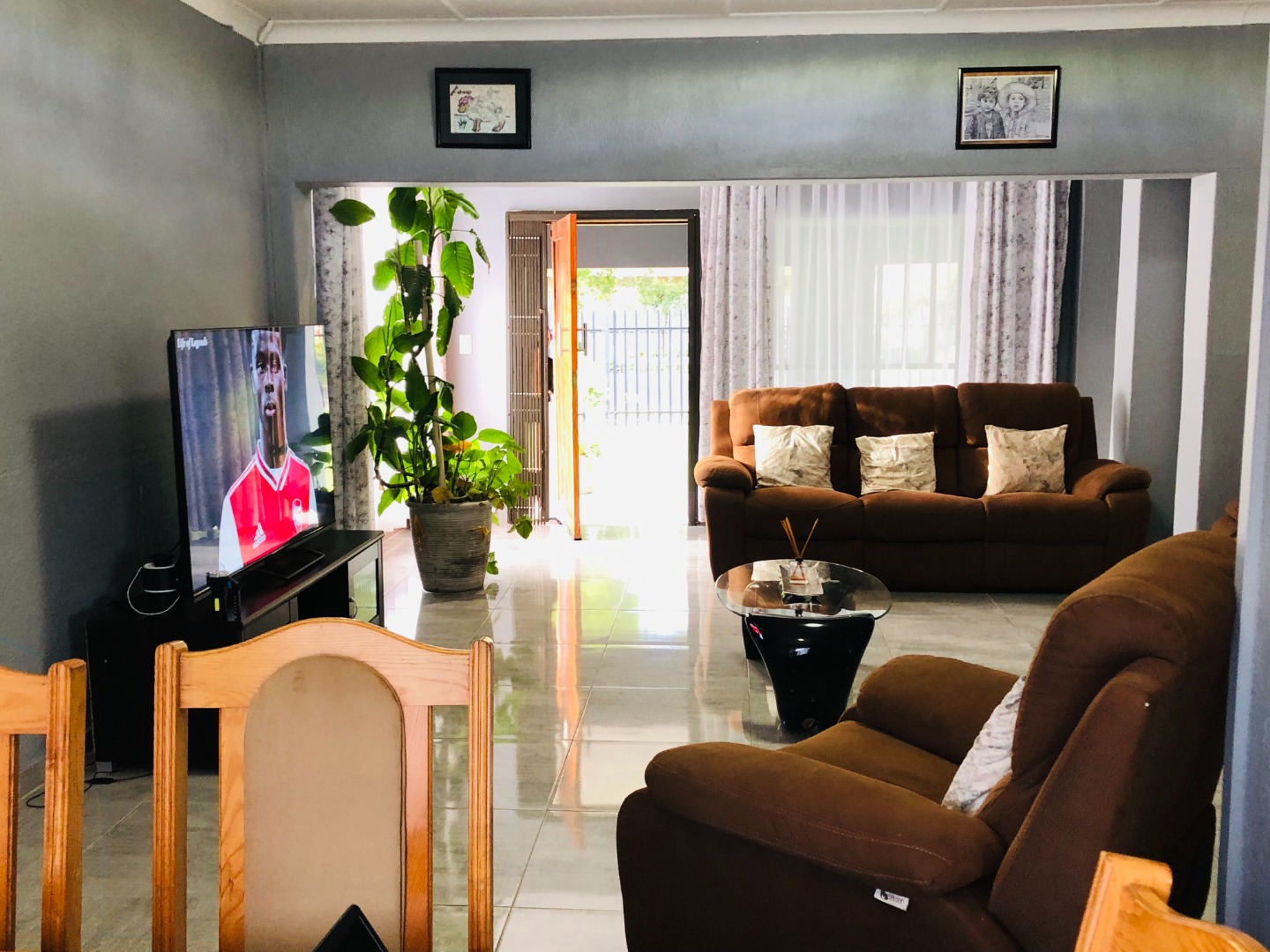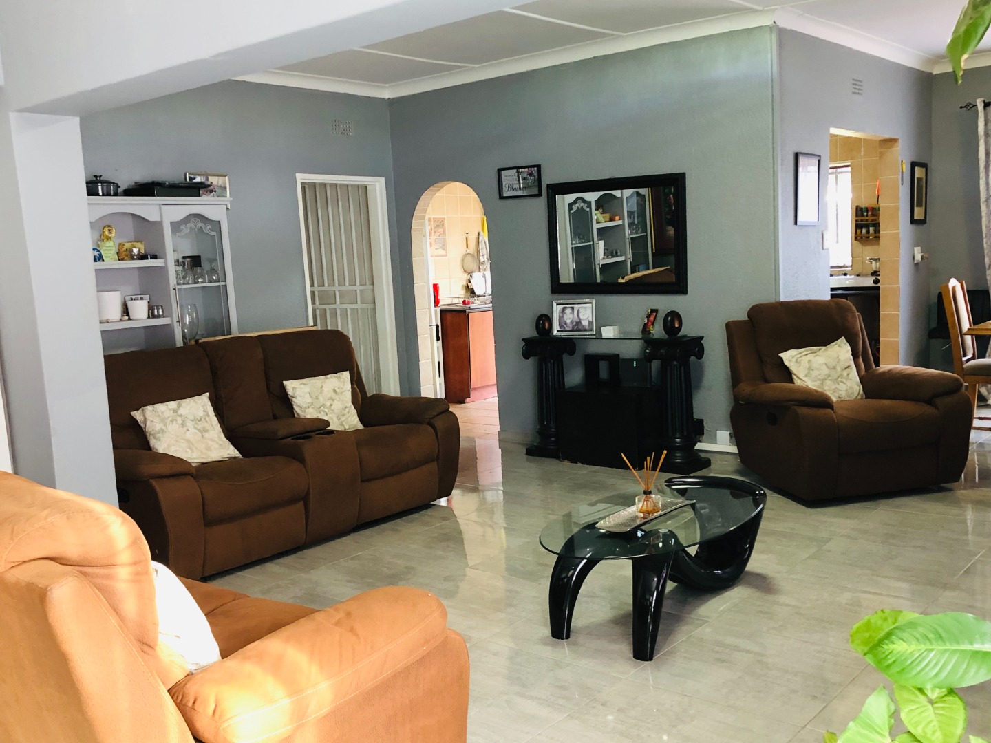 Hosts an open-plan layout designed for comfortable living. The spacious lounge and dining areas are adorned with light tiled flooring and neutral grey walls, the residence features three well-proportioned bedrooms, ensuring private retreats for all family members. There are two bathrooms, including a private ensuite, alongside a separate guest toilet for added practicality. For peace of mind, the property is totally walled and secured with security gates and burglar bars.