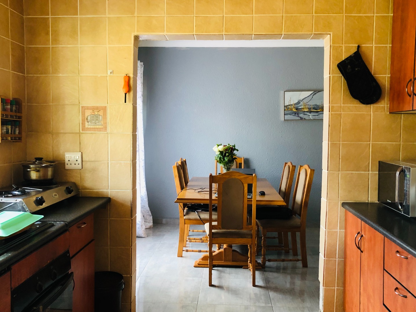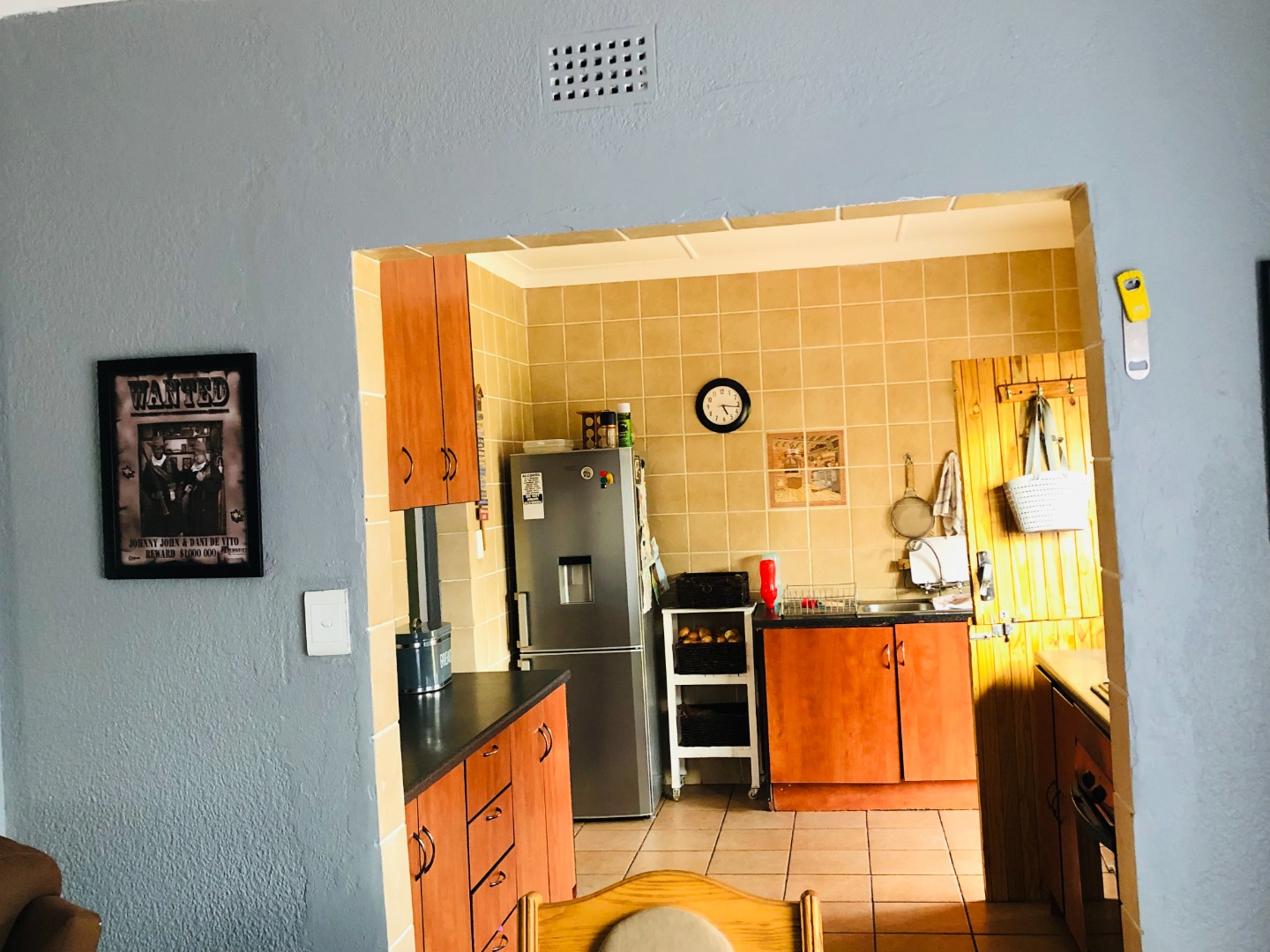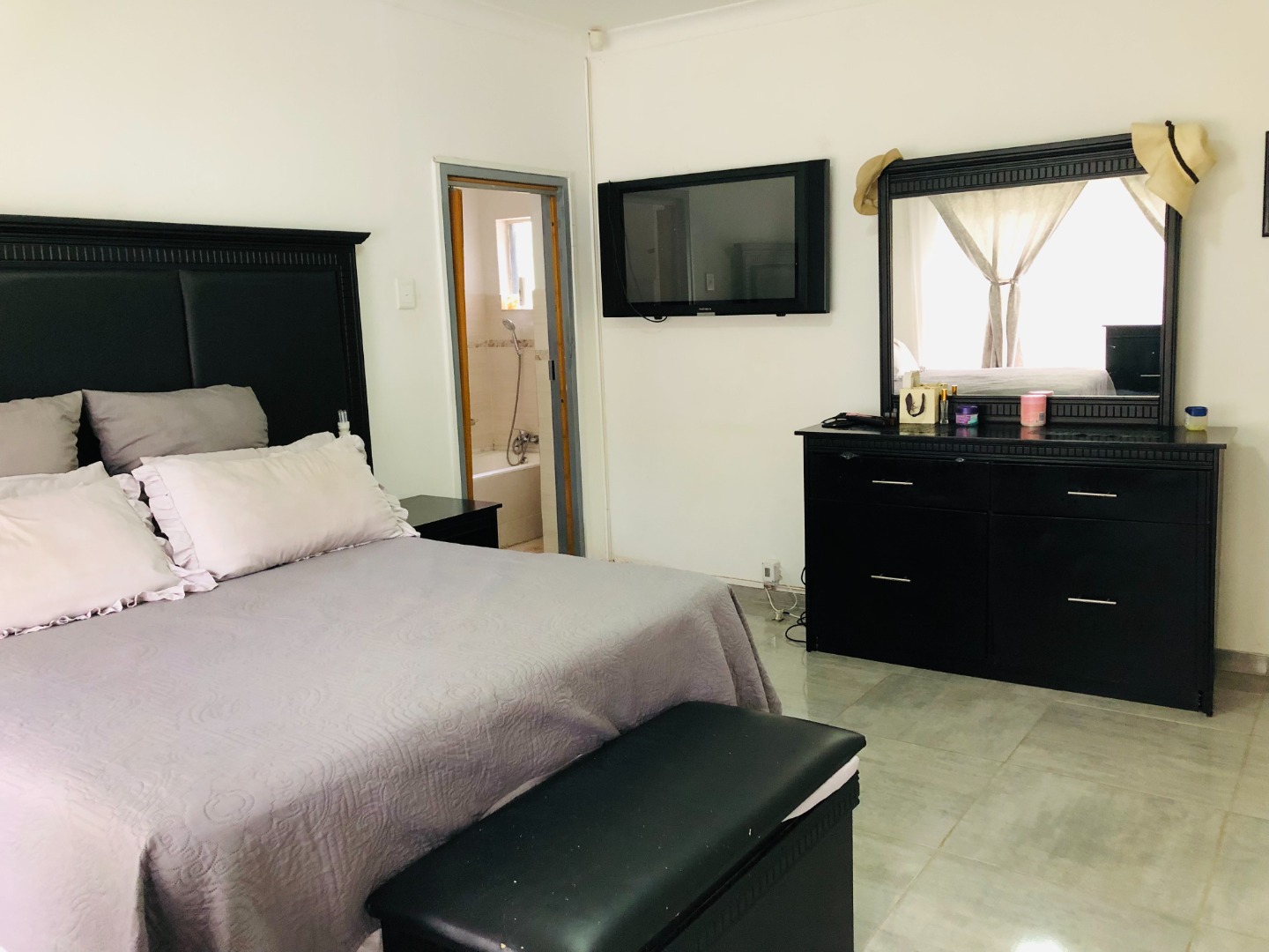 Hosts an open-plan layout designed for comfortable living. The spacious lounge and dining areas are adorned with light tiled flooring and neutral grey walls, the residence features three well-proportioned bedrooms, ensuring private retreats for all family members. There are two bathrooms, including a private ensuite, alongside a separate guest toilet for added practicality. For peace of mind, the property is totally walled and secured with security gates and burglar bars.
