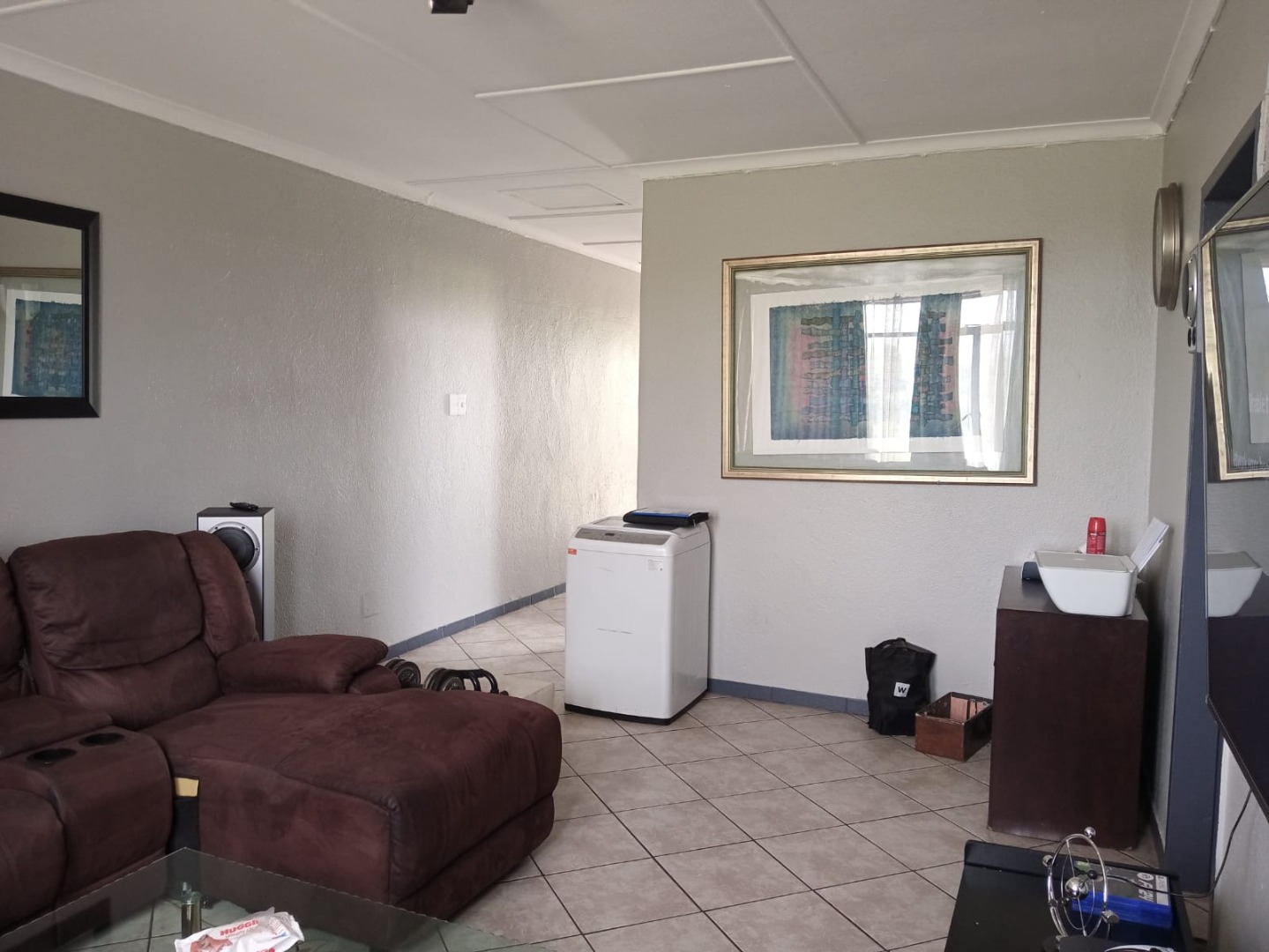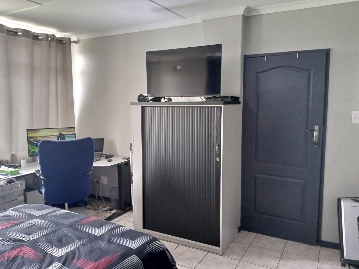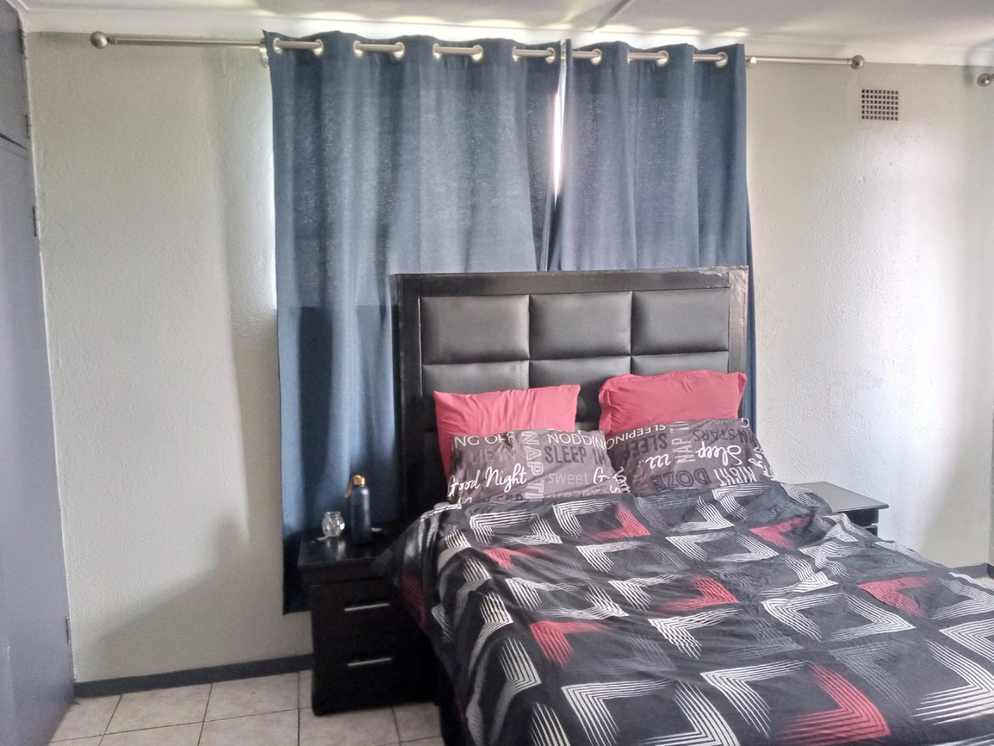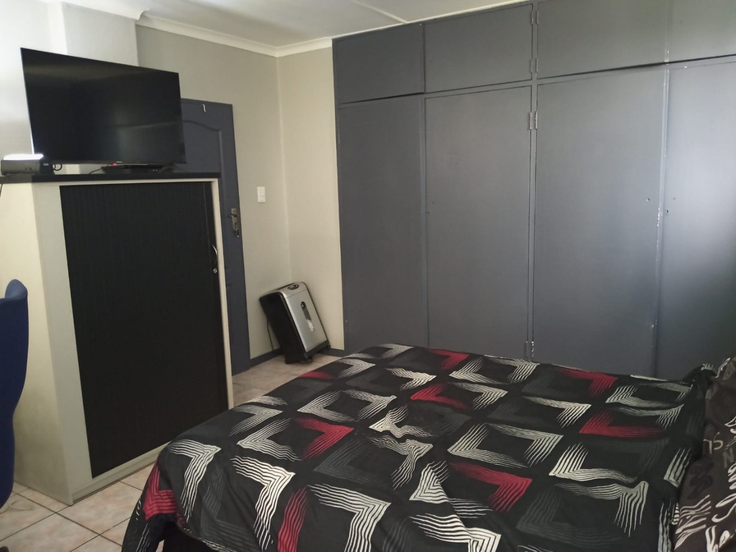 - Spacious bedroom with built-in cupboards and an additional storage cupboard.