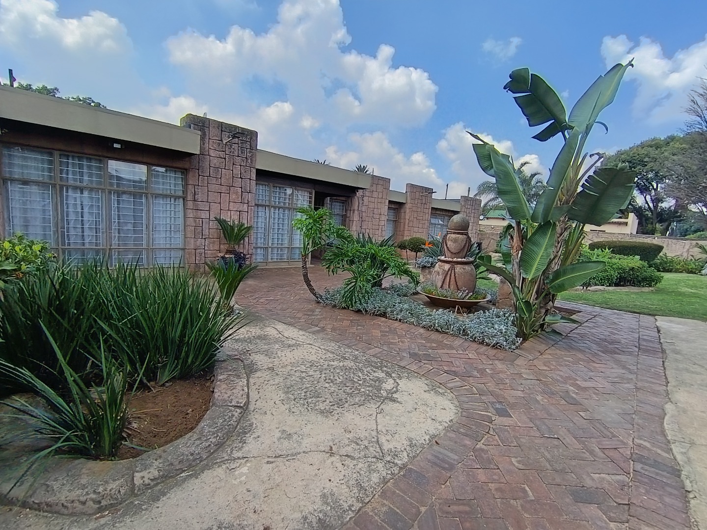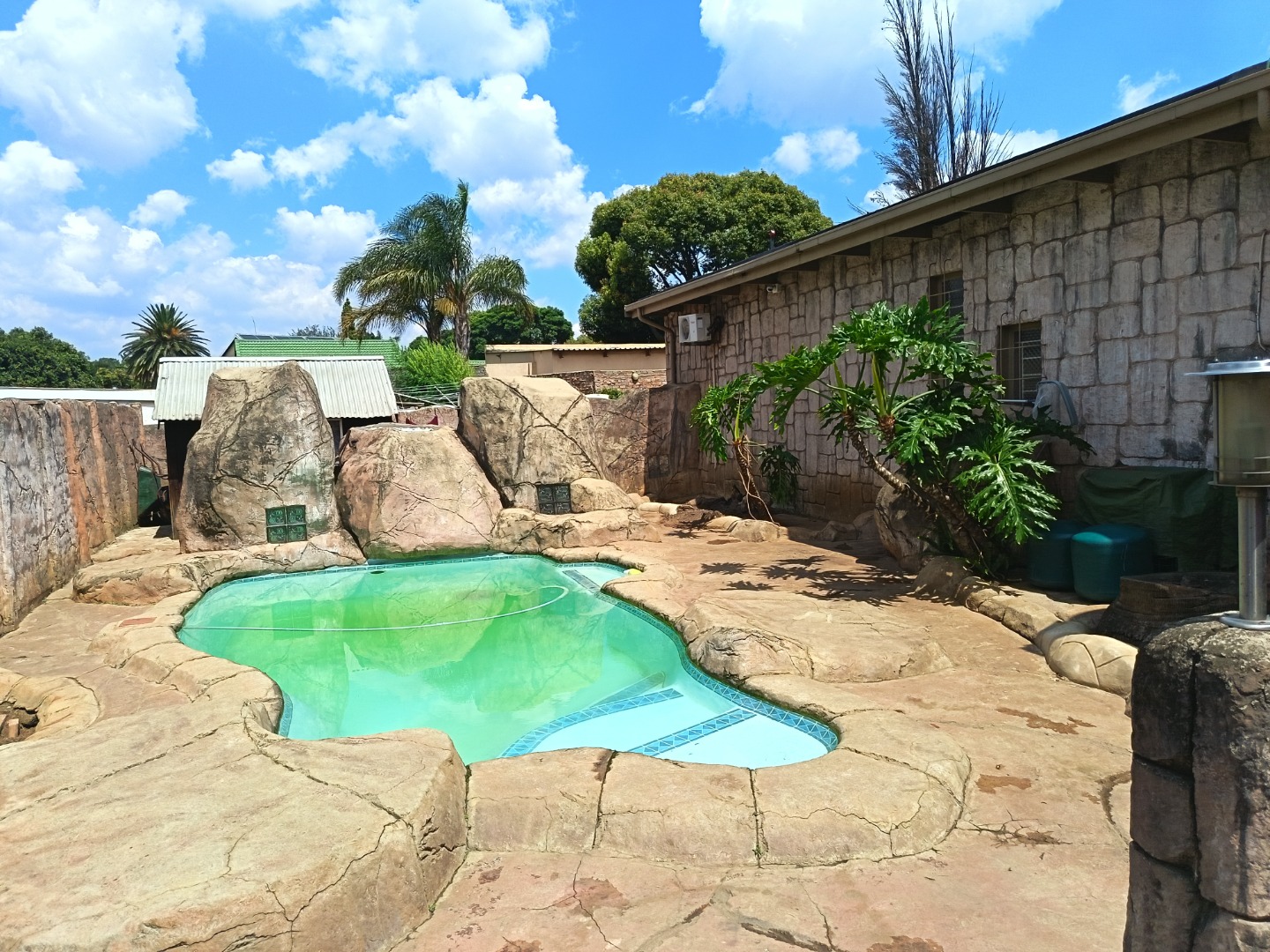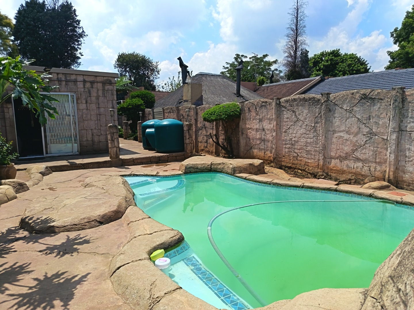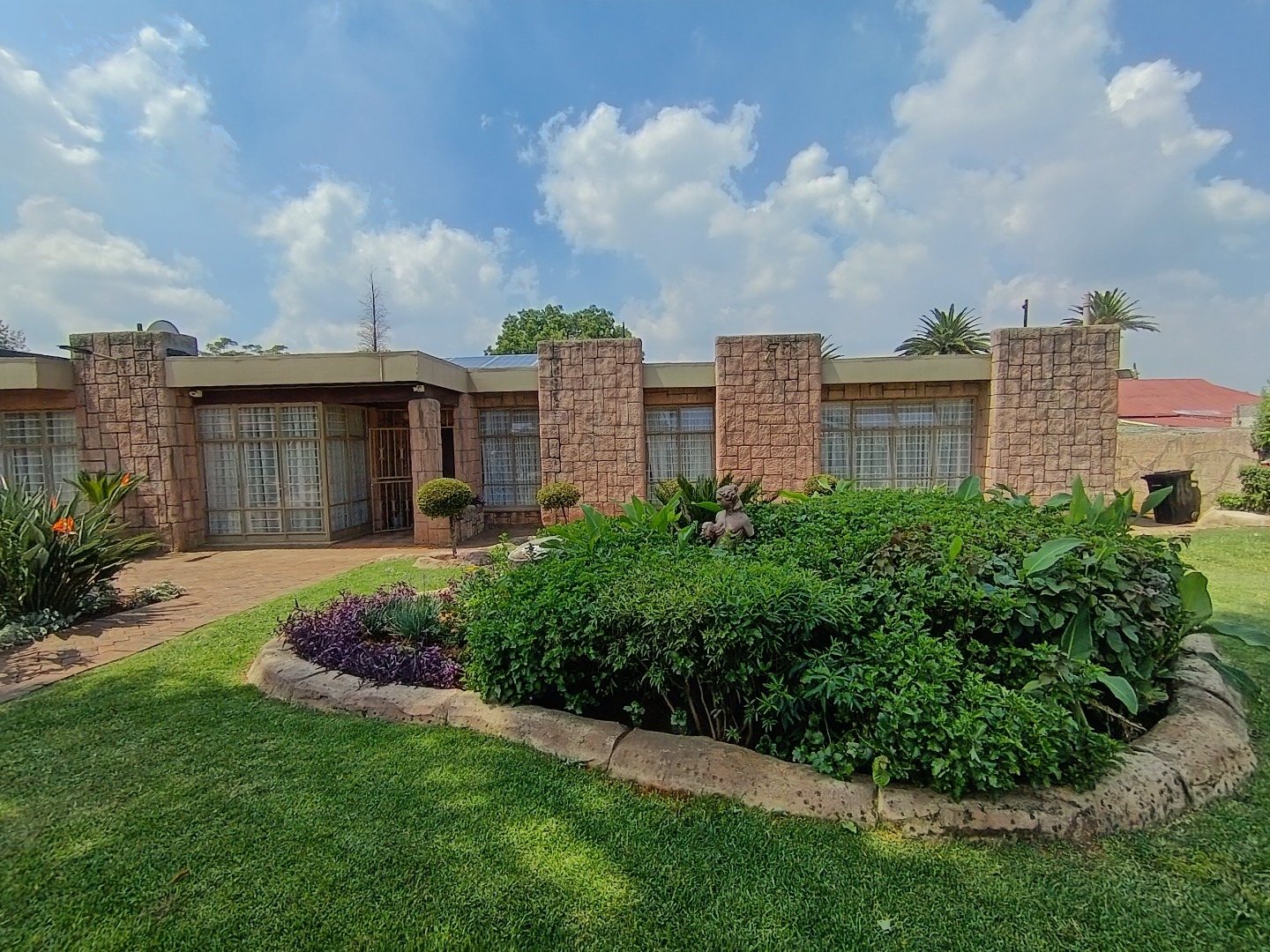 Discover this charming residential property in Hazeldene, Germiston, offering comfort and security. The home features an attractive stone-clad exterior, a lush, well-maintained garden with diverse planting, and paved pathways. Visible security bars on windows and a main entrance security gate provide peace of mind. Inside, a functional and spacious kitchen awaits, boasting dark cabinetry, granite-look countertops, a gas range, double sink, and a practical breakfast bar with a pantry. An open pass-through connects to an adjacent room, enhancing flow. The property includes two comfortable lounges, a dedicated dining room, and a family TV room, offering ample space for relaxation and entertainment. Accommodation comprises three generously sized bedrooms, one with an en-suite bathroom, totaling three bathrooms. Each bedroom provides built-in storage and natural light, creating inviting personal retreats. Set on a substantial 991 sqm erf, the outdoor area is designed for enjoyment. A refreshing swimming pool, lapa, and built-in braai are perfect for entertaining. The well-kept garden, two garages, and four additional parking spaces accommodate multiple vehicles. Pets are allowed, making this an ideal family home. Security is further enhanced by an access gate, and a battery inverter provides essential power backup. Visible solar panels on the roof suggest potential for energy efficiency. Located in the established suburb of Hazeldene, Germiston, this property offers convenient access to local amenities and transport routes, making it a desirable address in South Africa. Key Features: * 3 Bedrooms, 3 Bathrooms (1 En-suite) * Spacious Kitchen with Gas Range & Pantry * 2 Lounges, Dining Room, Family TV Room * Swimming Pool, Lapa & Built-in Braai * Lush Garden on 991 sqm Erf * 2 Garages, 4 Parking Spaces * Battery Inverter & Visible Solar Panels * Enhanced Security Features * Pets Allowed
