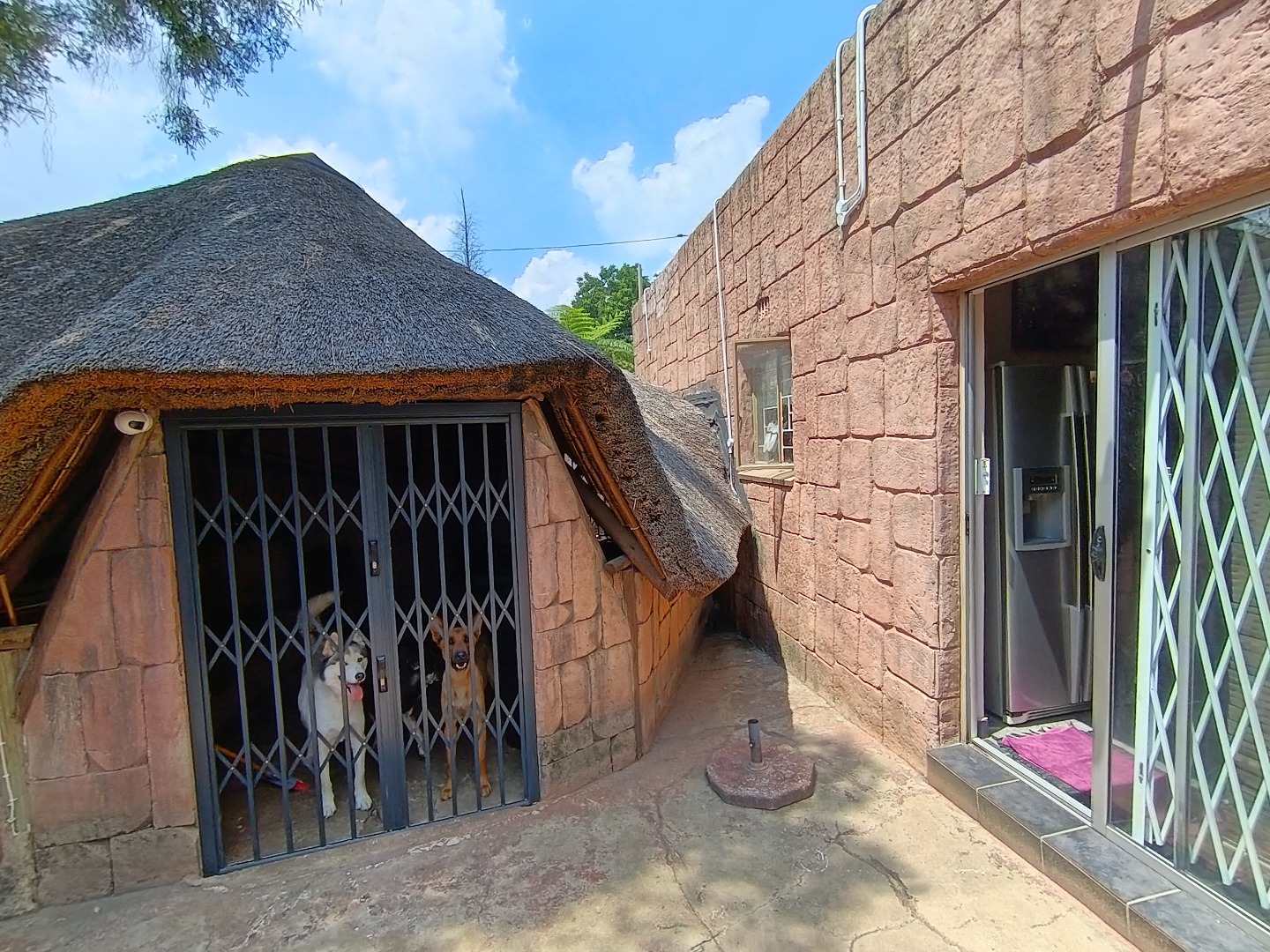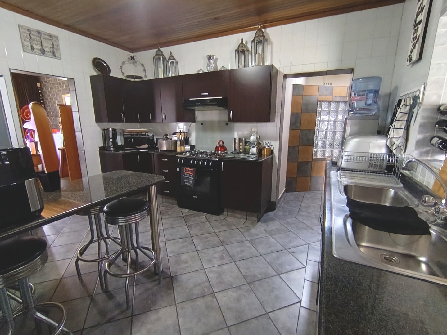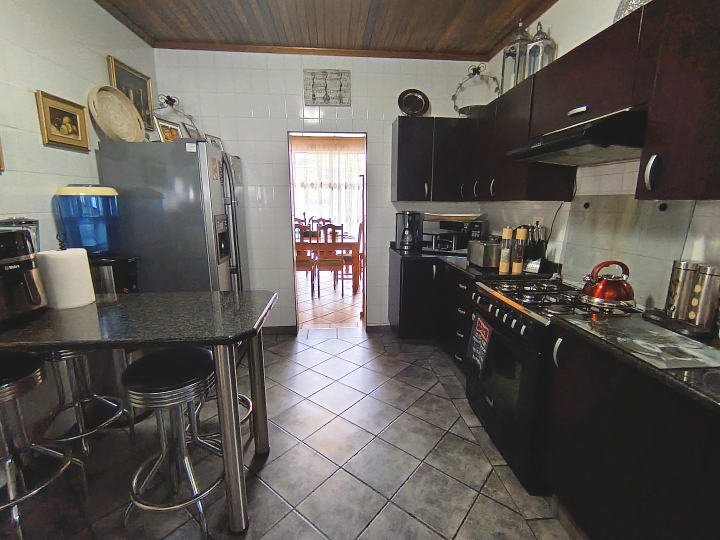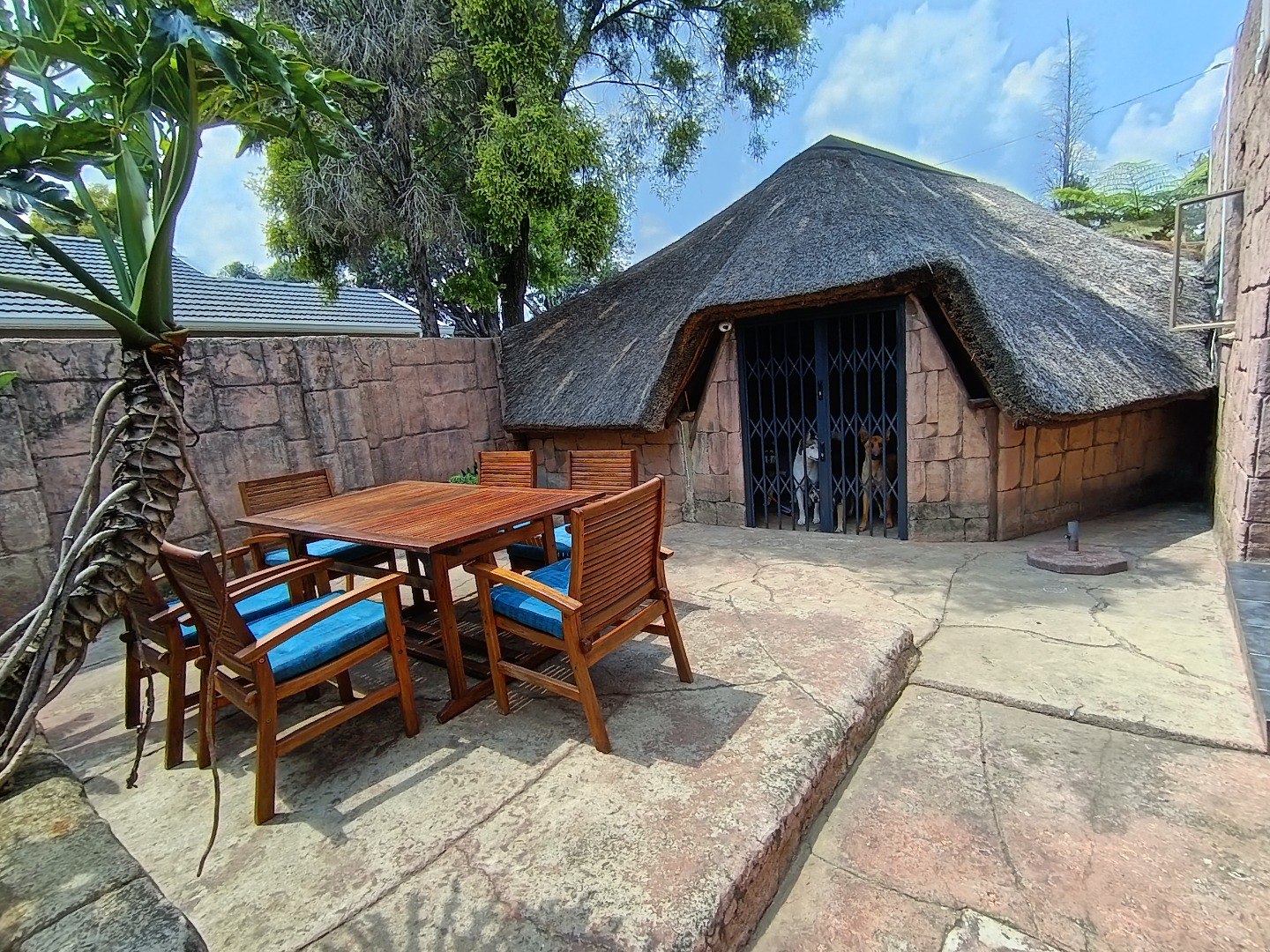 Discover this charming residential property in Hazeldene, Germiston, offering comfort and security. The home features an attractive stone-clad exterior, a lush, well-maintained garden with diverse planting, and paved pathways. Visible security bars on windows and a main entrance security gate provide peace of mind. Inside, a functional and spacious kitchen awaits, boasting dark cabinetry, granite-look countertops, a gas range, double sink, and a practical breakfast bar with a pantry. An open pass-through connects to an adjacent room, enhancing flow. The property includes two comfortable lounges, a dedicated dining room, and a family TV room, offering ample space for relaxation and entertainment. Accommodation comprises three generously sized bedrooms, one with an en-suite bathroom, totaling three bathrooms. Each bedroom provides built-in storage and natural light, creating inviting personal retreats. Set on a substantial 991 sqm erf, the outdoor area is designed for enjoyment. A refreshing swimming pool, lapa, and built-in braai are perfect for entertaining. The well-kept garden, two garages, and four additional parking spaces accommodate multiple vehicles. Pets are allowed, making this an ideal family home. Security is further enhanced by an access gate, and a battery inverter provides essential power backup. Visible solar panels on the roof suggest potential for energy efficiency. Located in the established suburb of Hazeldene, Germiston, this property offers convenient access to local amenities and transport routes, making it a desirable address in South Africa. Key Features: * 3 Bedrooms, 3 Bathrooms (1 En-suite) * Spacious Kitchen with Gas Range & Pantry * 2 Lounges, Dining Room, Family TV Room * Swimming Pool, Lapa & Built-in Braai * Lush Garden on 991 sqm Erf * 2 Garages, 4 Parking Spaces * Battery Inverter & Visible Solar Panels * Enhanced Security Features * Pets Allowed