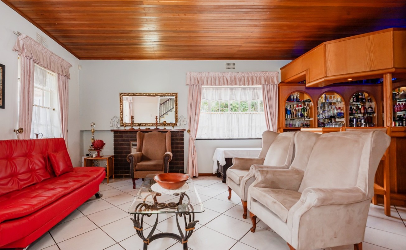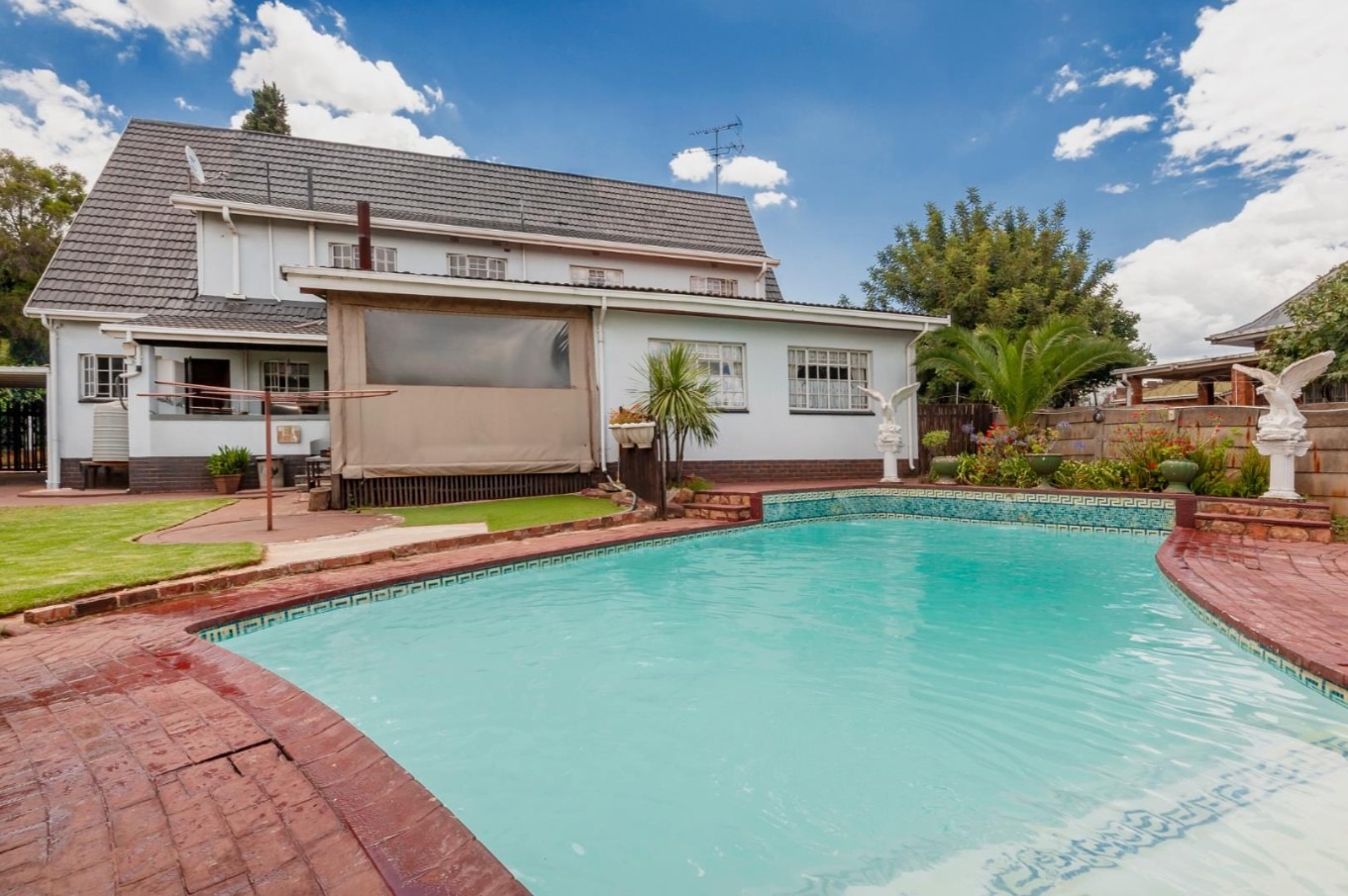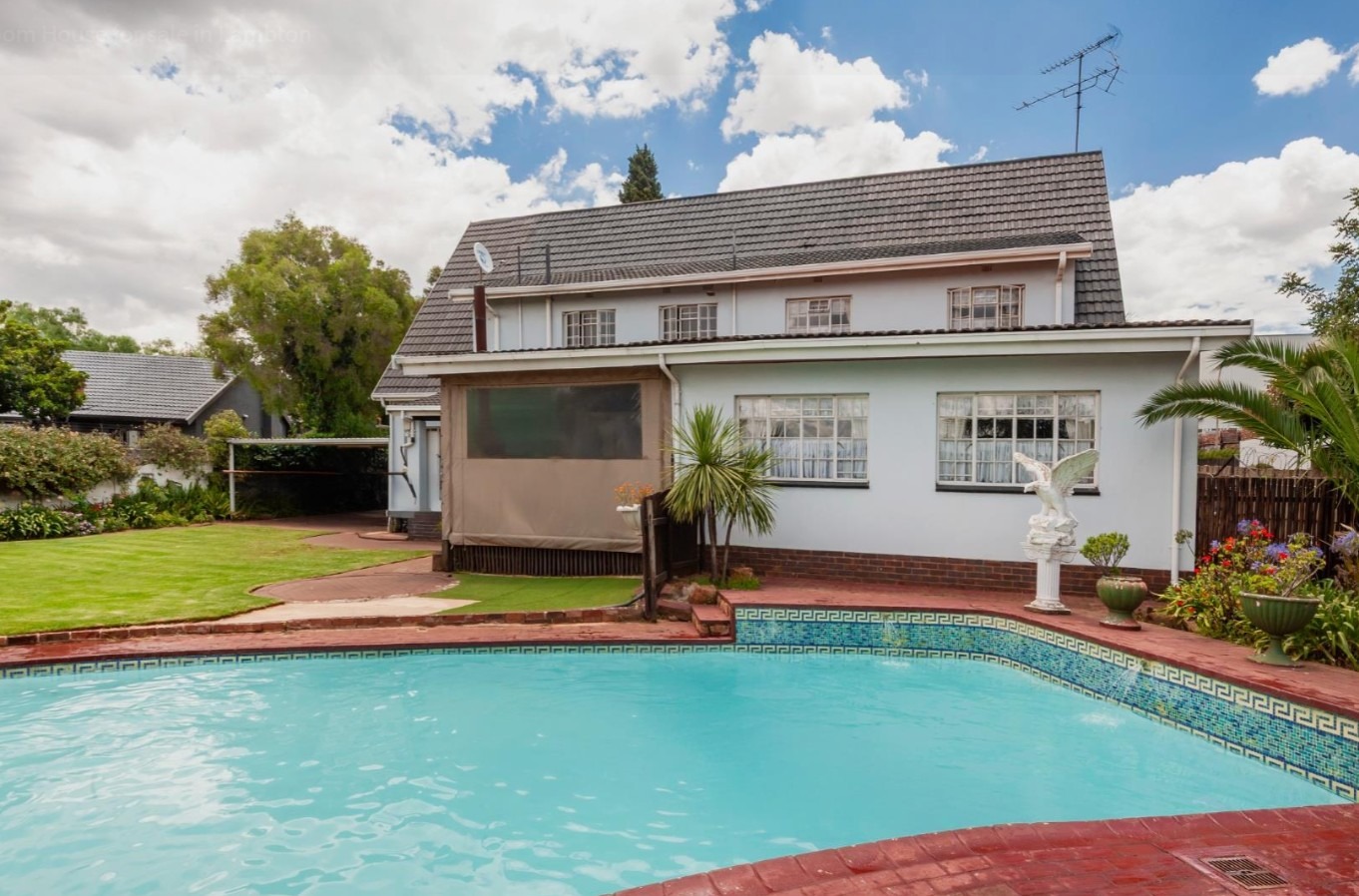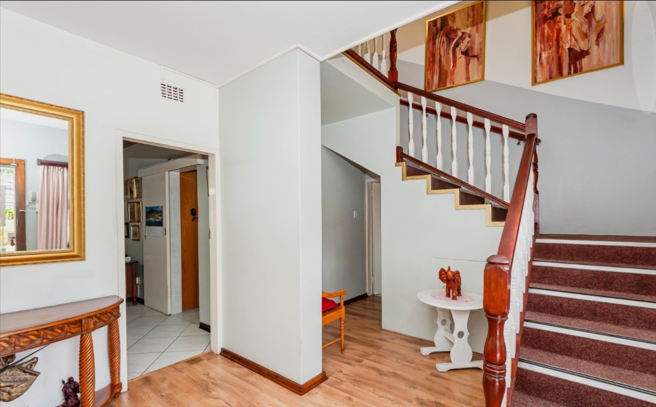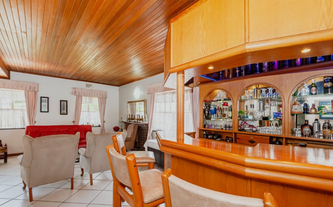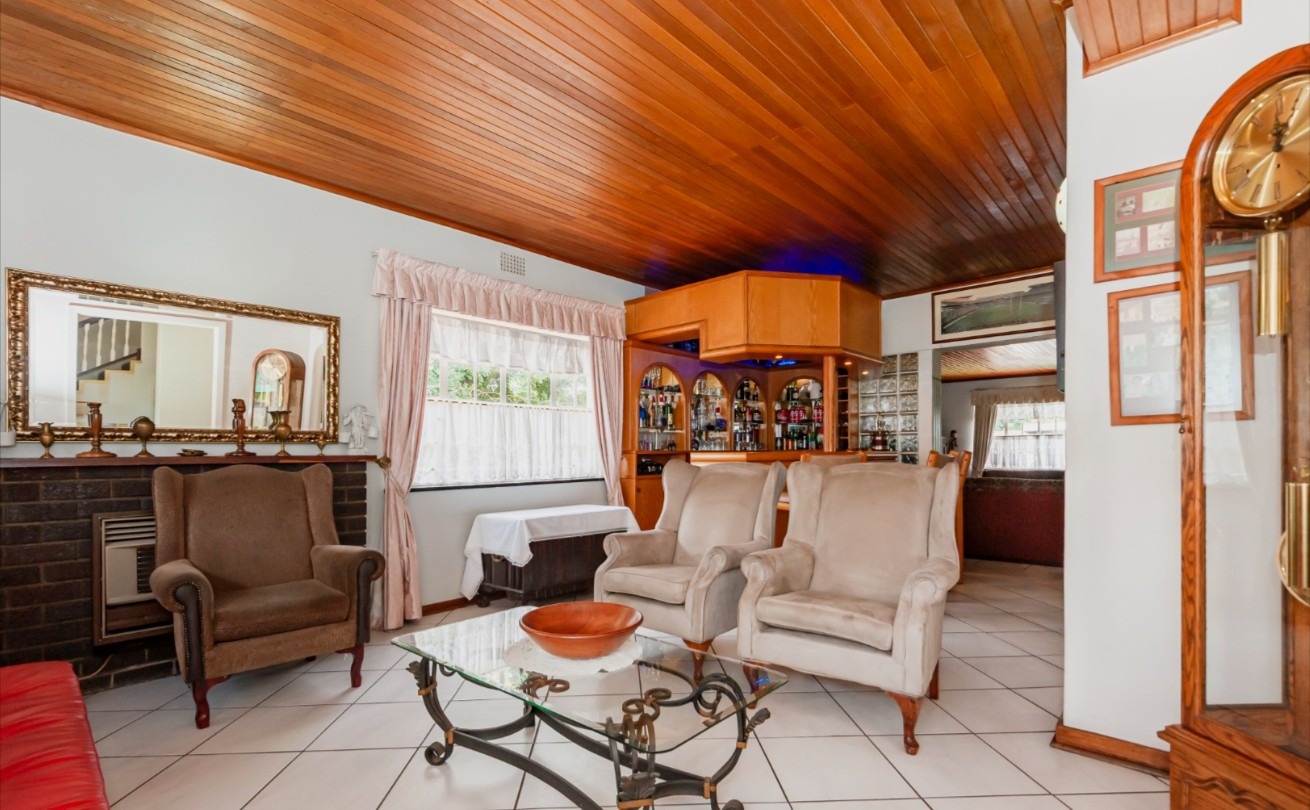 The main residence features sun filled living and dining areas, a spacious family/TV room, and a charming wooden bar for entertaining. The kitchen provides ample cupboard and counter space, while upstairs you’ll find generously sized bedrooms with laminated flooring and built-in cupboards. The main suite includes its own ensuite, and an enclosed patio with built-in braai overlooks the lush back garden and sparkling pool—perfect for relaxed gatherings.