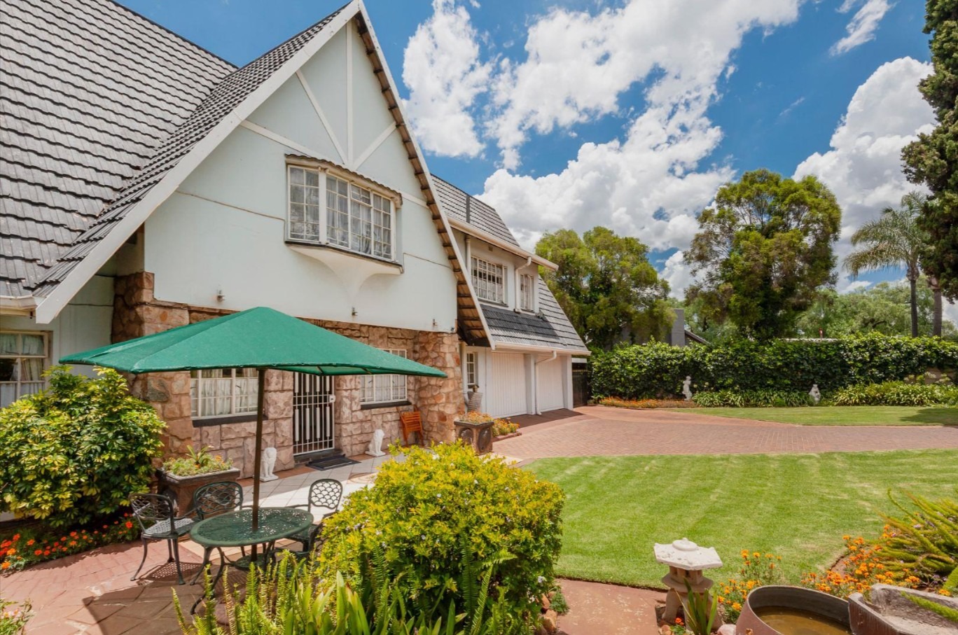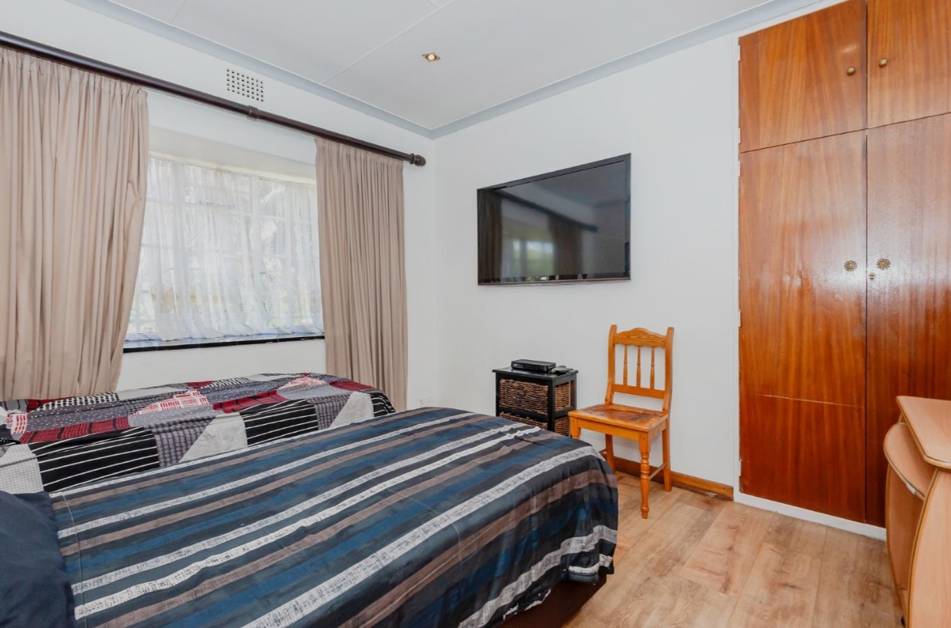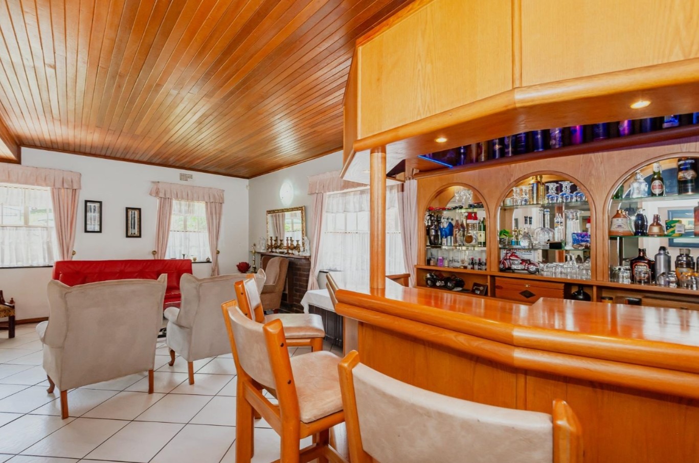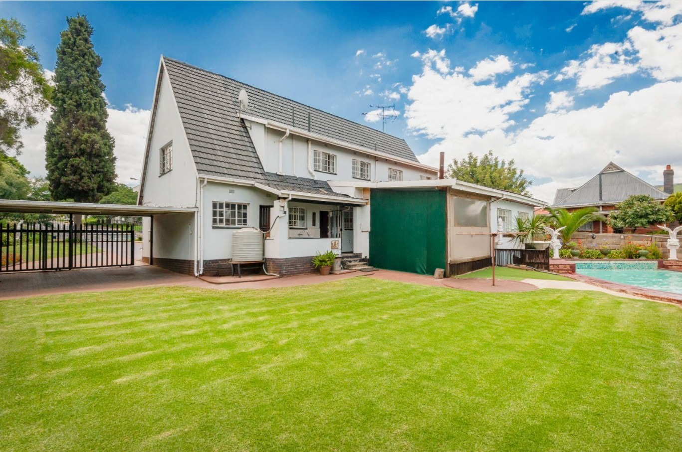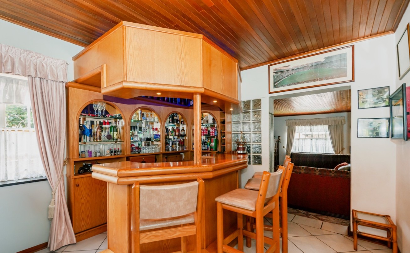 The main residence features sun filled living and dining areas, a spacious family/TV room, and a charming wooden bar for entertaining. The kitchen provides ample cupboard and counter space, while upstairs you’ll find generously sized bedrooms with laminated flooring and built-in cupboards. The main suite includes its own ensuite, and an enclosed patio with built-in braai overlooks the lush back garden and sparkling pool—perfect for relaxed gatherings.