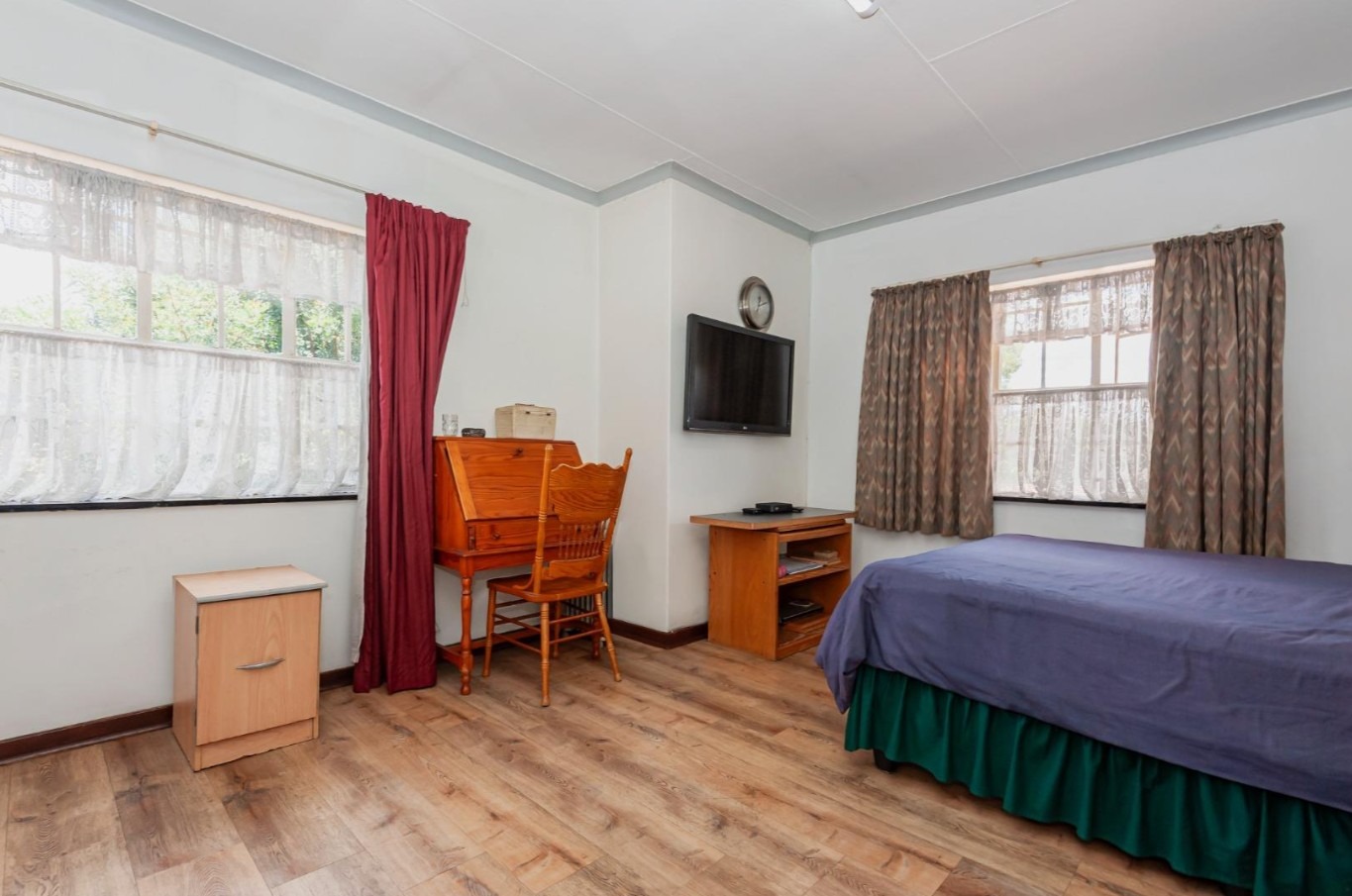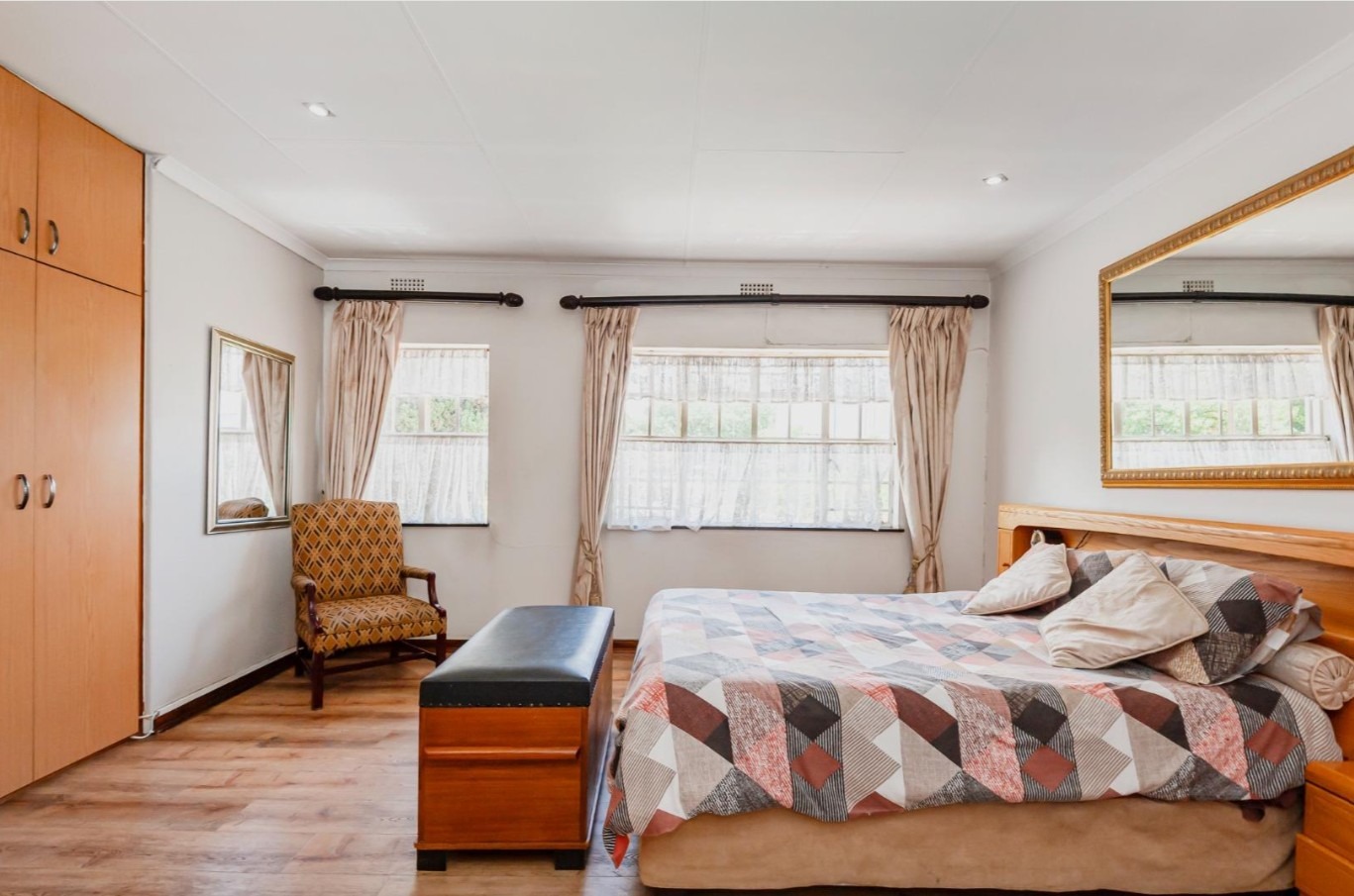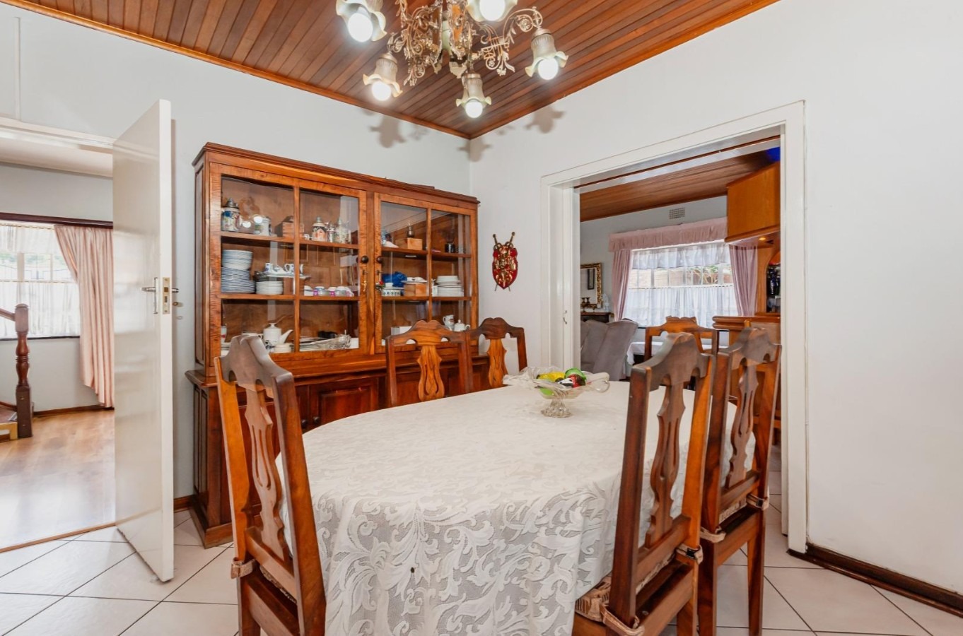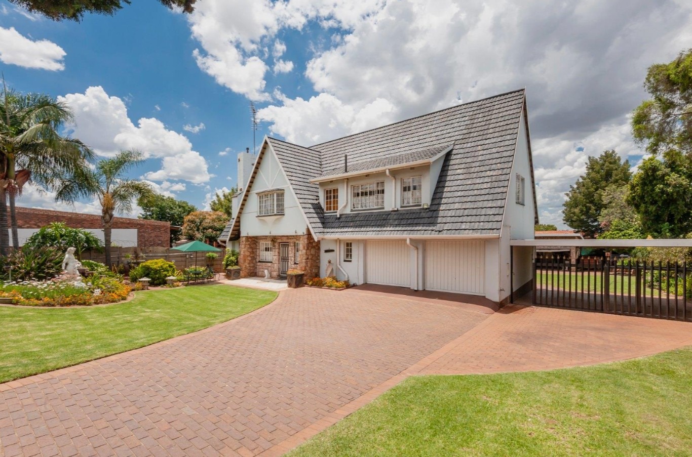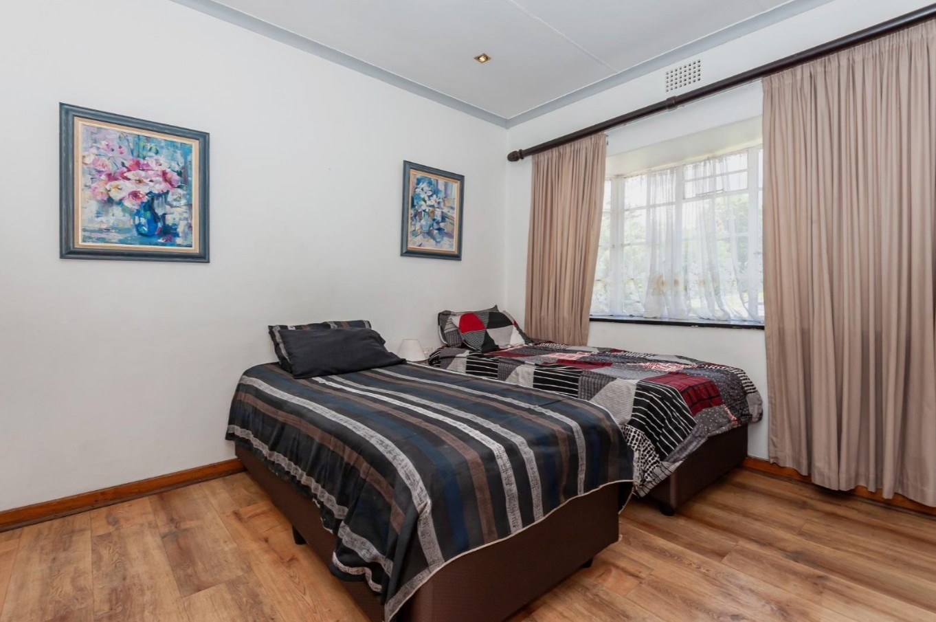 The main residence features sun filled living and dining areas, a spacious family/TV room, and a charming wooden bar for entertaining. The kitchen provides ample cupboard and counter space, while upstairs you’ll find generously sized bedrooms with laminated flooring and built-in cupboards. The main suite includes its own ensuite, and an enclosed patio with built-in braai overlooks the lush back garden and sparkling pool—perfect for relaxed gatherings.