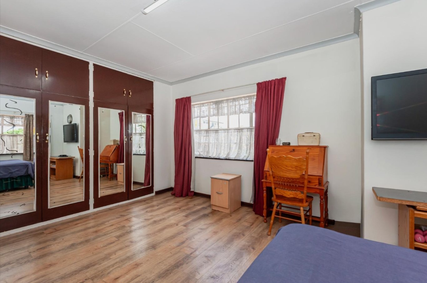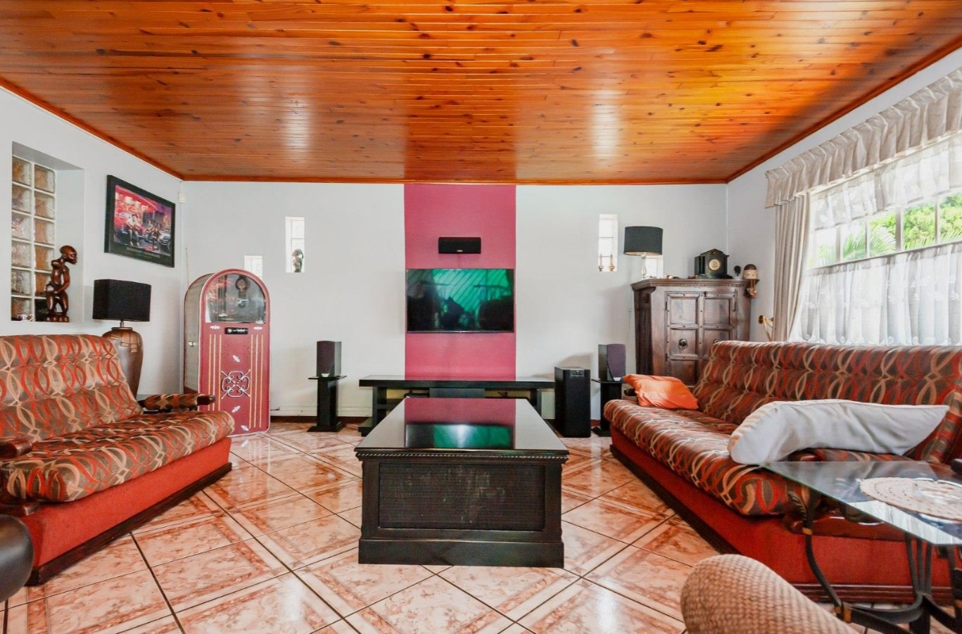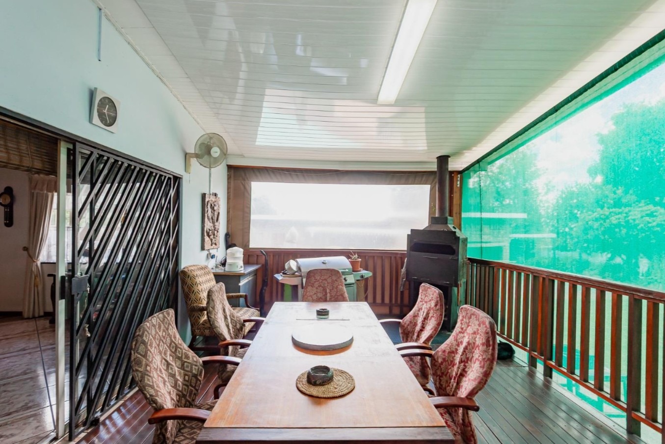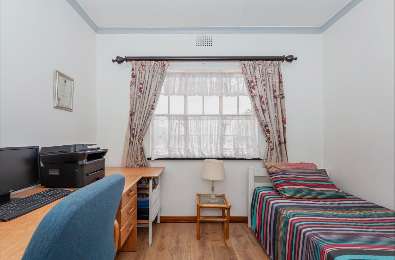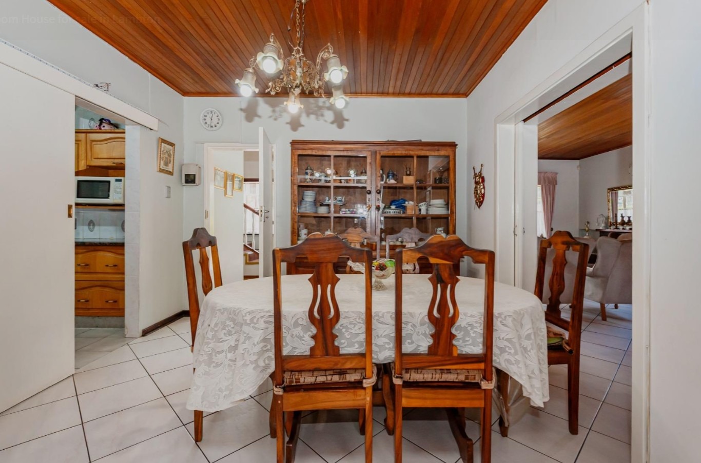 The main residence features sun filled living and dining areas, a spacious family/TV room, and a charming wooden bar for entertaining. The kitchen provides ample cupboard and counter space, while upstairs you’ll find generously sized bedrooms with laminated flooring and built-in cupboards. The main suite includes its own ensuite, and an enclosed patio with built-in braai overlooks the lush back garden and sparkling pool—perfect for relaxed gatherings.
