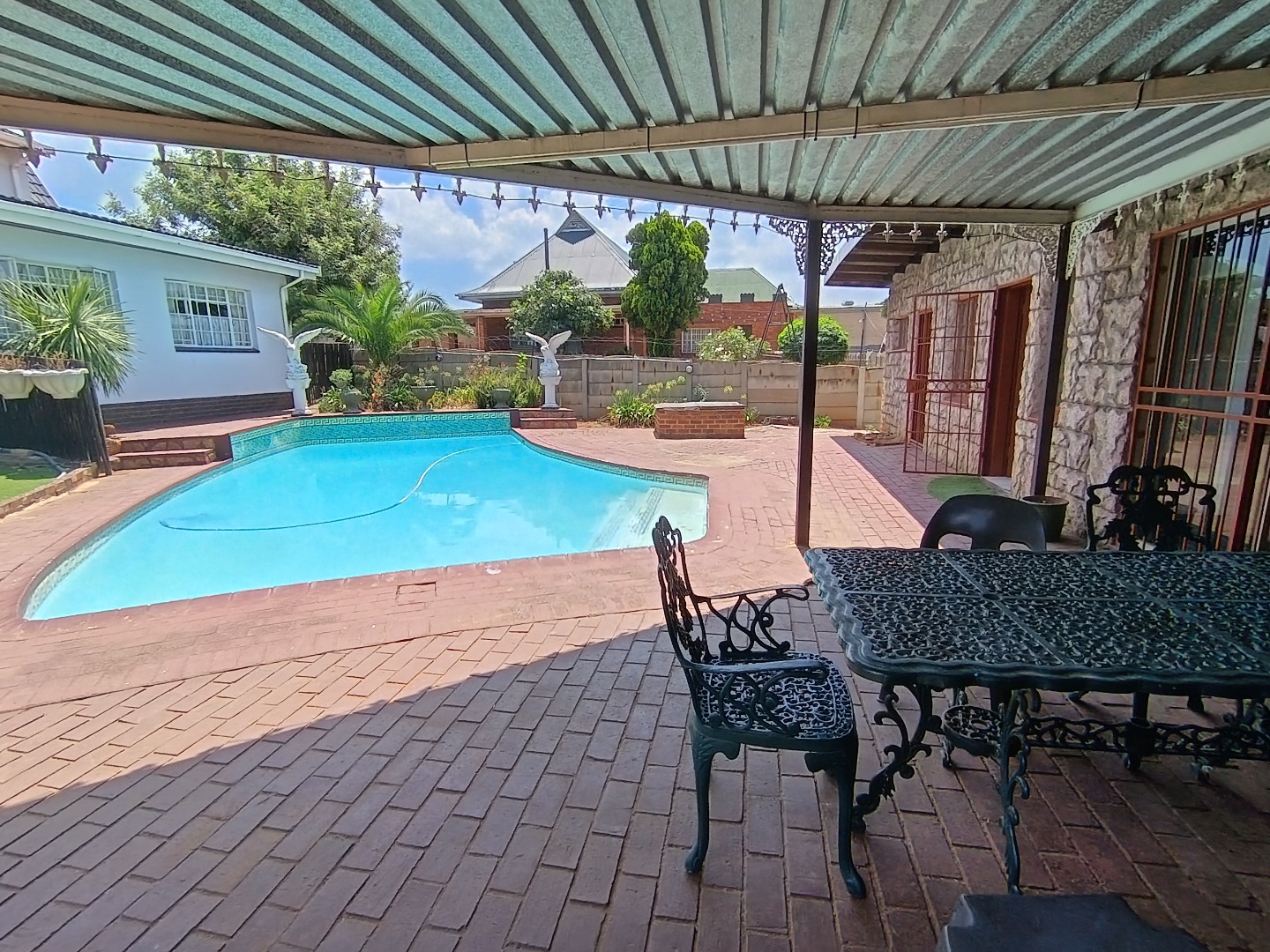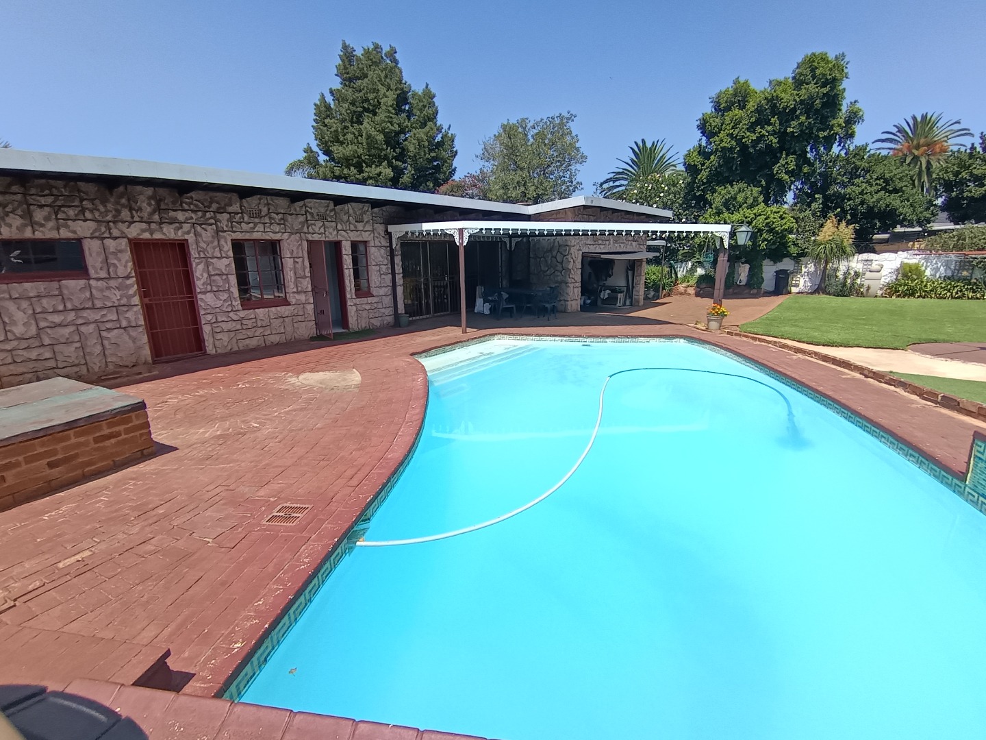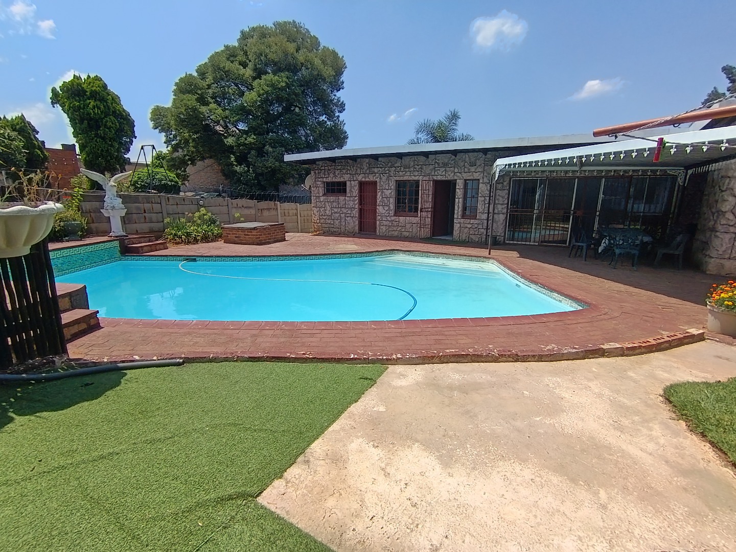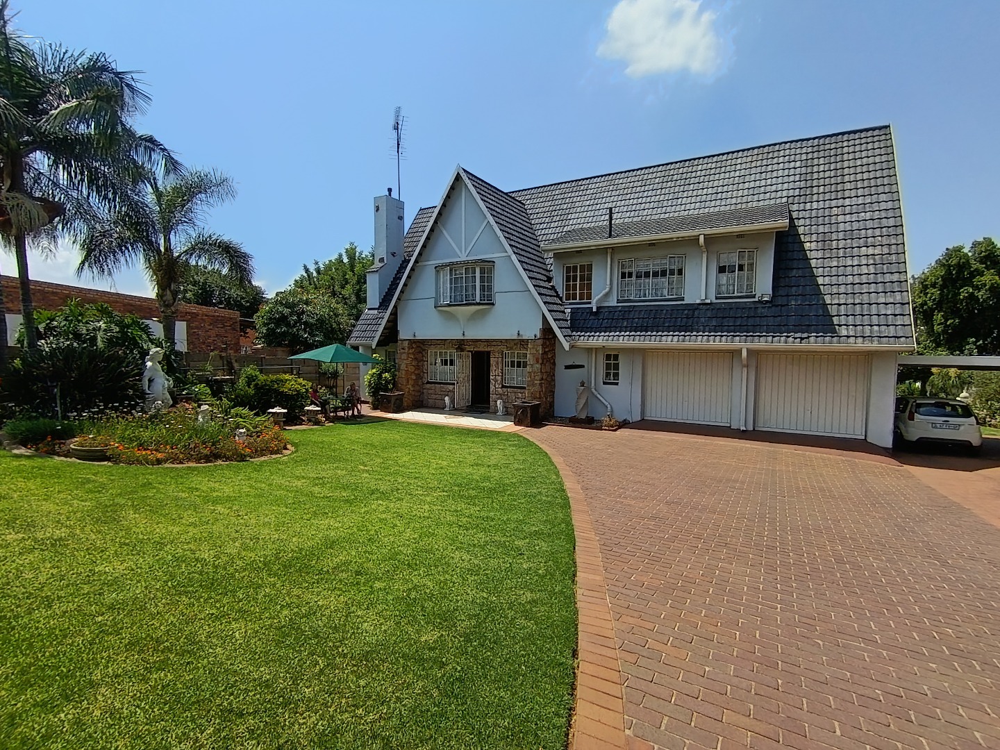 This charming Tudor-style residence, nestled on a generous 1254 sqm erf in Hazeldene, Germiston, offers an exceptional family living experience. The property immediately impresses with its distinctive architecture, well-maintained exterior, and expansive, manicured garden. A large brick-paved driveway provides ample secure parking, leading to a double garage and an additional covered carport, ensuring convenience for multiple vehicles. The secure entrance gate and fencing enhance privacy and peace of mind. Step inside to discover an inviting entrance hall that flows into the spacious living areas. The home features a comfortable lounge and a dedicated family/TV room, providing versatile spaces for relaxation and entertainment. Unique wooden plank ceilings add character, while the prominent built-in bar and a cozy fireplace create an ideal setting for gatherings. The practical tiled flooring throughout ensures easy maintenance. The residence boasts four well-proportioned bedrooms, offering comfortable accommodation for the entire family. Complementing these are three bathrooms, including a private ensuite for added convenience and luxury. A functional kitchen is also present, ready to cater to your culinary needs. Outdoor living is a delight with the expansive garden, perfect for children and pets, which are allowed on the property. The highlight is undoubtedly the inviting swimming pool, providing a refreshing escape during warmer months. An added benefit is the presence of a flatlet, offering potential for extended family living, guest accommodation, or rental income. A dedicated laundry area further enhances the home's practicality. Located in the established suburb of Hazeldene, Germiston, this property combines classic charm with practical features for a comfortable lifestyle. Its secure perimeter, including an access gate and security gate, ensures a safe environment. Key Features: * 4 Bedrooms, 3 Bathrooms (1 Ensuite) * Spacious Lounge & Family/TV Room * Distinctive Tudor-Style Architecture * Built-in Bar & Fireplace * Swimming Pool & Large Garden * Double Garage & Carport (4 Parkings) * Separate Flatlet * Laundry Room * Pet-Friendly & Secure Access