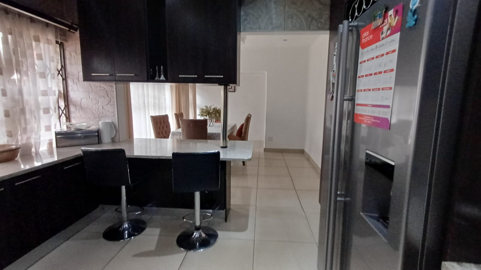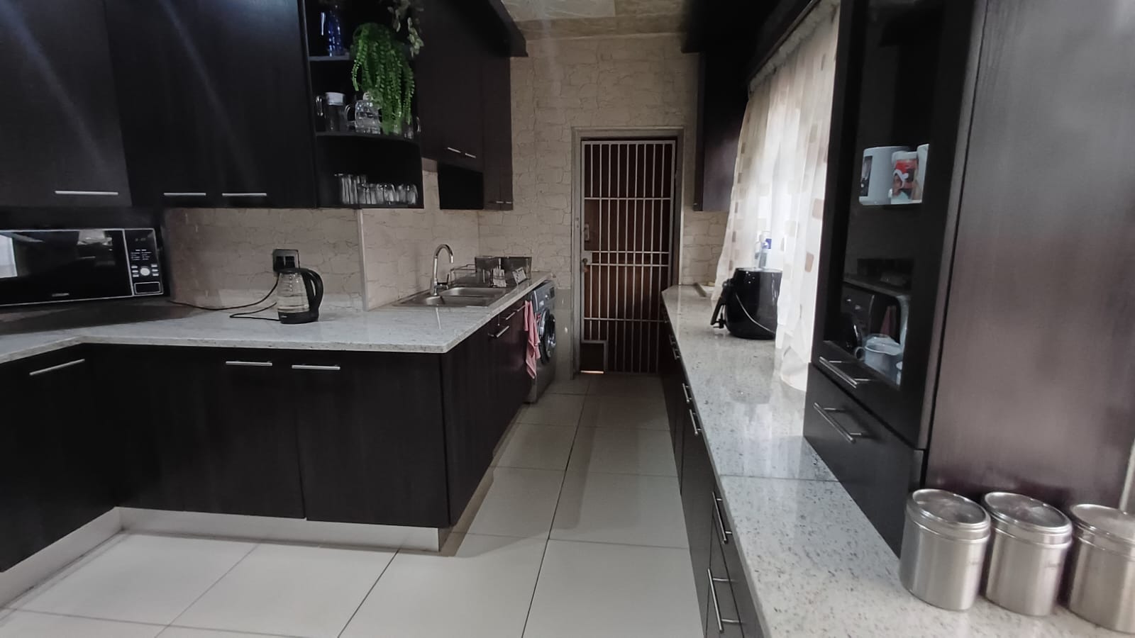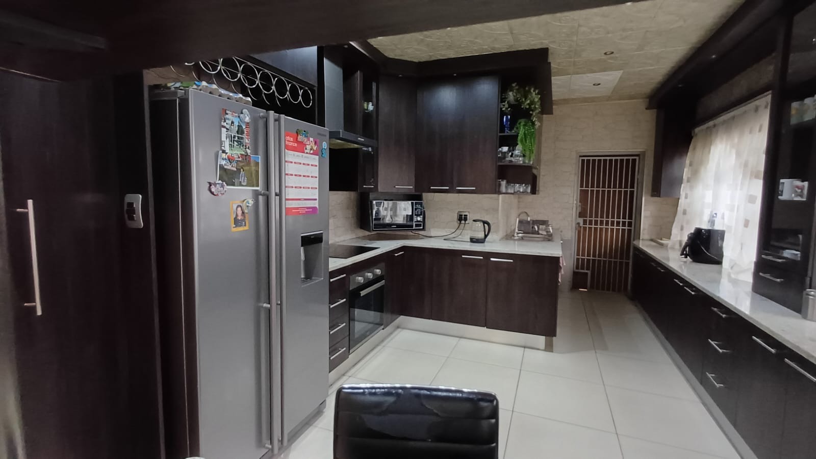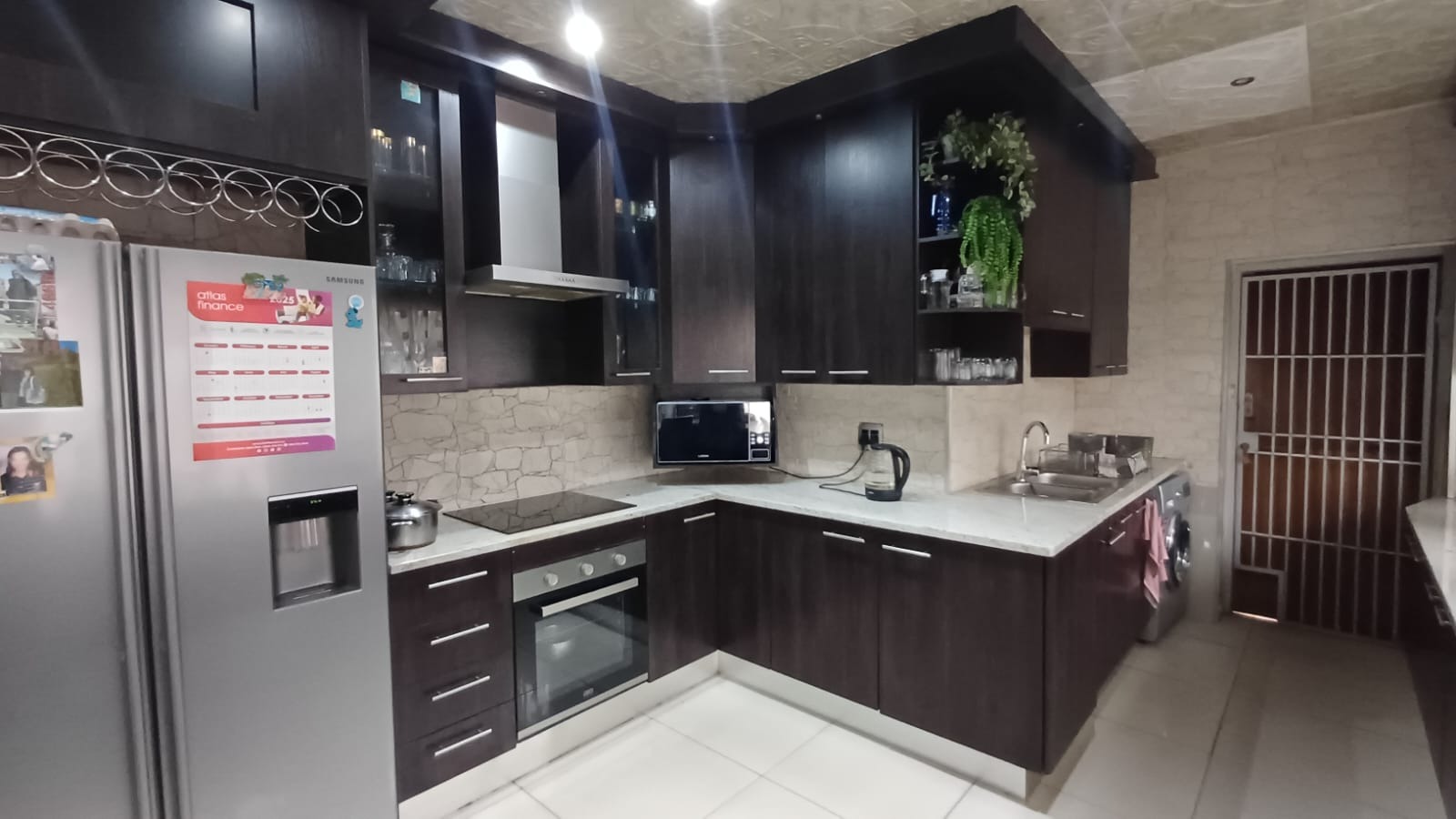 Upon entry, the interior reveals a thoughtfully designed layout encompassing two spacious lounges and a dedicated dining room, facilitating both formal entertaining and relaxed family living. The modern kitchen stands as a focal point, boasting extensive dark wood-grain cabinetry complemented by light granite or quartz countertops. This culinary space is equipped with integrated cooking appliances, including an oven and hob, a large double-door refrigerator space, and a functional breakfast nook, promoting an open-plan flow ideal for contemporary lifestyles. Ample storage solutions and tiled flooring underscore its practical elegance.