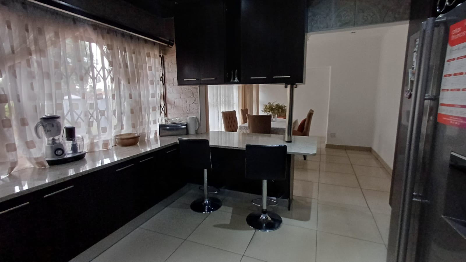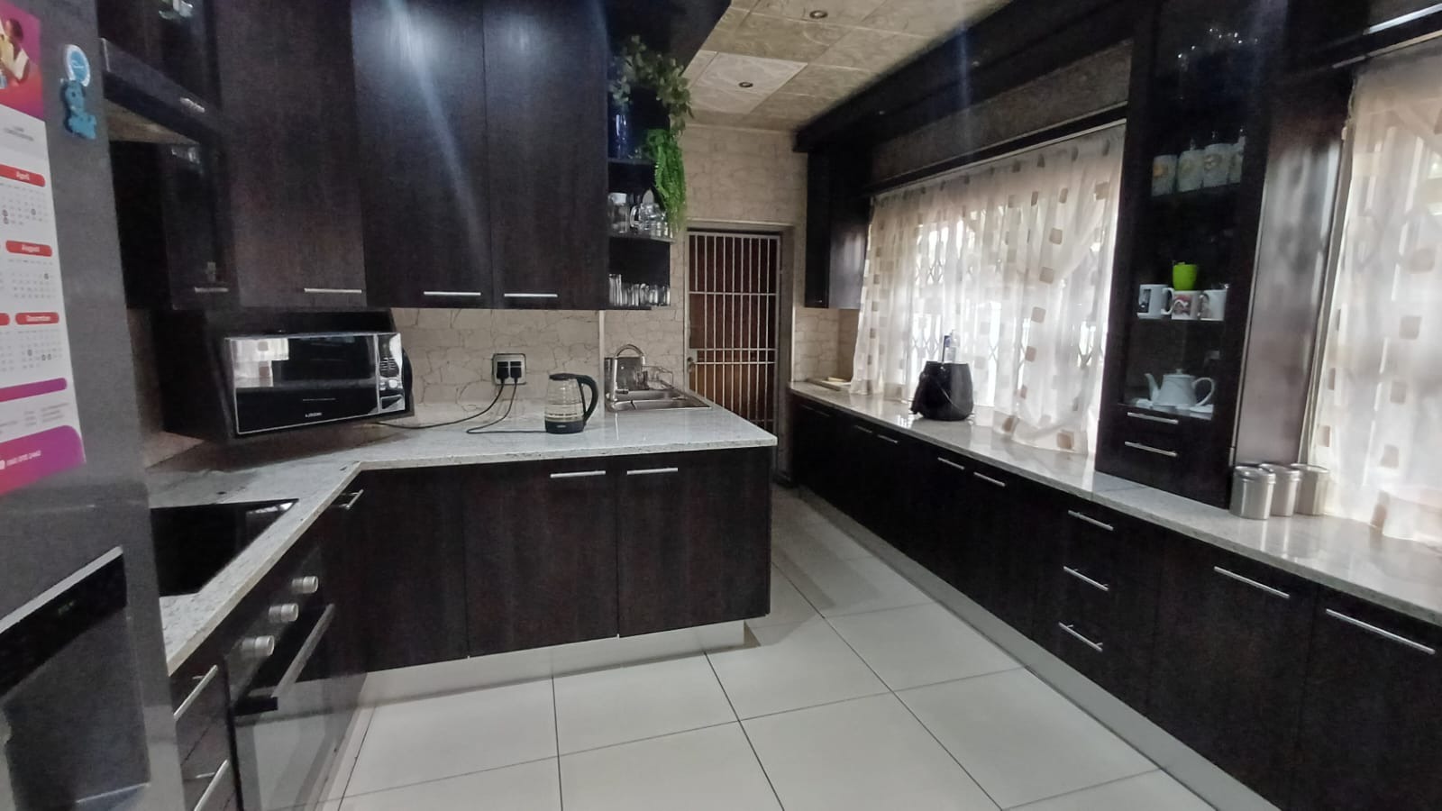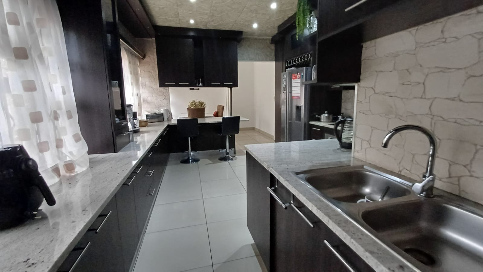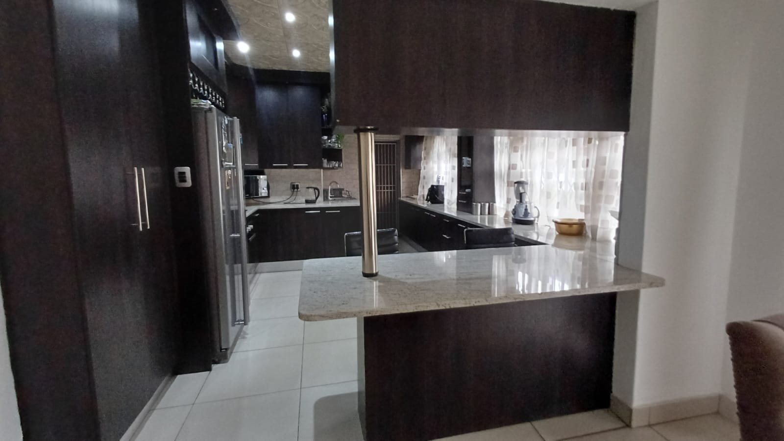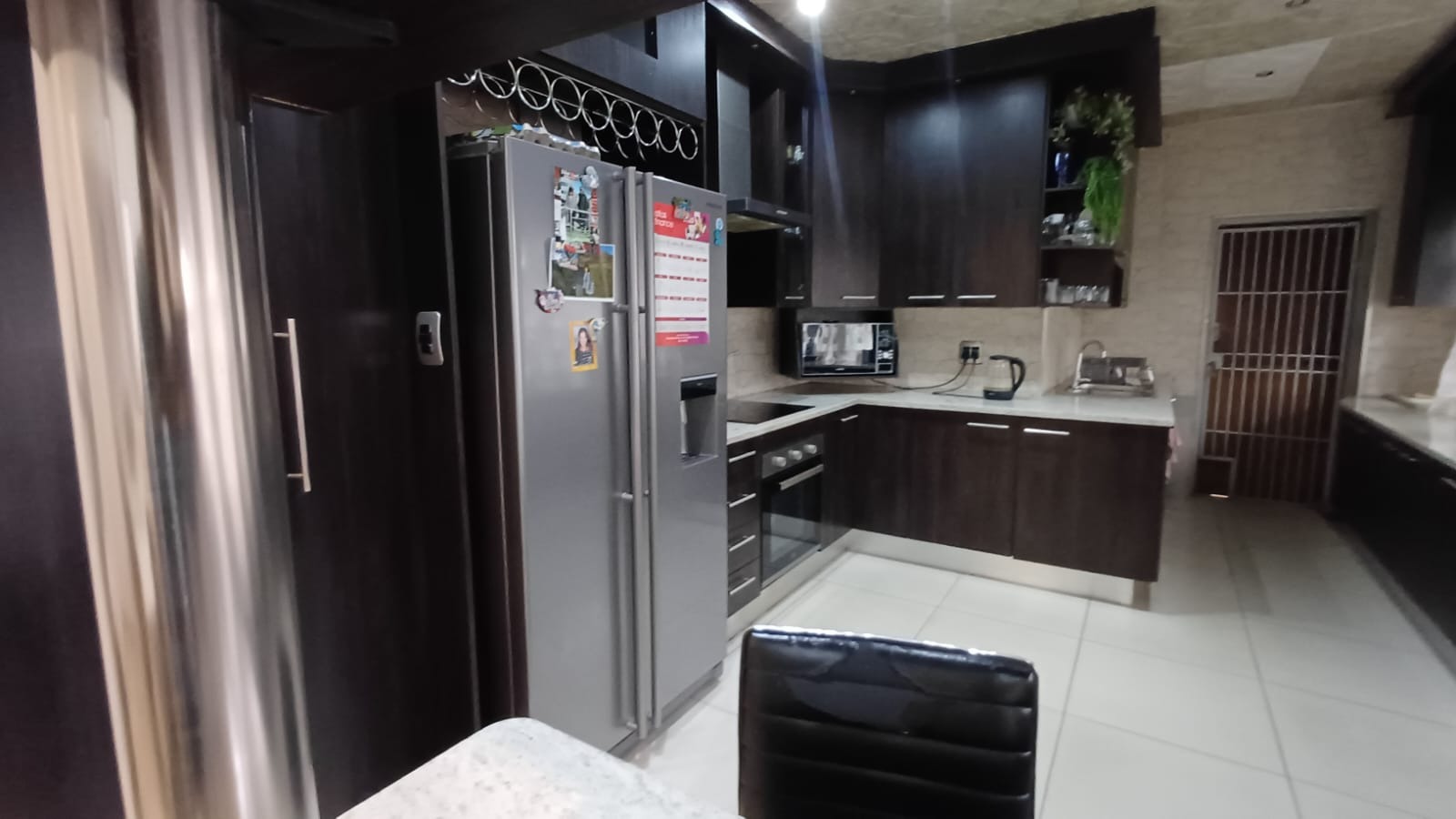 Upon entry, the interior reveals a thoughtfully designed layout encompassing two spacious lounges and a dedicated dining room, facilitating both formal entertaining and relaxed family living. The modern kitchen stands as a focal point, boasting extensive dark wood-grain cabinetry complemented by light granite or quartz countertops. This culinary space is equipped with integrated cooking appliances, including an oven and hob, a large double-door refrigerator space, and a functional breakfast nook, promoting an open-plan flow ideal for contemporary lifestyles. Ample storage solutions and tiled flooring underscore its practical elegance.