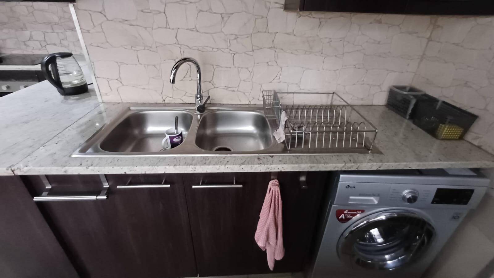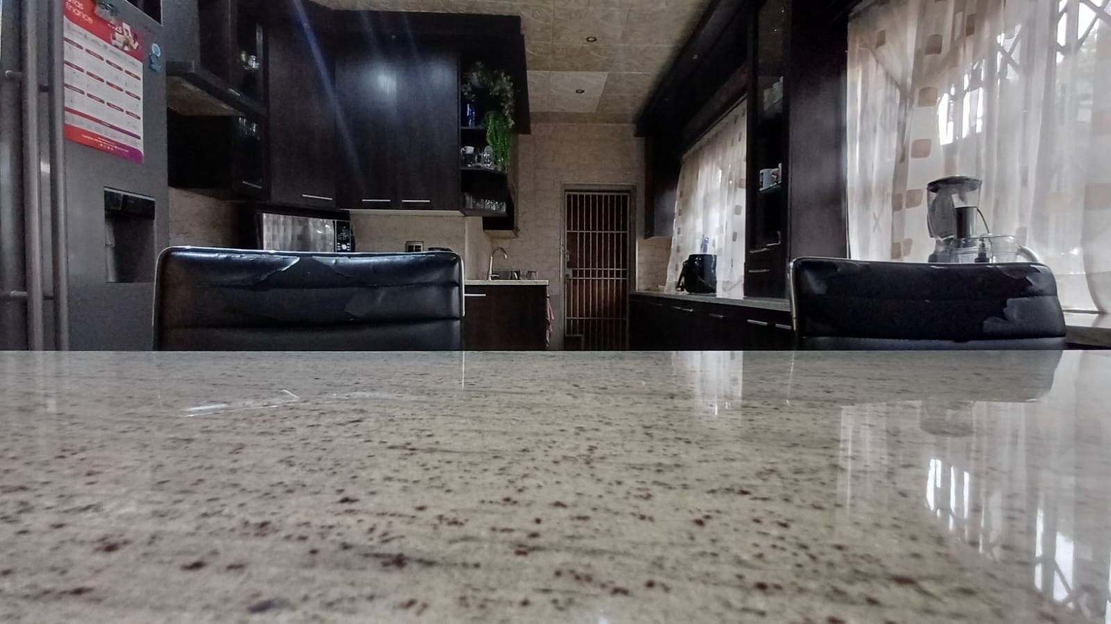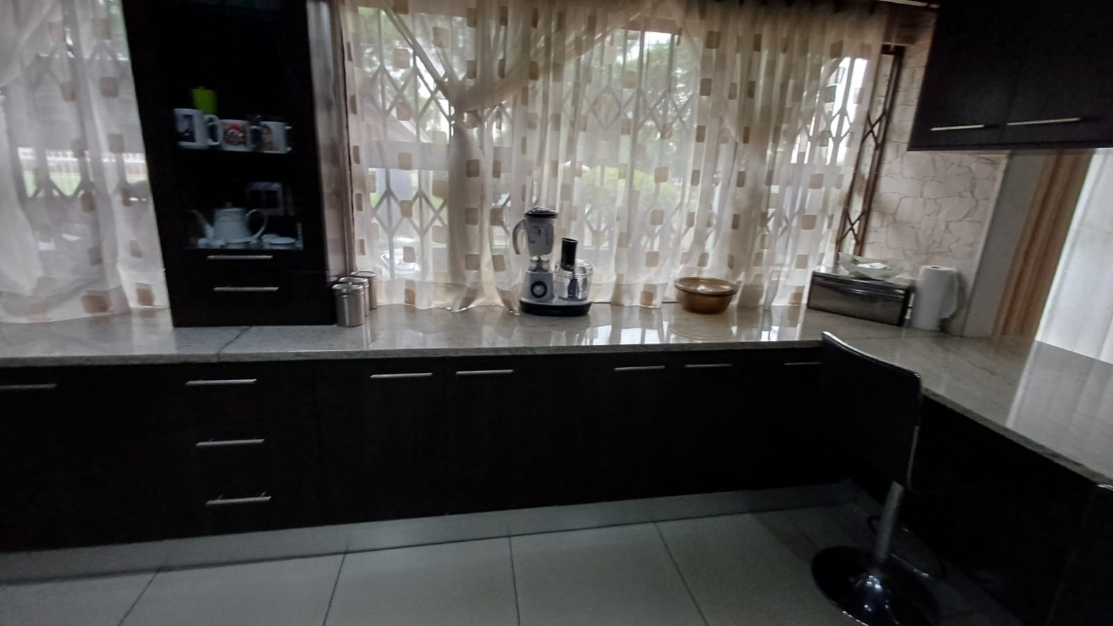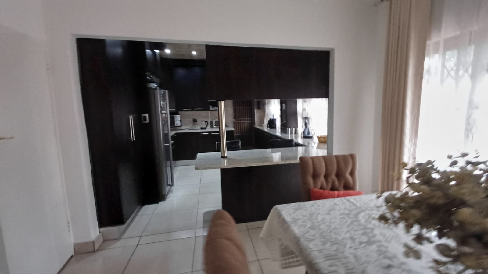 Upon entry, the interior reveals a thoughtfully designed layout encompassing two spacious lounges and a dedicated dining room, facilitating both formal entertaining and relaxed family living. The modern kitchen stands as a focal point, boasting extensive dark wood-grain cabinetry complemented by light granite or quartz countertops. This culinary space is equipped with integrated cooking appliances, including an oven and hob, a large double-door refrigerator space, and a functional breakfast nook, promoting an open-plan flow ideal for contemporary lifestyles. Ample storage solutions and tiled flooring underscore its practical elegance.