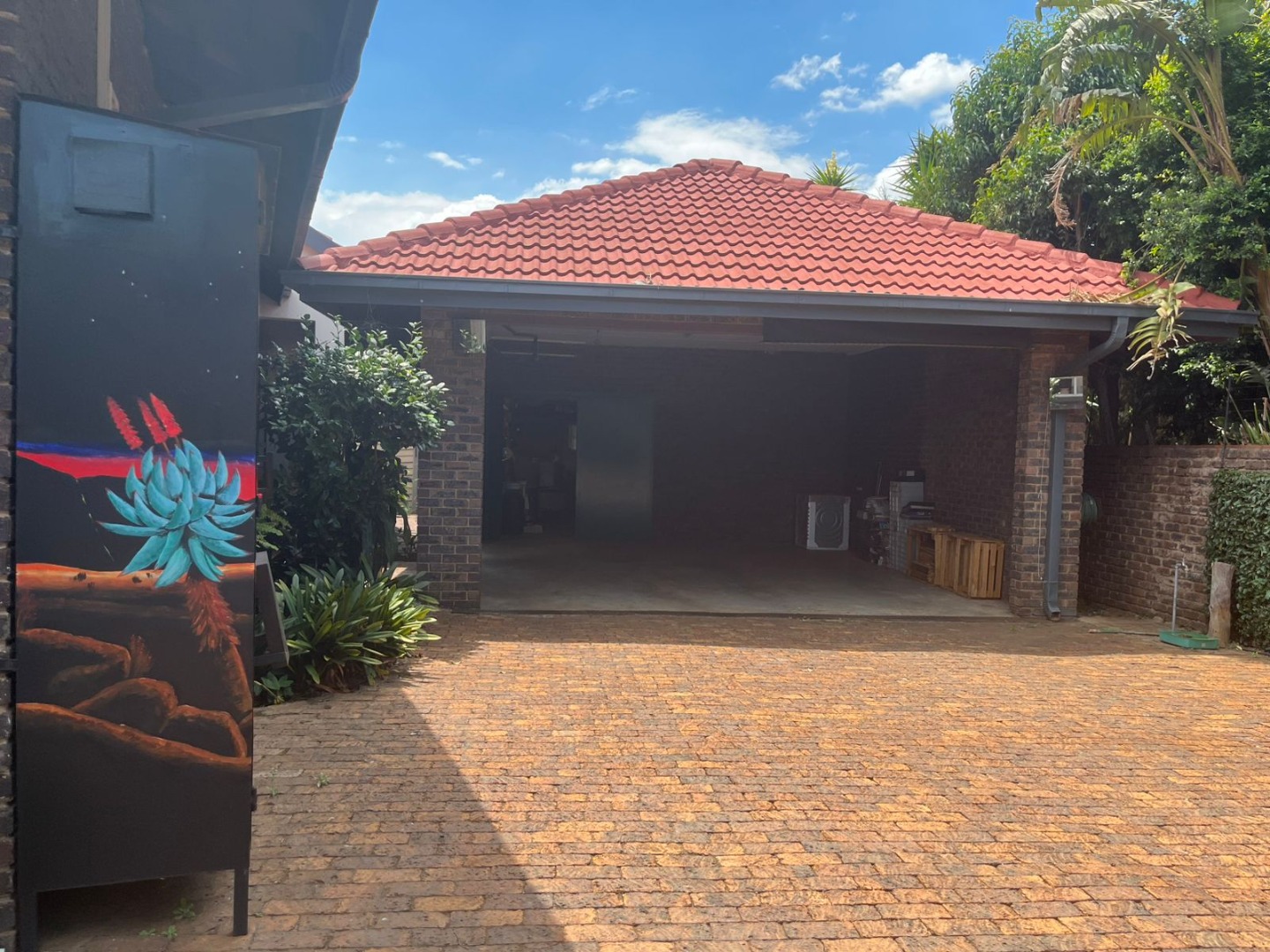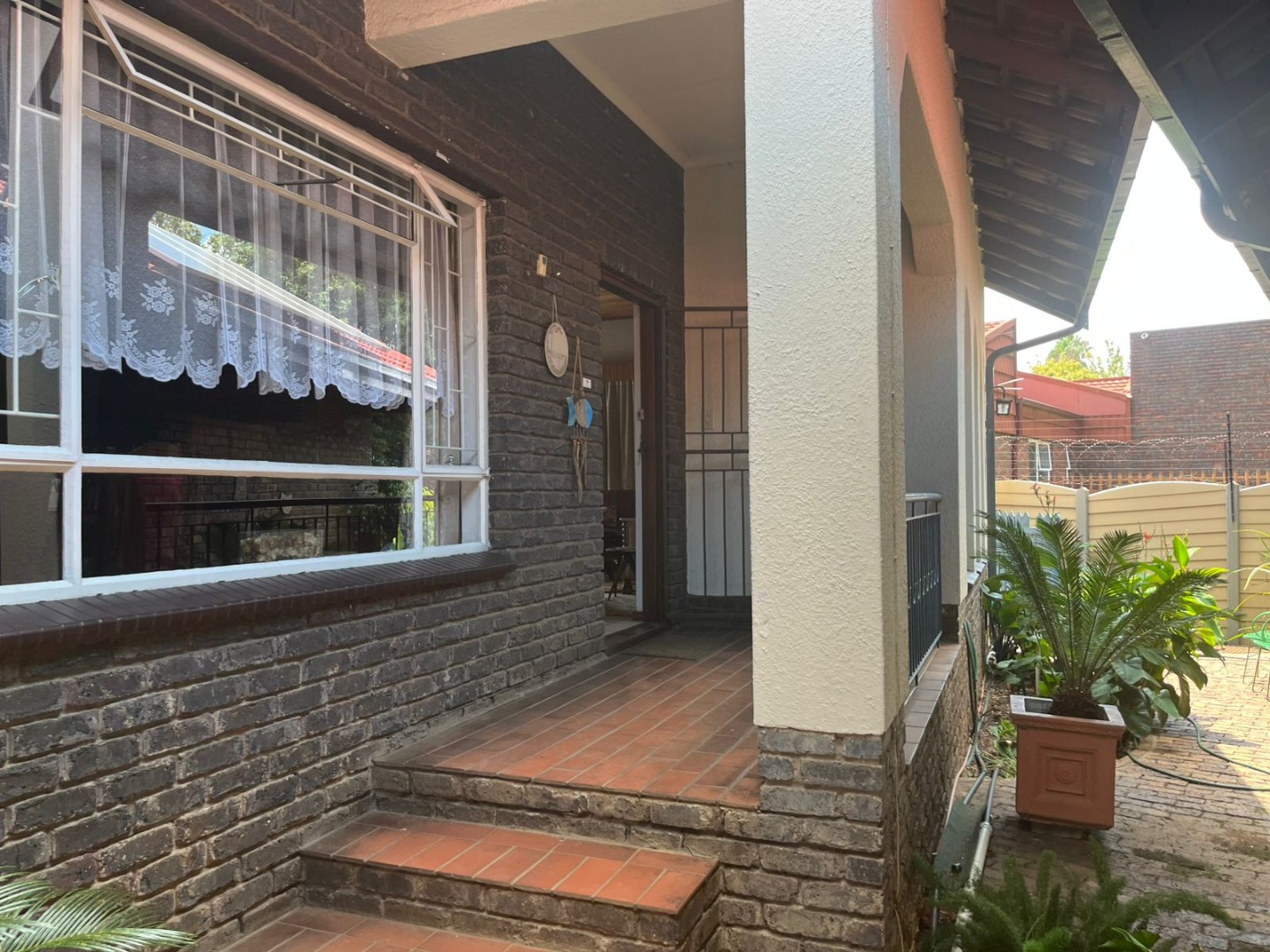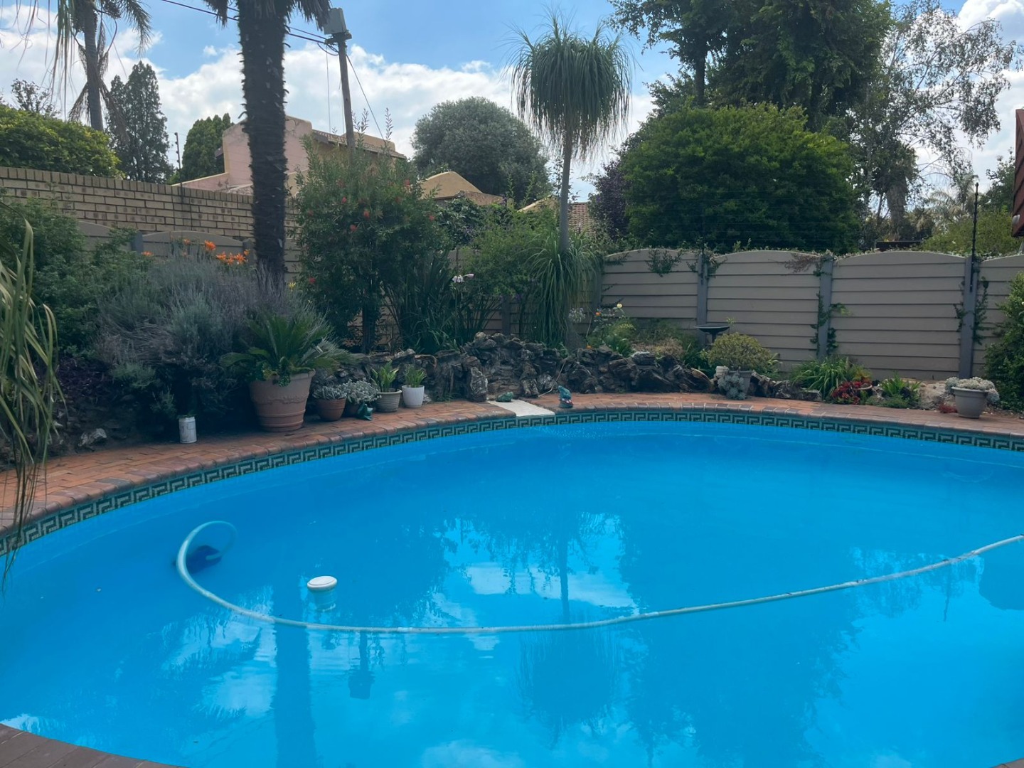 This inviting single-story residence in Hazelpark, Germiston, presents a welcoming façade with its bright red tiled roof and light-colored walls, complemented by a lush green lawn. A durable brick paver driveway leads to a double garage with attractive dark wood-paneled doors, ensuring ample parking and storage. Step inside to discover a spacious lounge area, bathed in natural light from large arched windows, offering a comfortable space for relaxation. The generously sized kitchen is equipped with extensive wooden cabinetry, open shelving, a built-in hob on the island, a double sink, and a convenient pantry. Tiled floors and walls ensure practicality, while ample storage caters to all culinary needs. A dedicated home office, featuring multiple desk areas and built-in shelving, provides a functional workspace. The residence offers four comfortable bedrooms and two bathrooms, including one en-suite, ensuring convenience and privacy. Built-in wooden wardrobes throughout provide significant storage solutions. Set on a generous 1101 sqm erf, the outdoor area is designed for enjoyment, featuring a well-maintained garden and a refreshing swimming pool, perfect for leisure and entertaining. An inviting outdoor seating area provides a tranquil spot for relaxation. The double garage offers secure parking, and security bars on windows provide an added layer of peace of mind. Located in the suburban area of Germiston, this home offers convenient access to local amenities and transport routes, making it an ideal choice for family living in South Africa. Key Features: * Four Bedrooms * Two Bathrooms (one en-suite) * Spacious Lounge * Large Kitchen with Pantry * Dedicated Home Office * Double Garage * Swimming Pool * 1101 sqm Erf * Well-maintained Garden