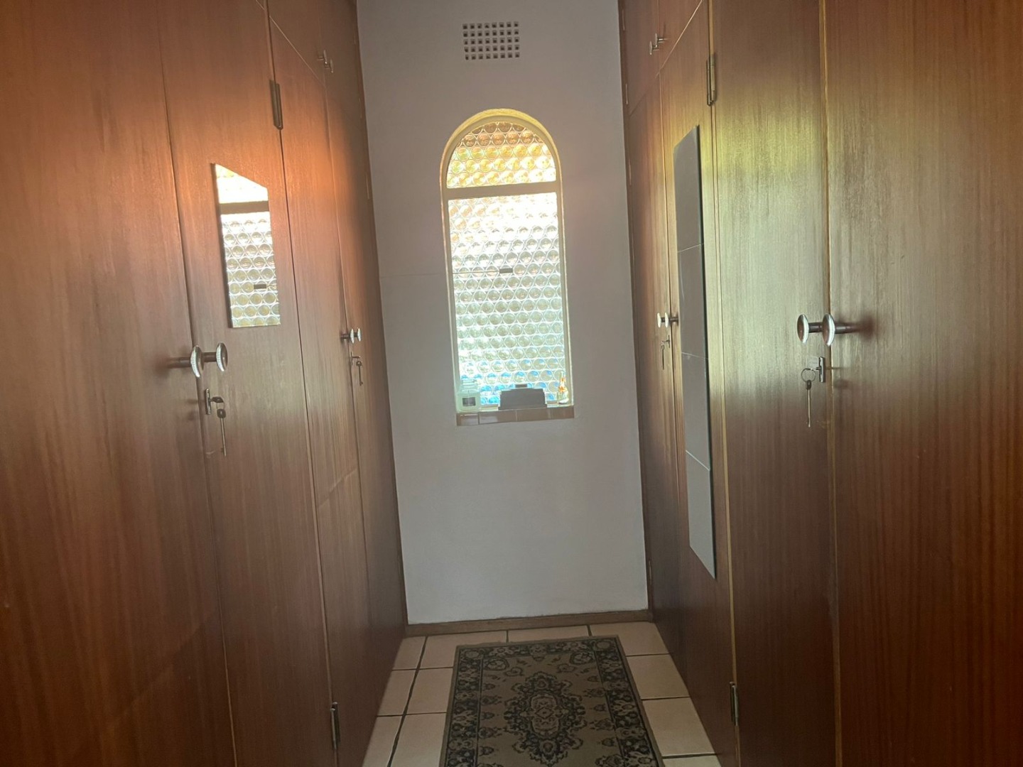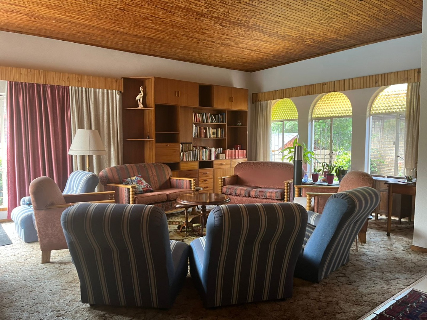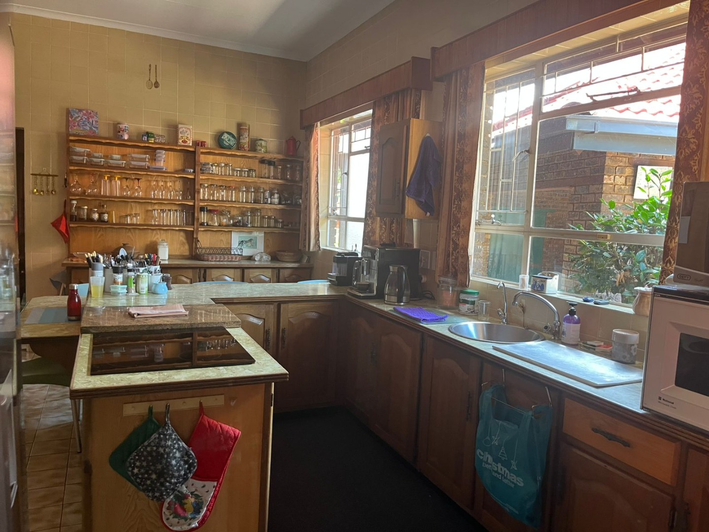 This inviting single-story residence in Hazelpark, Germiston, presents a welcoming façade with its bright red tiled roof and light-colored walls, complemented by a lush green lawn. A durable brick paver driveway leads to a double garage with attractive dark wood-paneled doors, ensuring ample parking and storage. Step inside to discover a spacious lounge area, bathed in natural light from large arched windows, offering a comfortable space for relaxation. The generously sized kitchen is equipped with extensive wooden cabinetry, open shelving, a built-in hob on the island, a double sink, and a convenient pantry. Tiled floors and walls ensure practicality, while ample storage caters to all culinary needs. A dedicated home office, featuring multiple desk areas and built-in shelving, provides a functional workspace. The residence offers four comfortable bedrooms and two bathrooms, including one en-suite, ensuring convenience and privacy. Built-in wooden wardrobes throughout provide significant storage solutions. Set on a generous 1101 sqm erf, the outdoor area is designed for enjoyment, featuring a well-maintained garden and a refreshing swimming pool, perfect for leisure and entertaining. An inviting outdoor seating area provides a tranquil spot for relaxation. The double garage offers secure parking, and security bars on windows provide an added layer of peace of mind. Located in the suburban area of Germiston, this home offers convenient access to local amenities and transport routes, making it an ideal choice for family living in South Africa. Key Features: * Four Bedrooms * Two Bathrooms (one en-suite) * Spacious Lounge * Large Kitchen with Pantry * Dedicated Home Office * Double Garage * Swimming Pool * 1101 sqm Erf * Well-maintained Garden