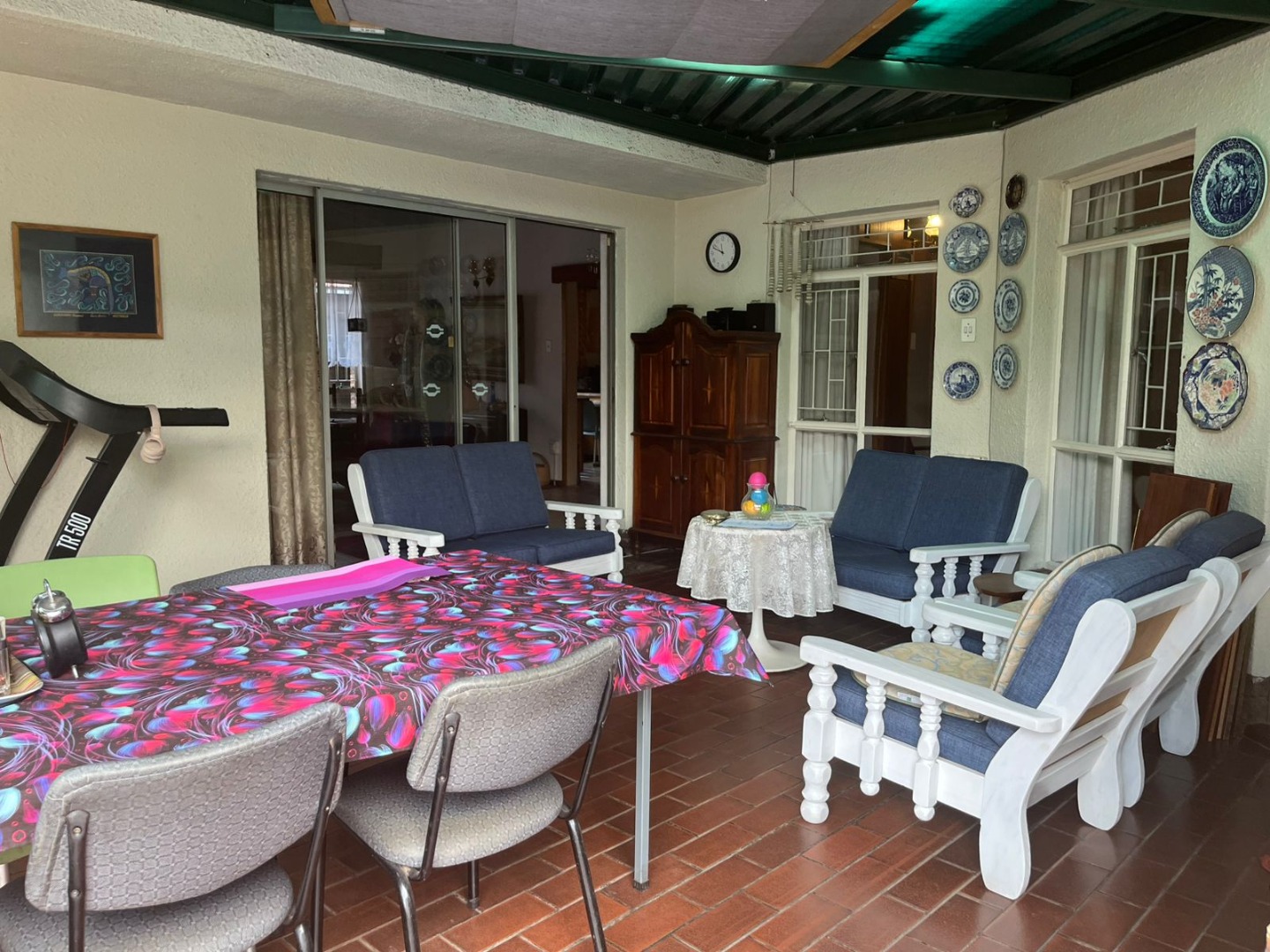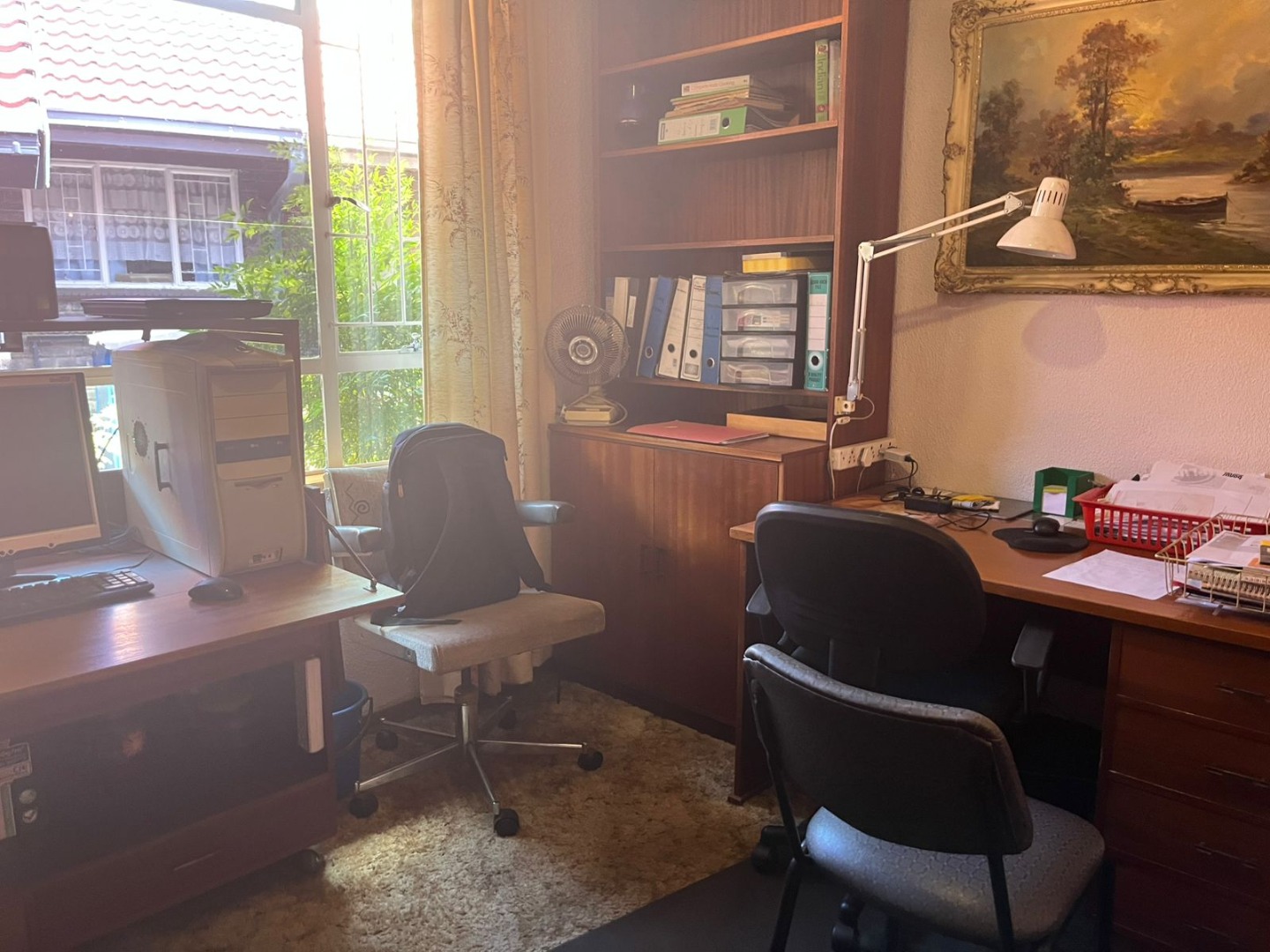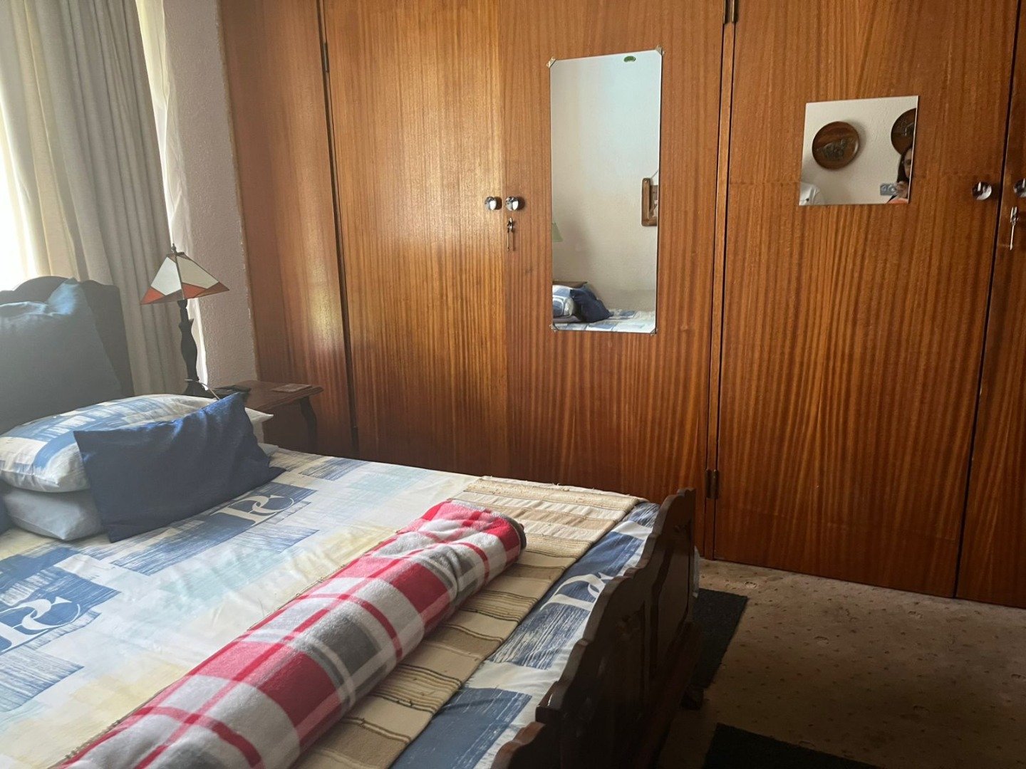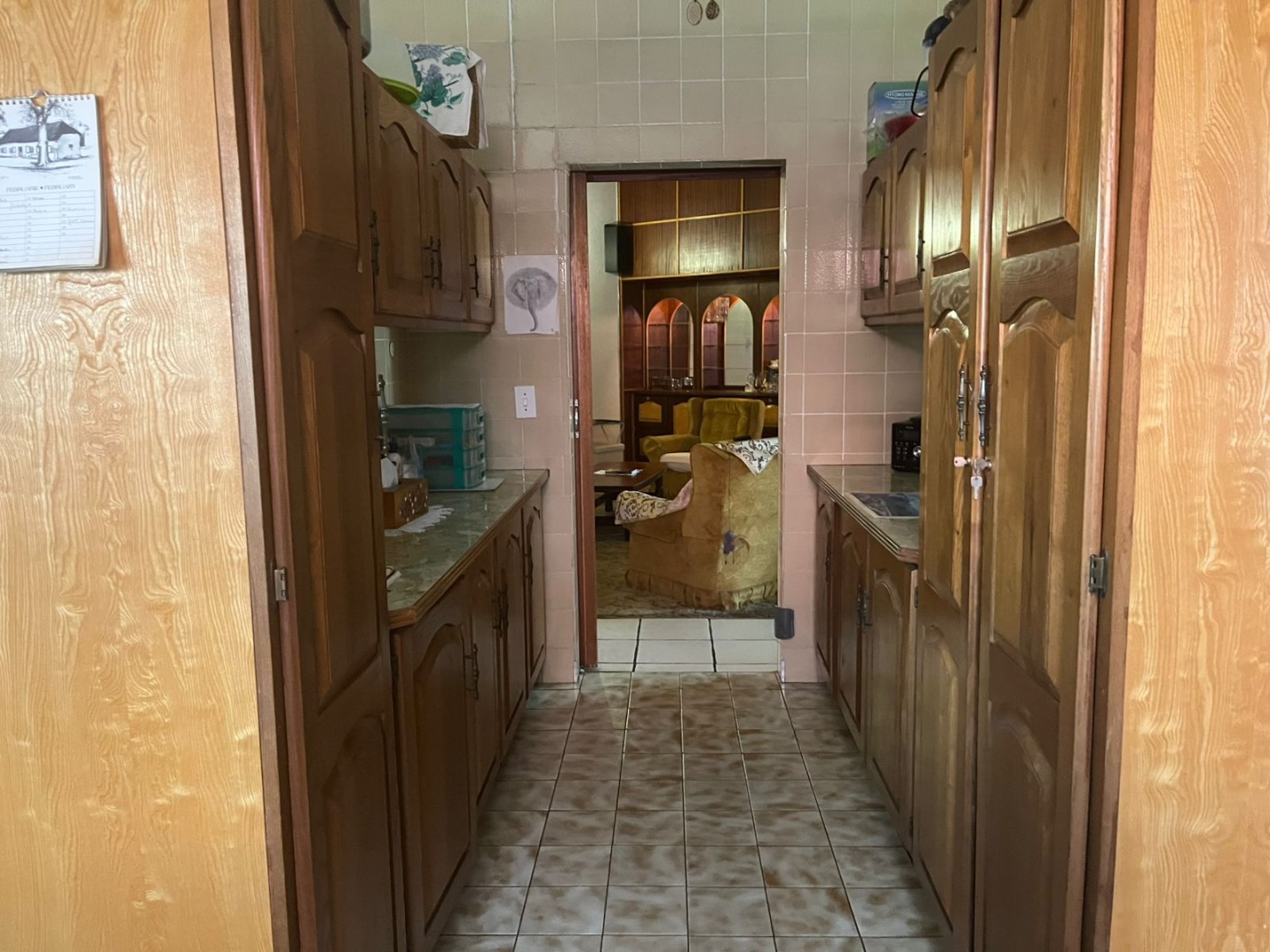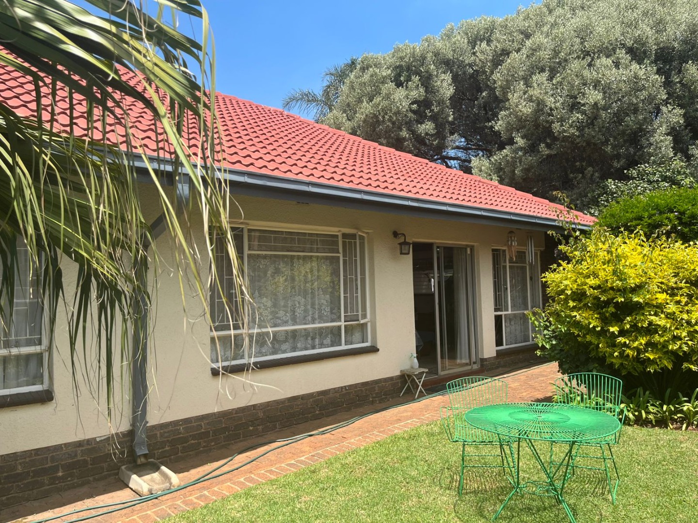 This inviting single-story residence in Hazelpark, Germiston, presents a welcoming façade with its bright red tiled roof and light-colored walls, complemented by a lush green lawn. A durable brick paver driveway leads to a double garage with attractive dark wood-paneled doors, ensuring ample parking and storage. Step inside to discover a spacious lounge area, bathed in natural light from large arched windows, offering a comfortable space for relaxation. The generously sized kitchen is equipped with extensive wooden cabinetry, open shelving, a built-in hob on the island, a double sink, and a convenient pantry. Tiled floors and walls ensure practicality, while ample storage caters to all culinary needs. A dedicated home office, featuring multiple desk areas and built-in shelving, provides a functional workspace. The residence offers four comfortable bedrooms and two bathrooms, including one en-suite, ensuring convenience and privacy. Built-in wooden wardrobes throughout provide significant storage solutions. Set on a generous 1101 sqm erf, the outdoor area is designed for enjoyment, featuring a well-maintained garden and a refreshing swimming pool, perfect for leisure and entertaining. An inviting outdoor seating area provides a tranquil spot for relaxation. The double garage offers secure parking, and security bars on windows provide an added layer of peace of mind. Located in the suburban area of Germiston, this home offers convenient access to local amenities and transport routes, making it an ideal choice for family living in South Africa. Key Features: * Four Bedrooms * Two Bathrooms (one en-suite) * Spacious Lounge * Large Kitchen with Pantry * Dedicated Home Office * Double Garage * Swimming Pool * 1101 sqm Erf * Well-maintained Garden