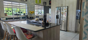 double eye-level oven. The center island with a gas hob and breakfast nook is perfect for casual