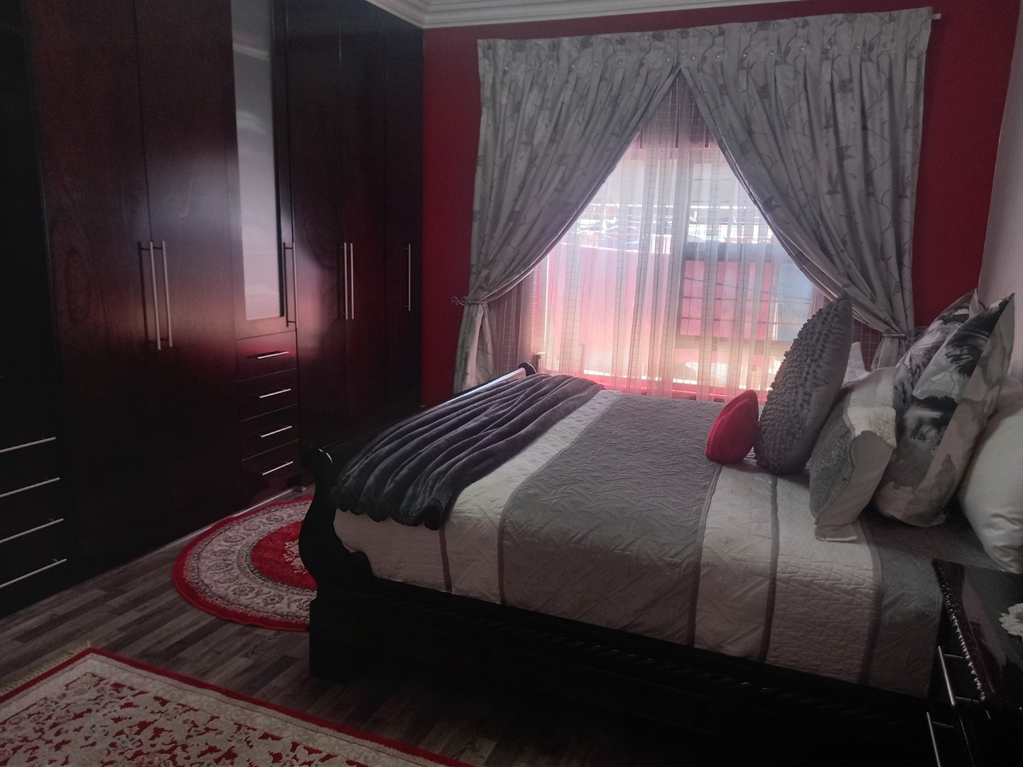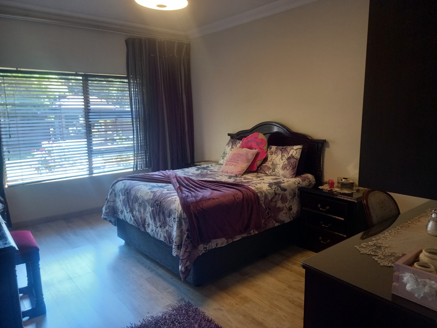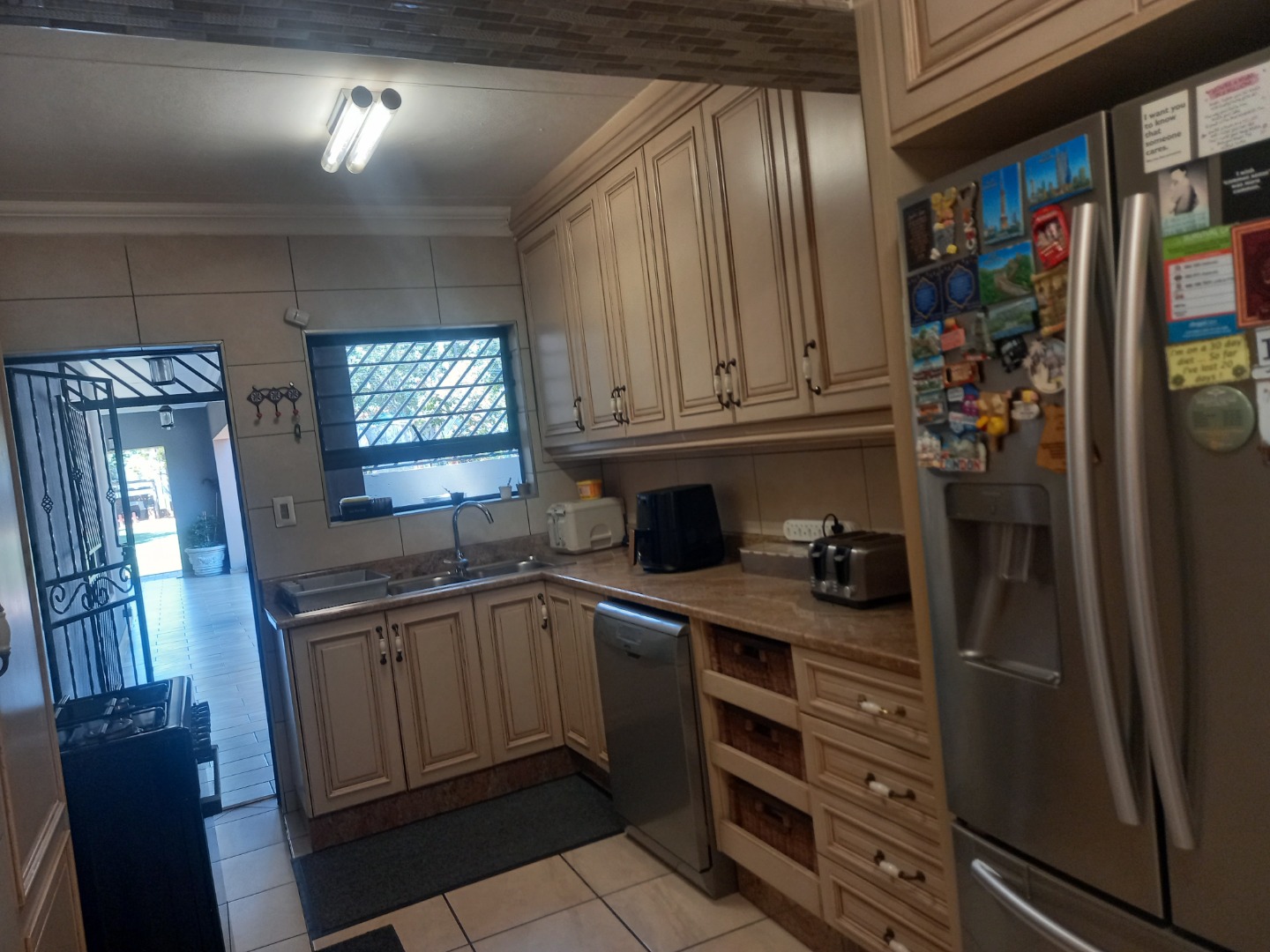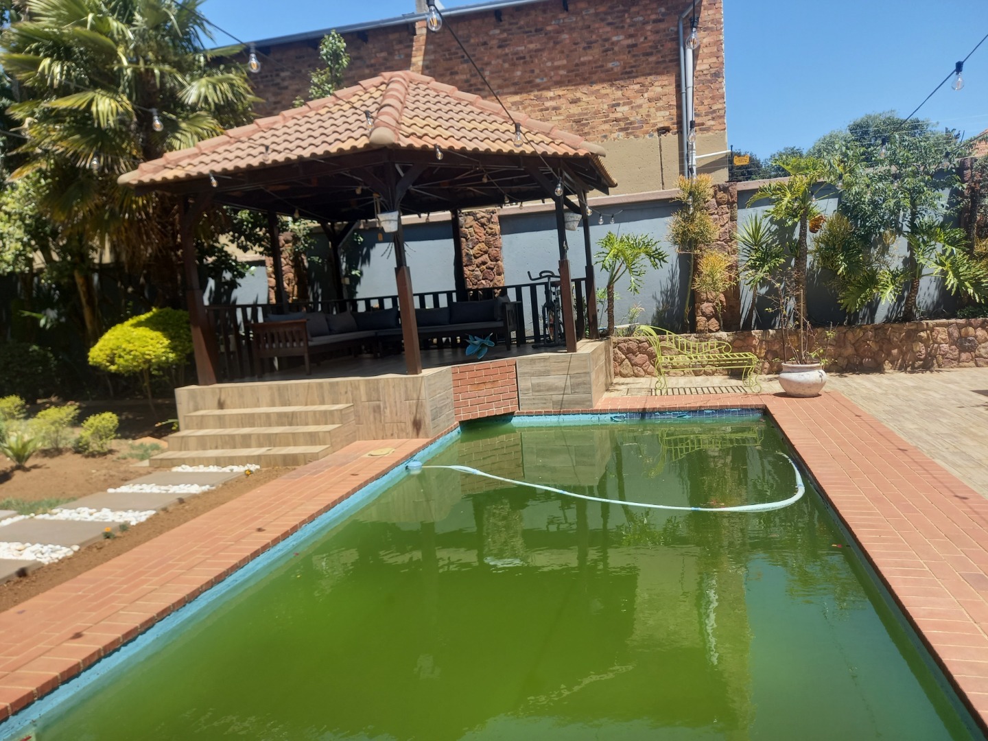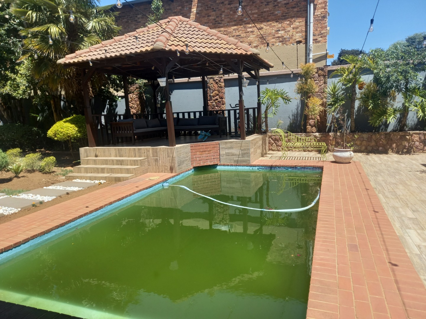 Discover this impressive 4-bedroom, 2-bathroom family home situated in the desirable suburban area of Lambton, Germiston, South Africa. Boasting a substantial 400 sqm under roof on a 2507 sqm erf, this property immediately captivates with its grand and secure entrance. Featuring prominent pillars, an arched entryway, and robust double wrought-iron security gates, the well-maintained exterior showcases an attractive stone facade and a beautifully landscaped front yard with green grass and blooming rose bushes. Inside, the home offers thoughtfully designed living spaces, including a dedicated dining room and a comfortable lounge, all benefiting from ample natural light. The four bedrooms provide comfort and practicality, equipped with extensive built-in storage solutions. Modern bed frames, air conditioning in key areas, and easy-to-maintain tiled flooring enhance the interior's appeal. The outdoor area is an entertainer's delight, featuring a refreshing swimming pool set within a well-maintained garden, ideal for leisure. Ample parking includes two garages and two additional spaces, complemented by paved pathways. Security is paramount, with an alarm system, electric fencing, burglar bars, and an access gate providing comprehensive peace of mind. A valuable borehole ensures water resilience for this exceptional property.