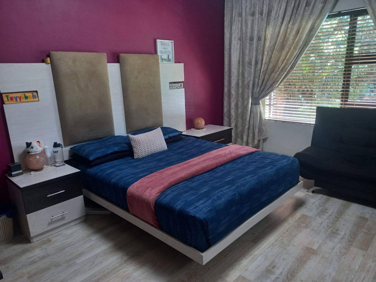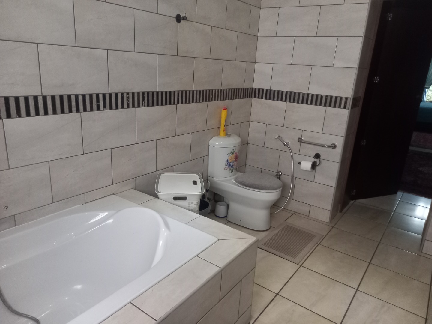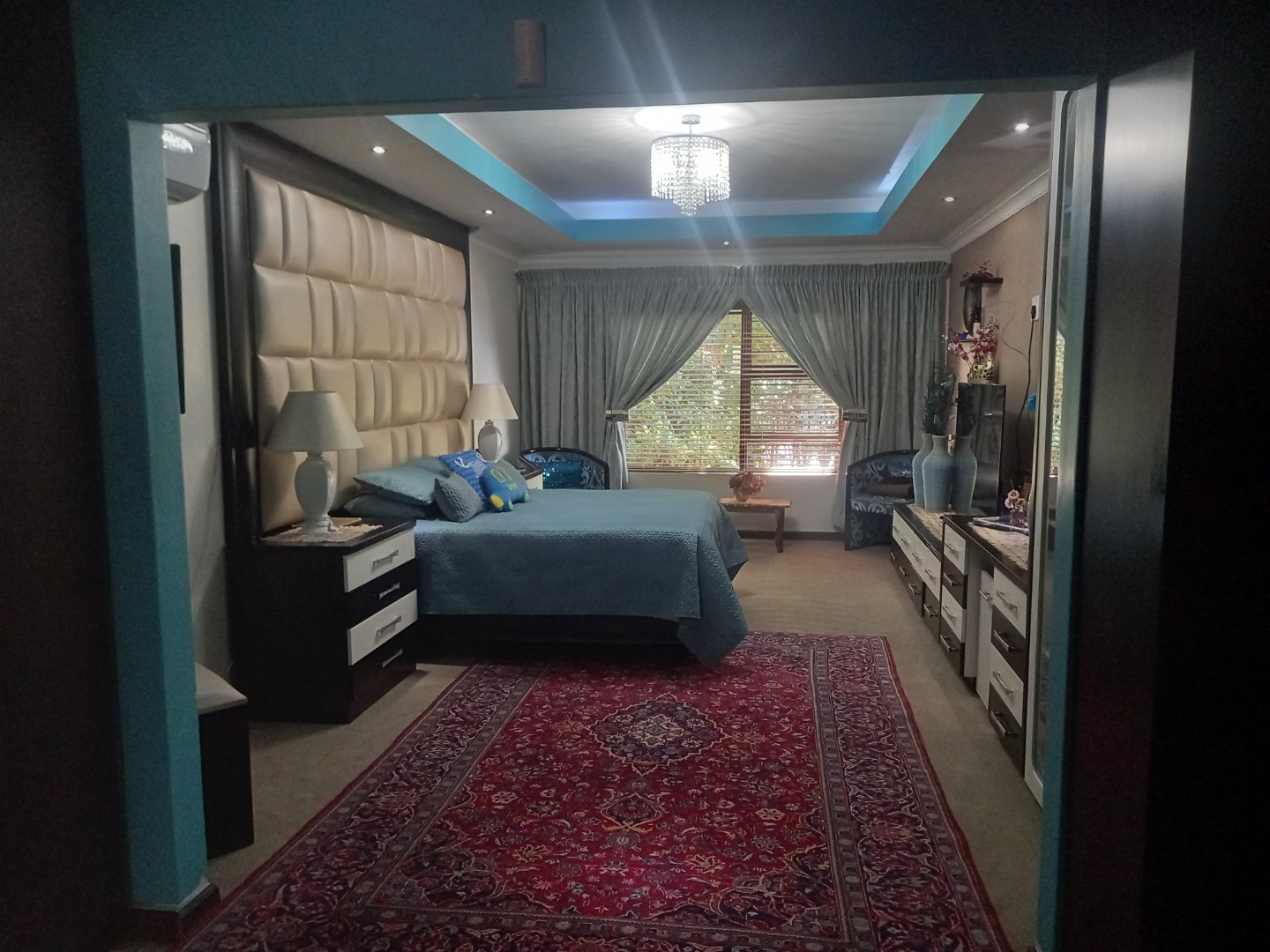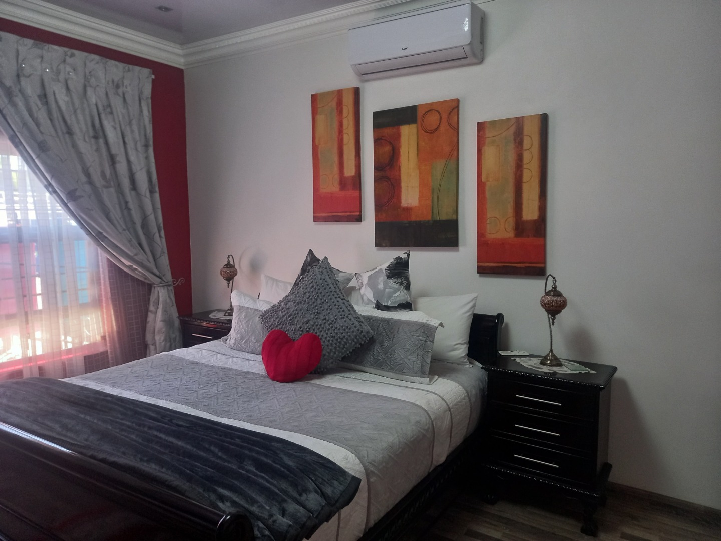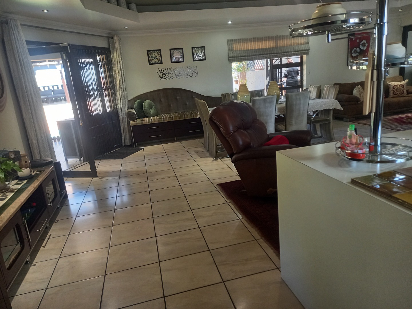 Discover this impressive 4-bedroom, 2-bathroom family home situated in the desirable suburban area of Lambton, Germiston, South Africa. Boasting a substantial 400 sqm under roof on a 2507 sqm erf, this property immediately captivates with its grand and secure entrance. Featuring prominent pillars, an arched entryway, and robust double wrought-iron security gates, the well-maintained exterior showcases an attractive stone facade and a beautifully landscaped front yard with green grass and blooming rose bushes. Inside, the home offers thoughtfully designed living spaces, including a dedicated dining room and a comfortable lounge, all benefiting from ample natural light. The four bedrooms provide comfort and practicality, equipped with extensive built-in storage solutions. Modern bed frames, air conditioning in key areas, and easy-to-maintain tiled flooring enhance the interior's appeal. The outdoor area is an entertainer's delight, featuring a refreshing swimming pool set within a well-maintained garden, ideal for leisure. Ample parking includes two garages and two additional spaces, complemented by paved pathways. Security is paramount, with an alarm system, electric fencing, burglar bars, and an access gate providing comprehensive peace of mind. A valuable borehole ensures water resilience for this exceptional property.