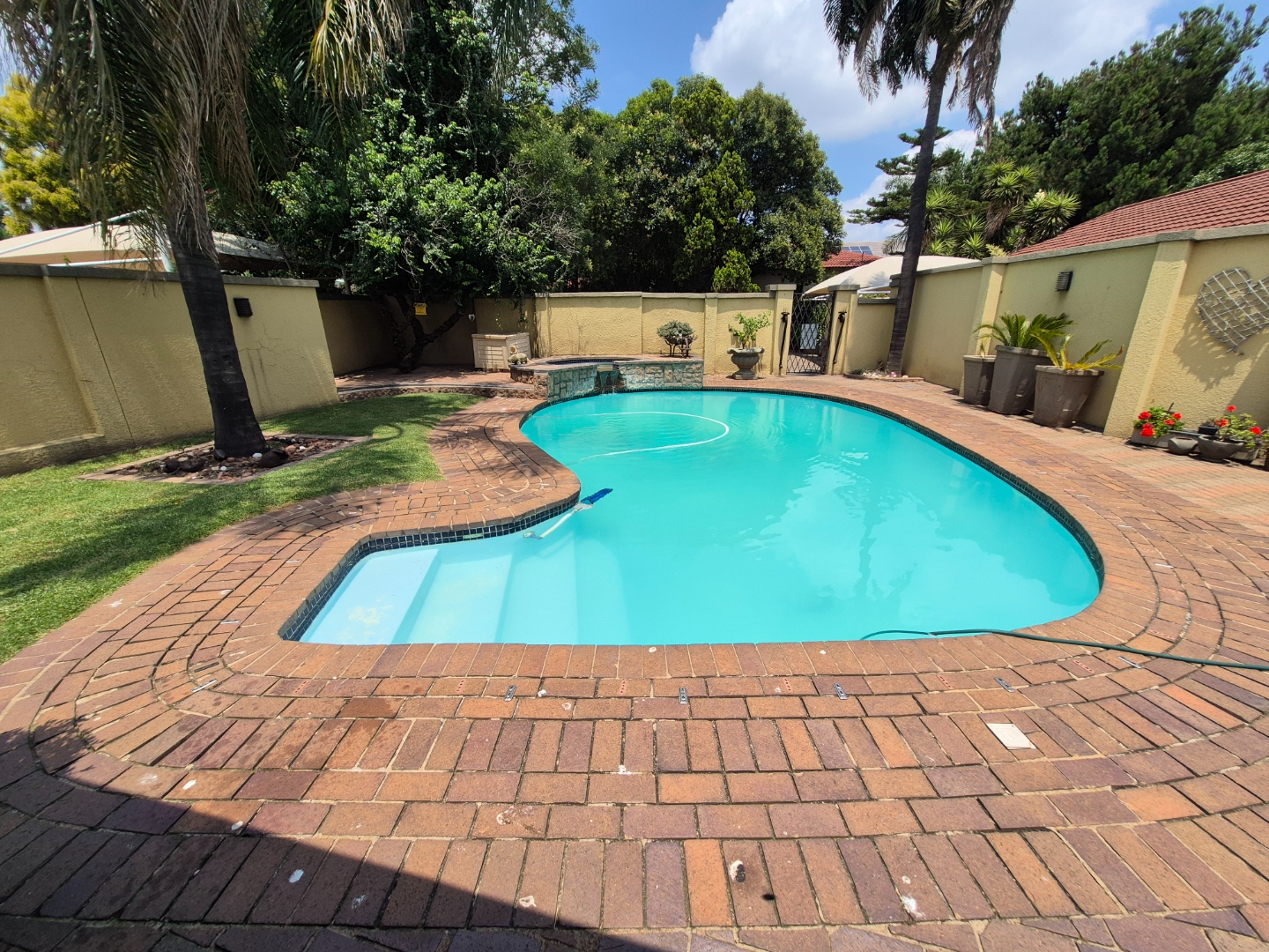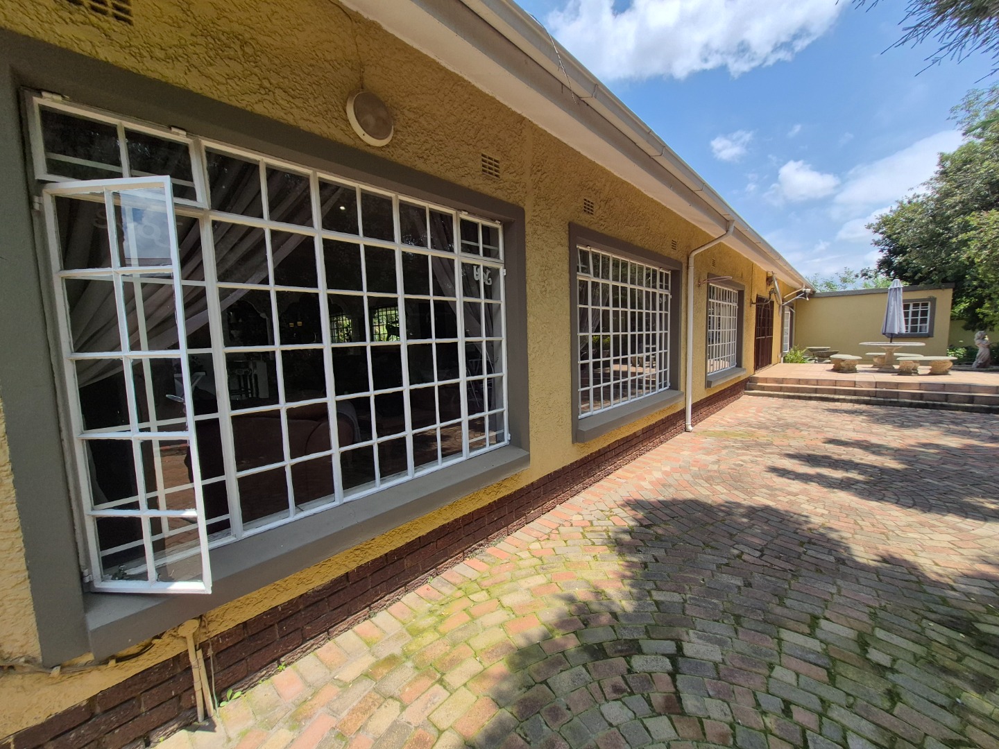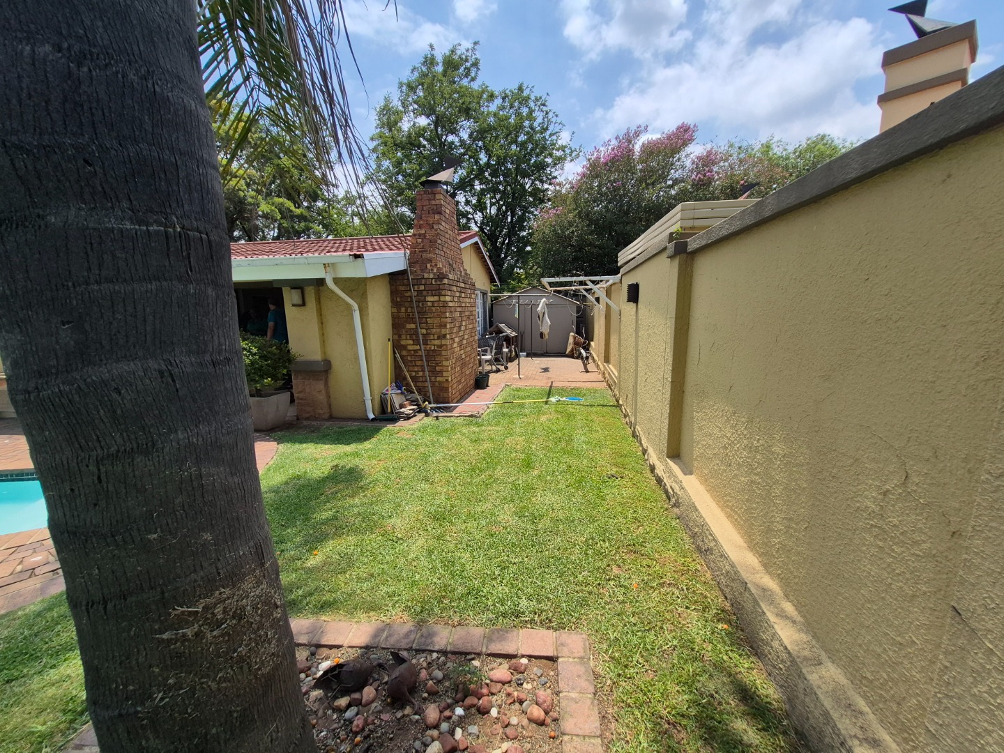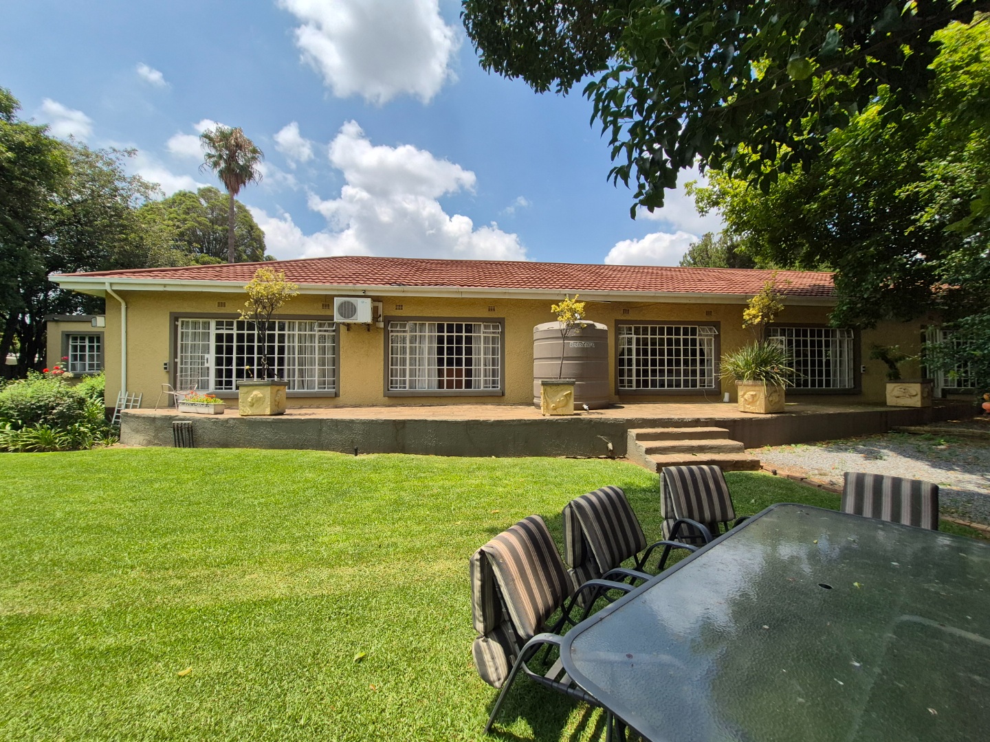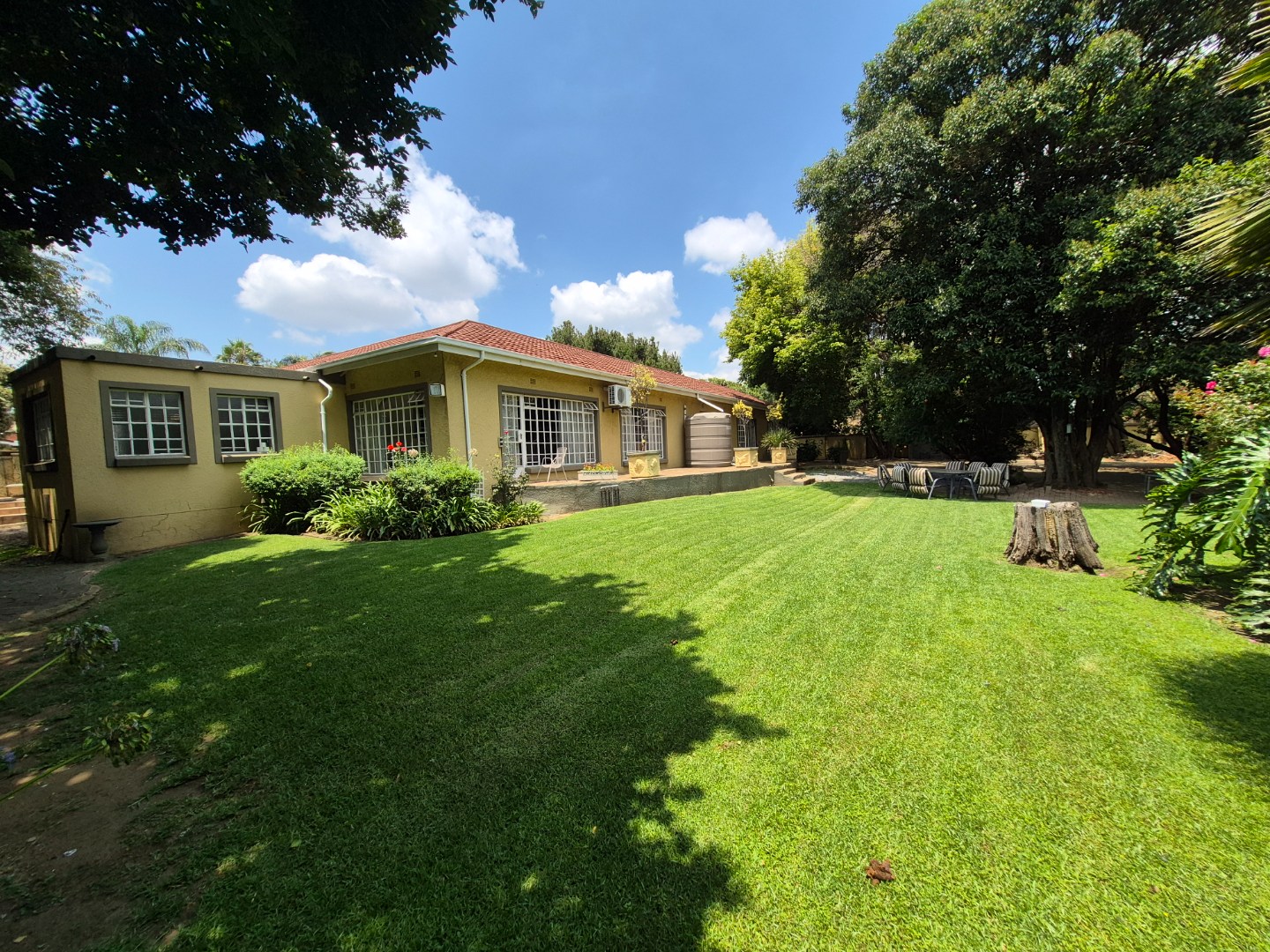 Discover this spacious family home in the established suburban area of Lambton, Germiston, South Africa. This inviting single-story residence, set on a generous 2400 sqm erf, presents welcoming kerb appeal with its light exterior, terracotta tiled roof, and mature trees. A well-maintained garden and large paved patio are perfect for outdoor entertaining and relaxation.