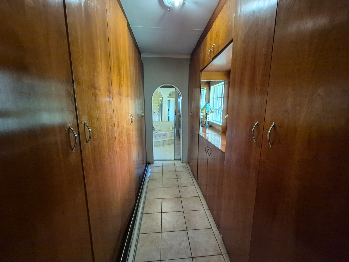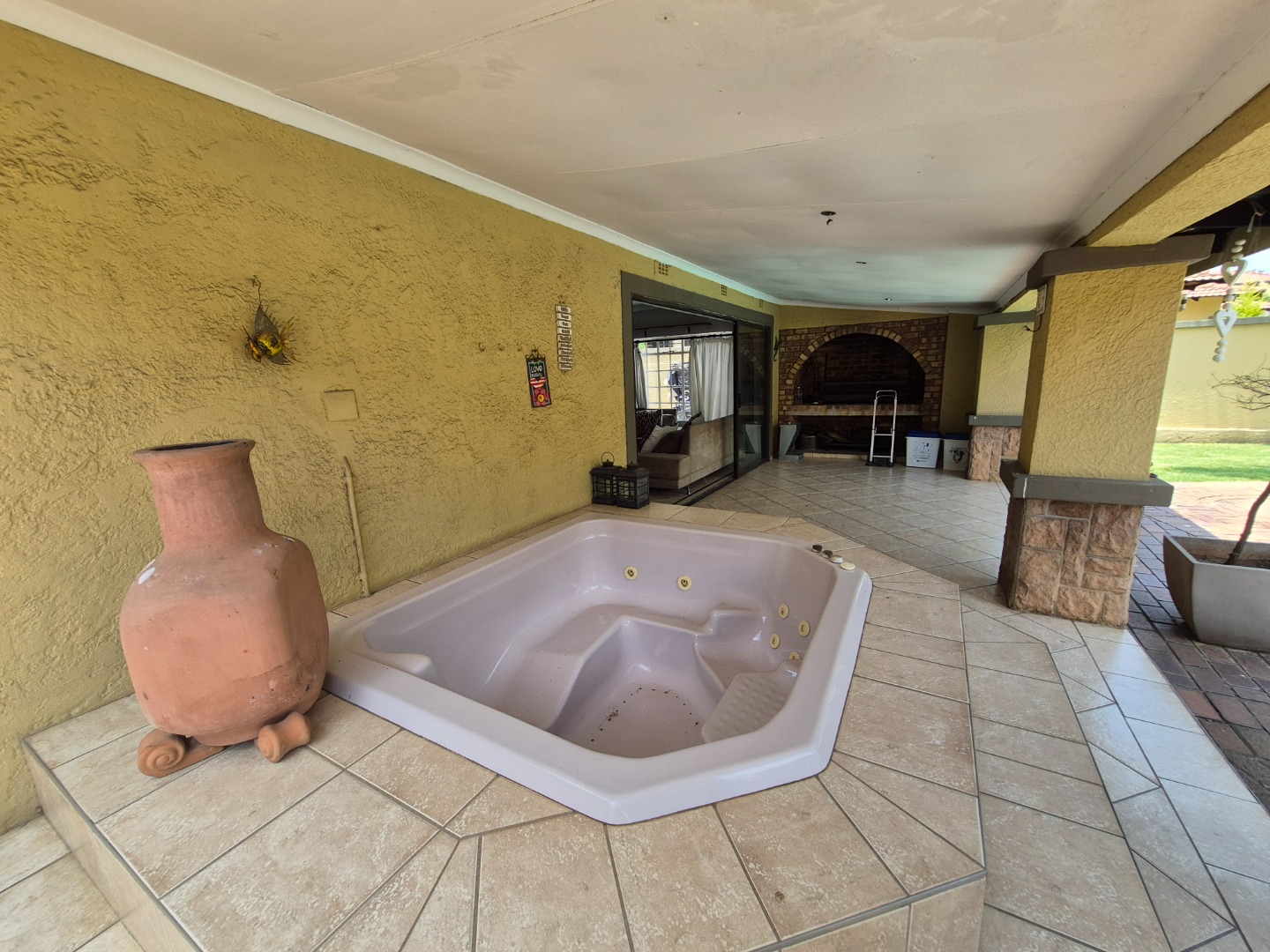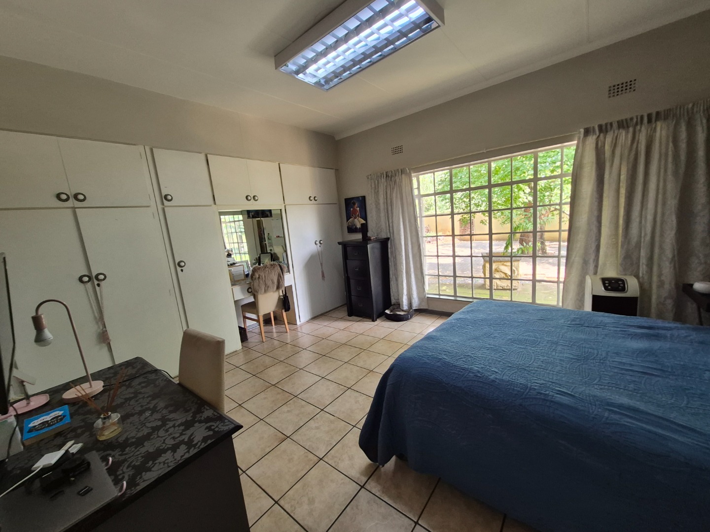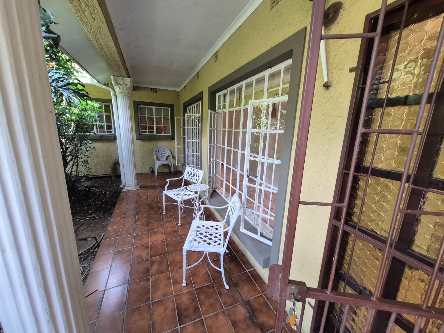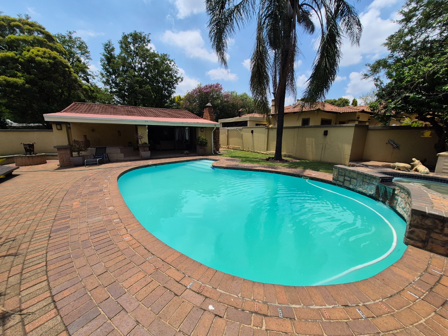 Discover this spacious family home in the established suburban area of Lambton, Germiston, South Africa. This inviting single-story residence, set on a generous 2400 sqm erf, presents welcoming kerb appeal with its light exterior, terracotta tiled roof, and mature trees. A well-maintained garden and large paved patio are perfect for outdoor entertaining and relaxation.