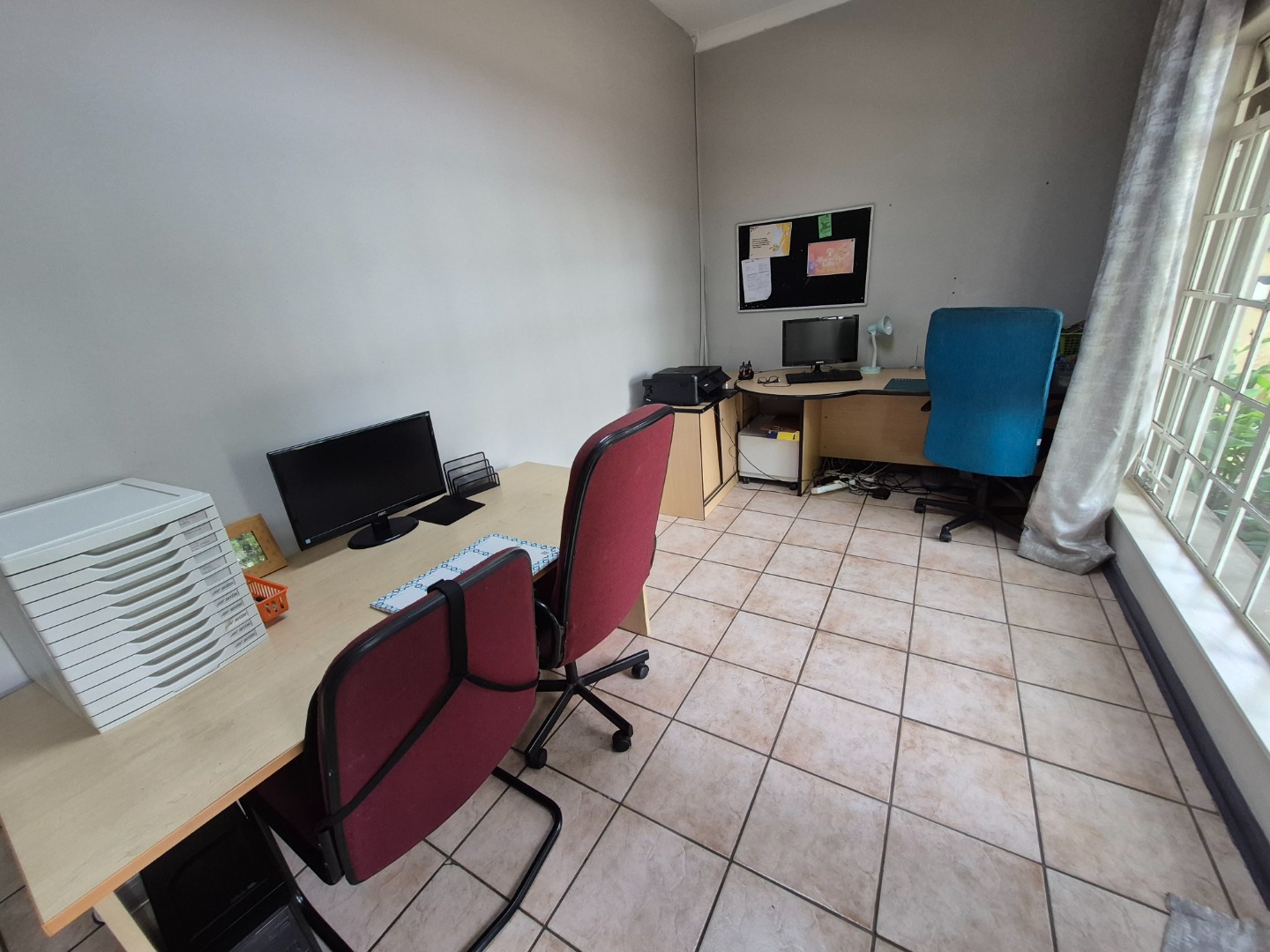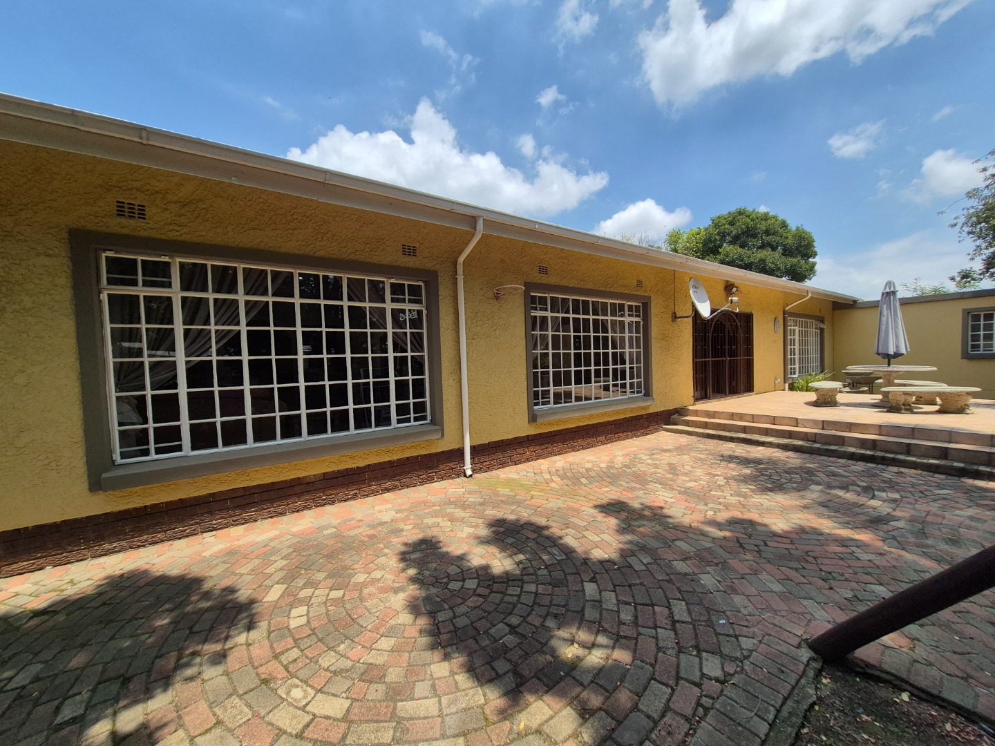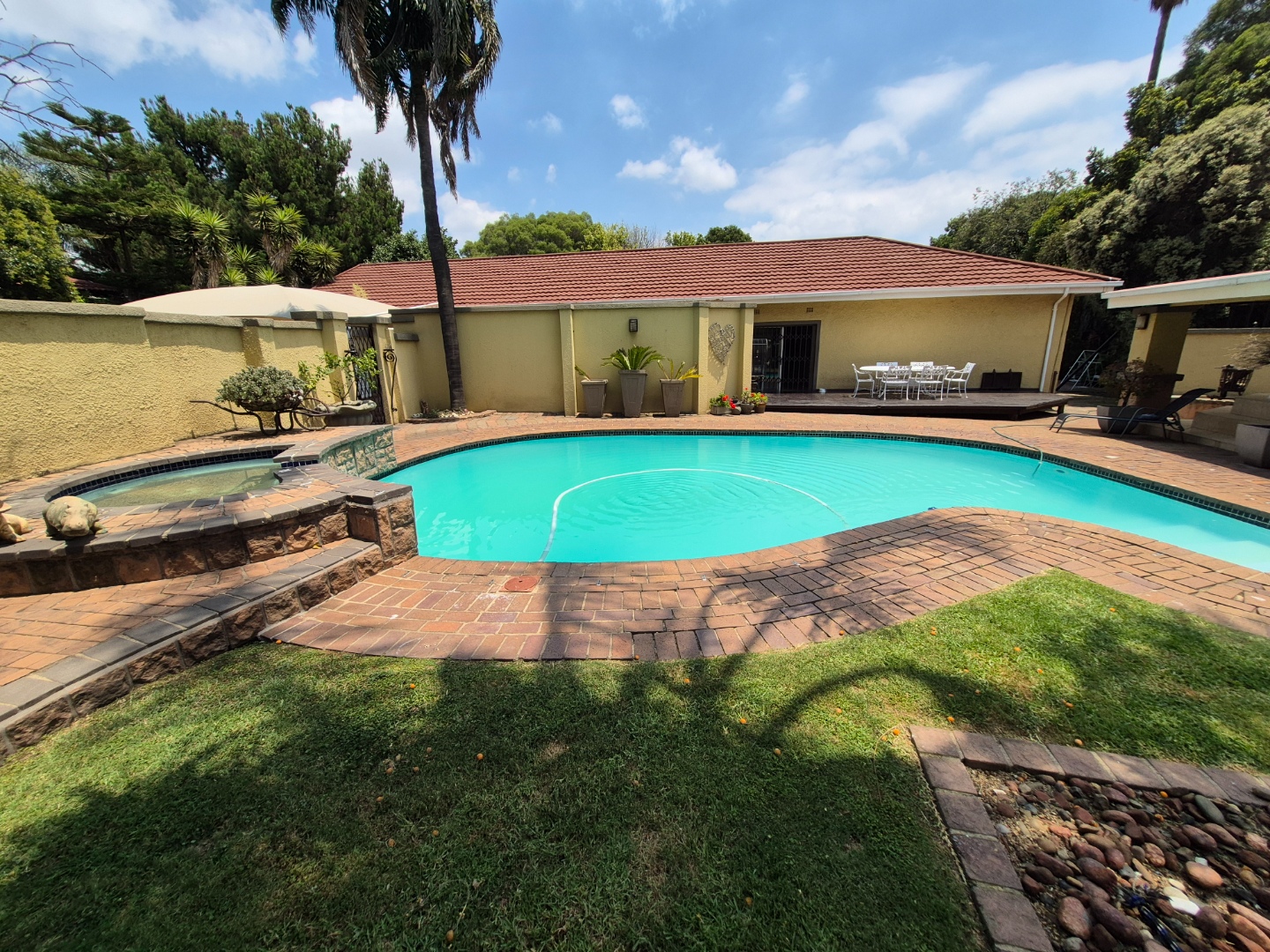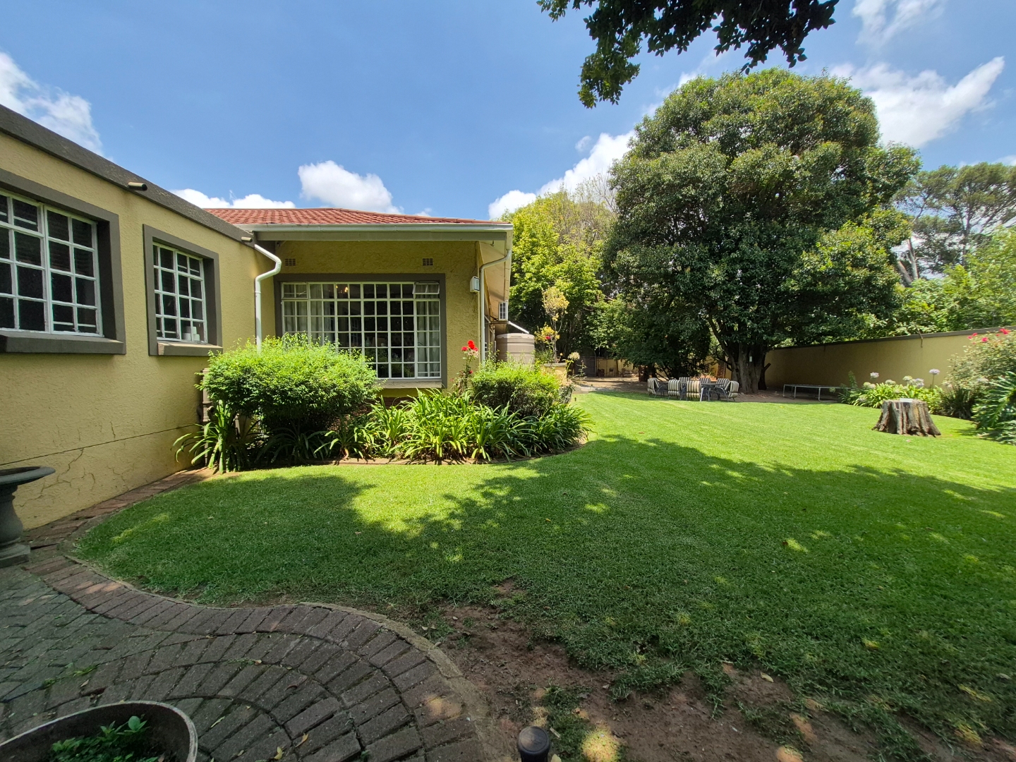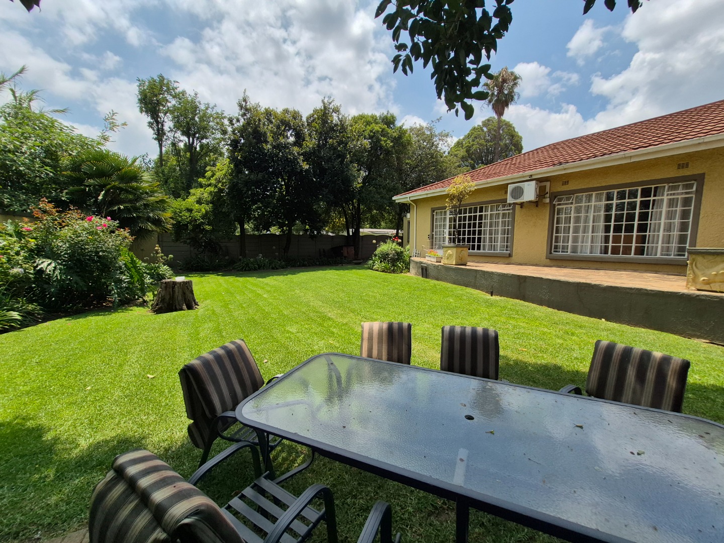 Discover this spacious family home in the established suburban area of Lambton, Germiston, South Africa. This inviting single-story residence, set on a generous 2400 sqm erf, presents welcoming kerb appeal with its light exterior, terracotta tiled roof, and mature trees. A well-maintained garden and large paved patio are perfect for outdoor entertaining and relaxation.