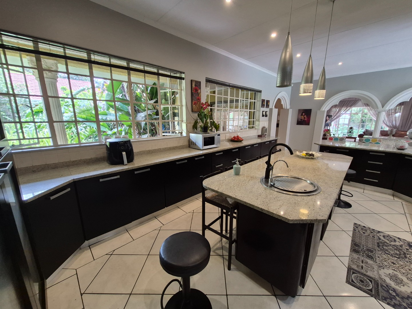 Step inside to an interior designed for comfortable living. An open-plan layout with elegant architectural arches defines the living and dining areas, creating a seamless flow. The heart of the home is a modern kitchen, equipped with sleek dark cabinetry, granite countertops, two functional islands for prep and seating, stainless steel appliances, and excellent lighting. A practical utility area and a dedicated family TV room add to the home's versatility.