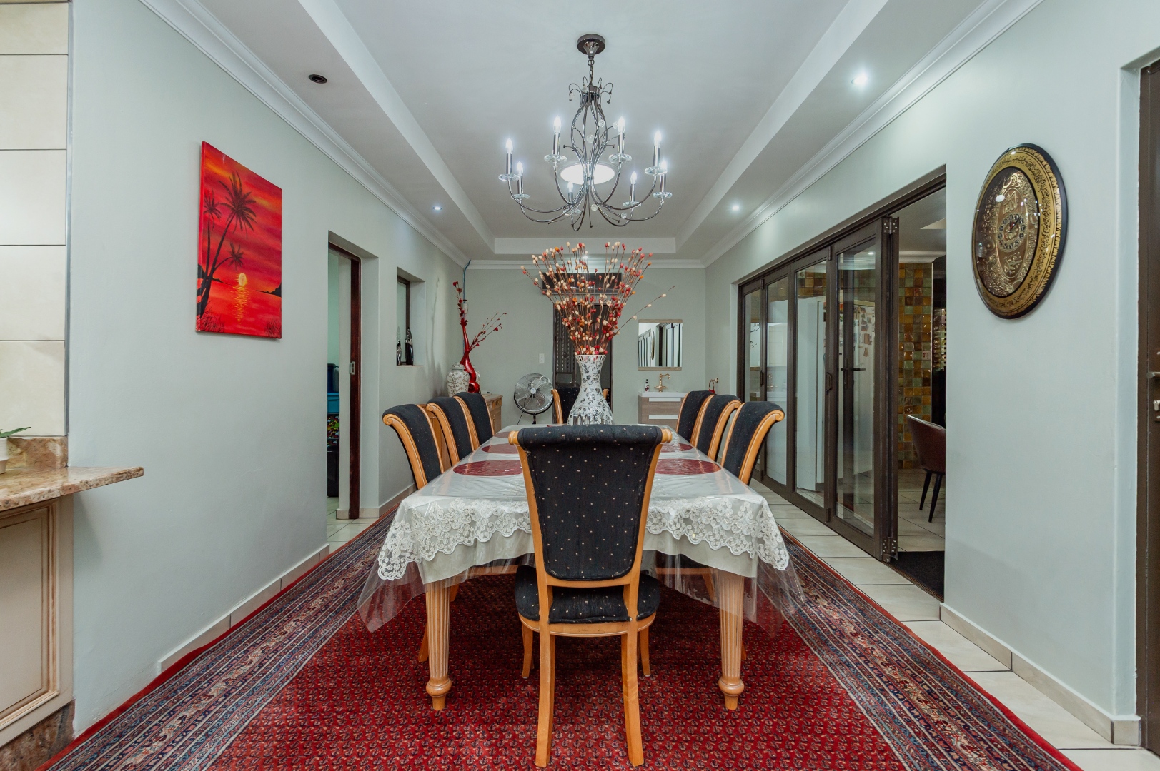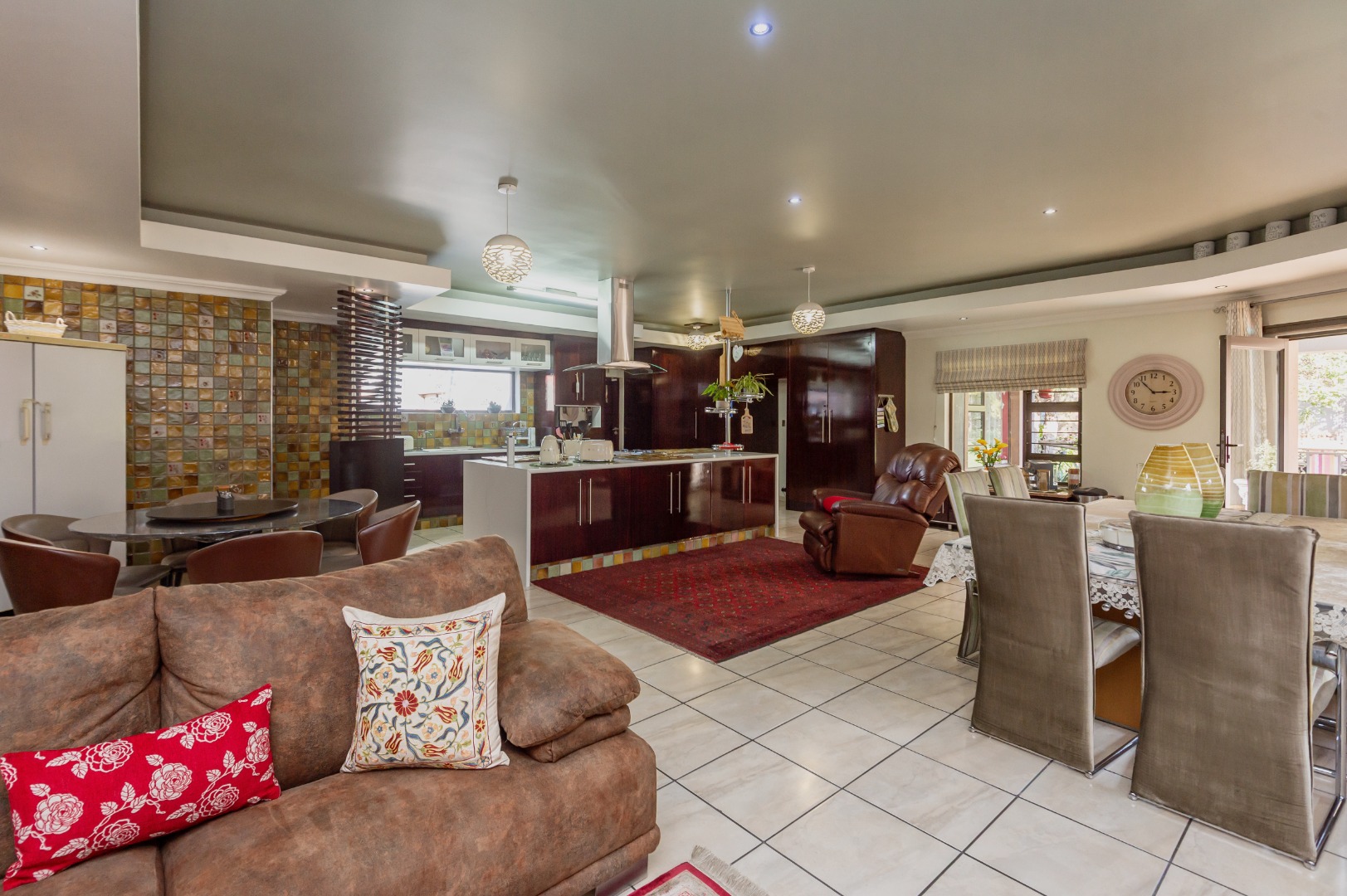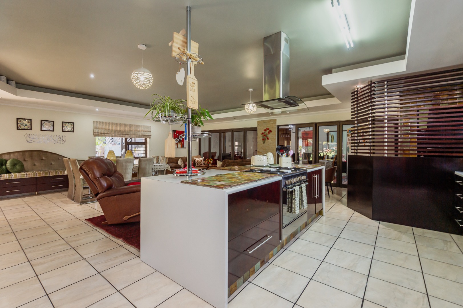 The interior offers versatile living with two spacious lounges, a dedicated dining room, and a family TV room, providing abundant space for relaxation and entertainment. The property features two functional kitchens, one with a U-shaped layout, granite countertops, and built-in appliances, and another L-shaped kitchen, both equipped with a scullery and pantry for optimal storage and preparation. Tiled flooring flows throughout the main living areas, enhancing durability and ease of maintenance. An inviting entrance hall and a guest toilet add to the home's practical layout.