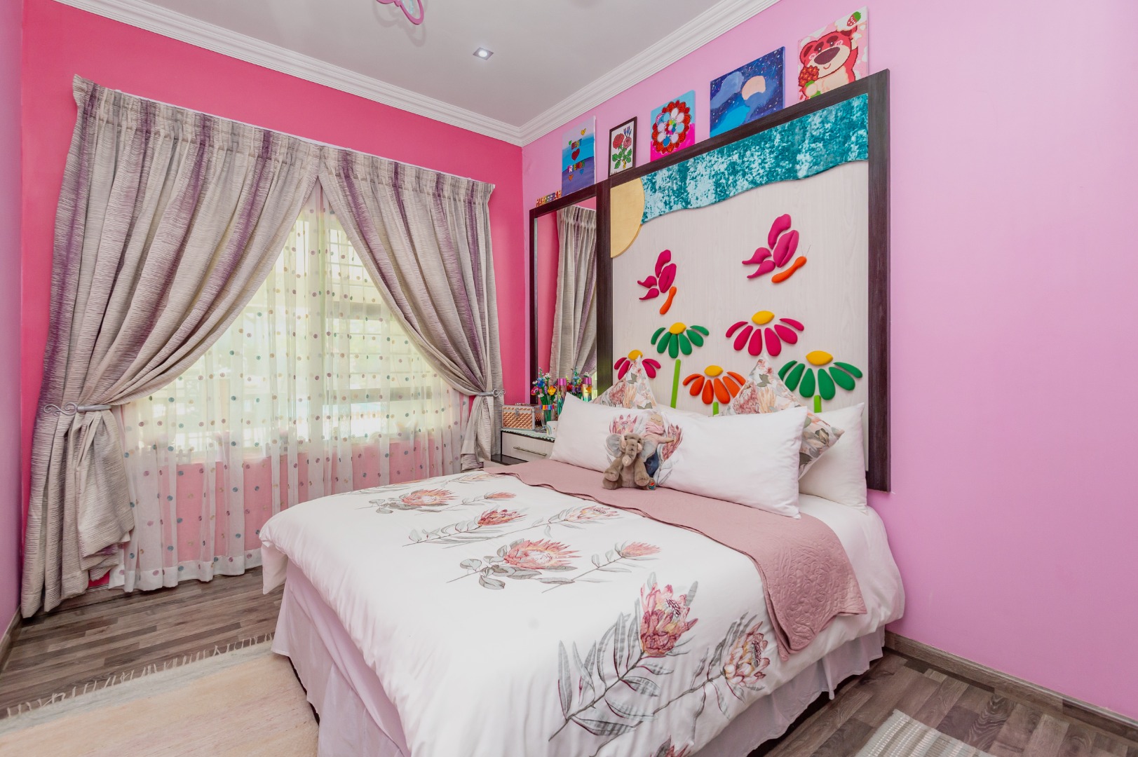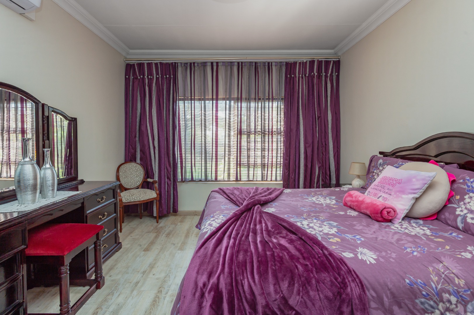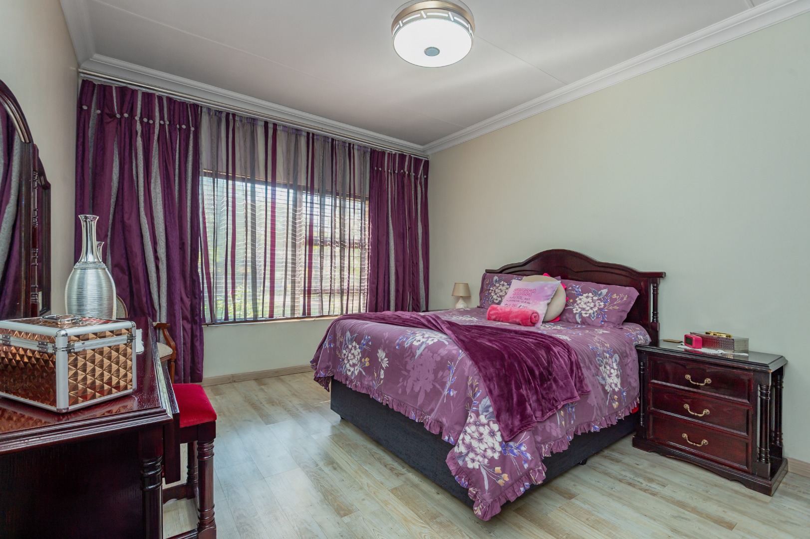 Accommodation comprises 6 well-proportioned bedrooms and three bathrooms, including a private en-suite, The bedrooms feature light wood-look flooring and large windows, creating bright and airy spaces.