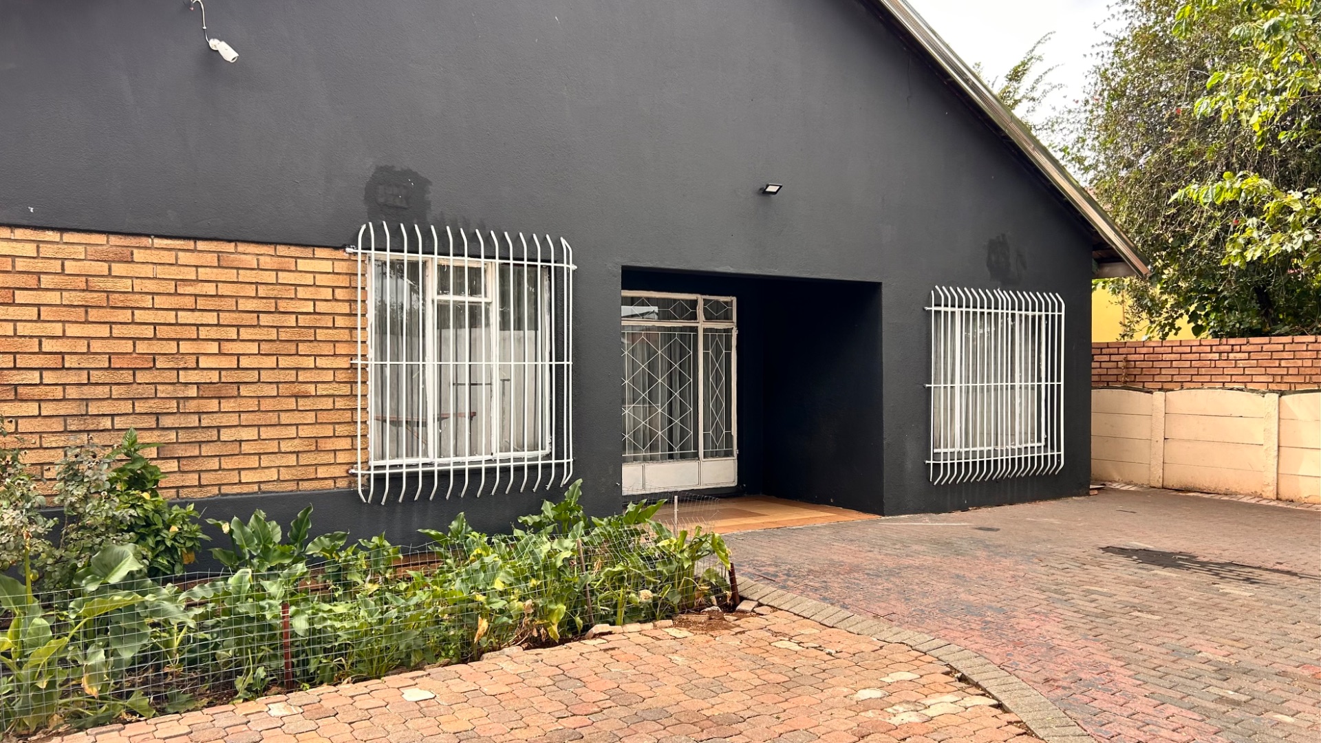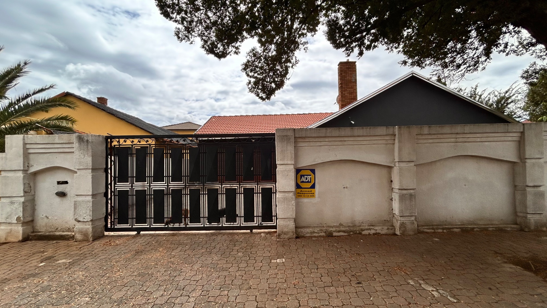 This impressive residential property in Leondale, Germiston, presents a striking first impression with its modern dark grey exterior paint complemented by a well-maintained red tiled roof. The frontage features a large double wooden garage door and a paved driveway, offering ample parking. Visible security bars on windows and a security camera underscore the home's commitment to safety, providing peace of mind for residents.