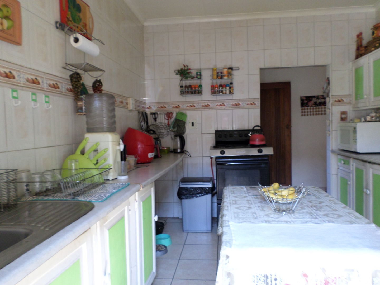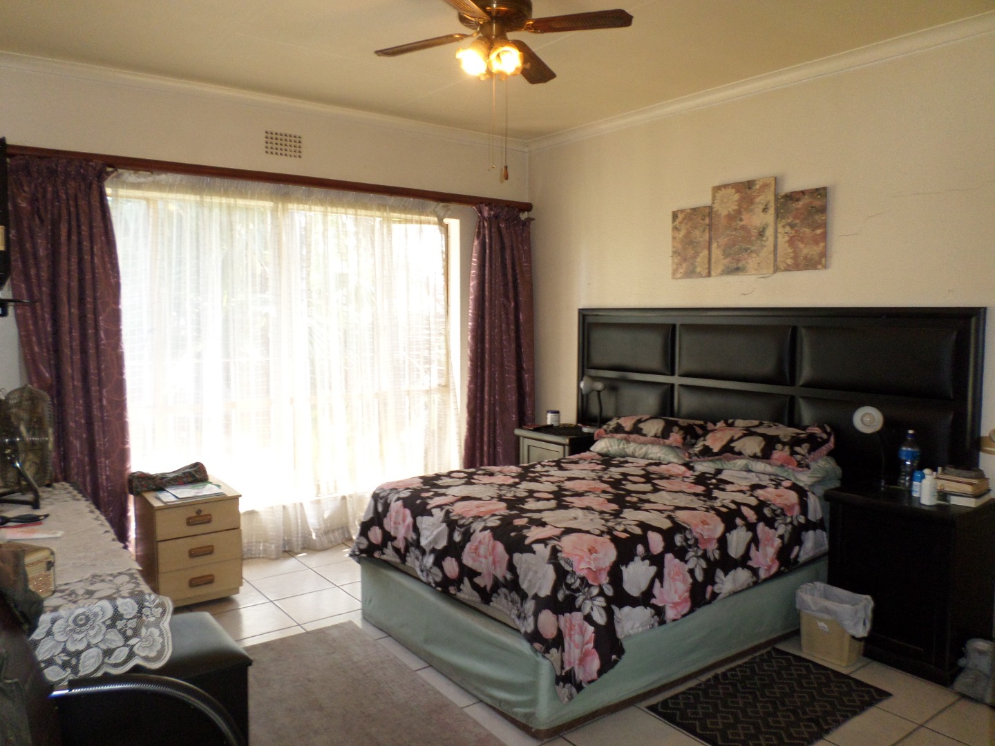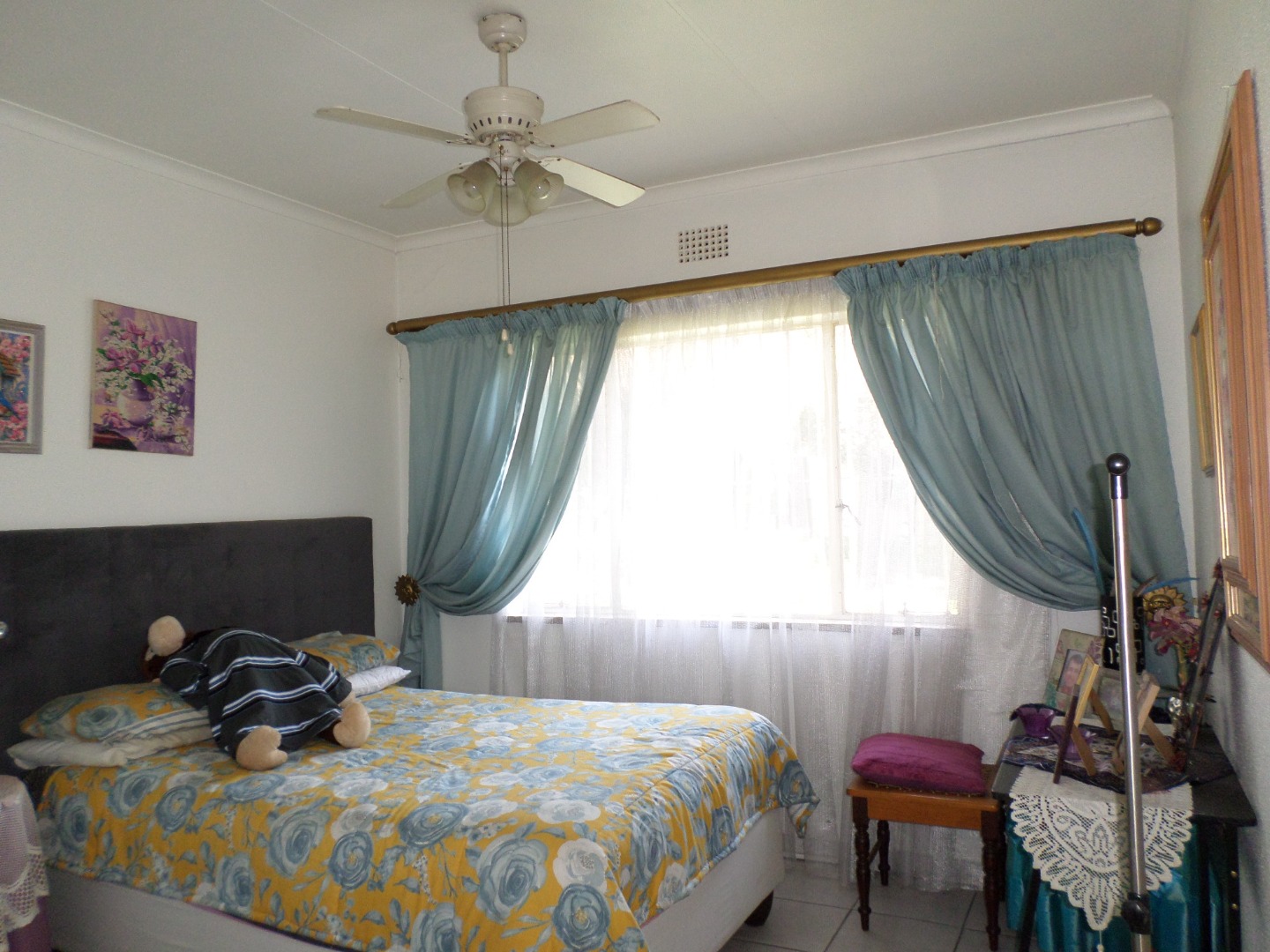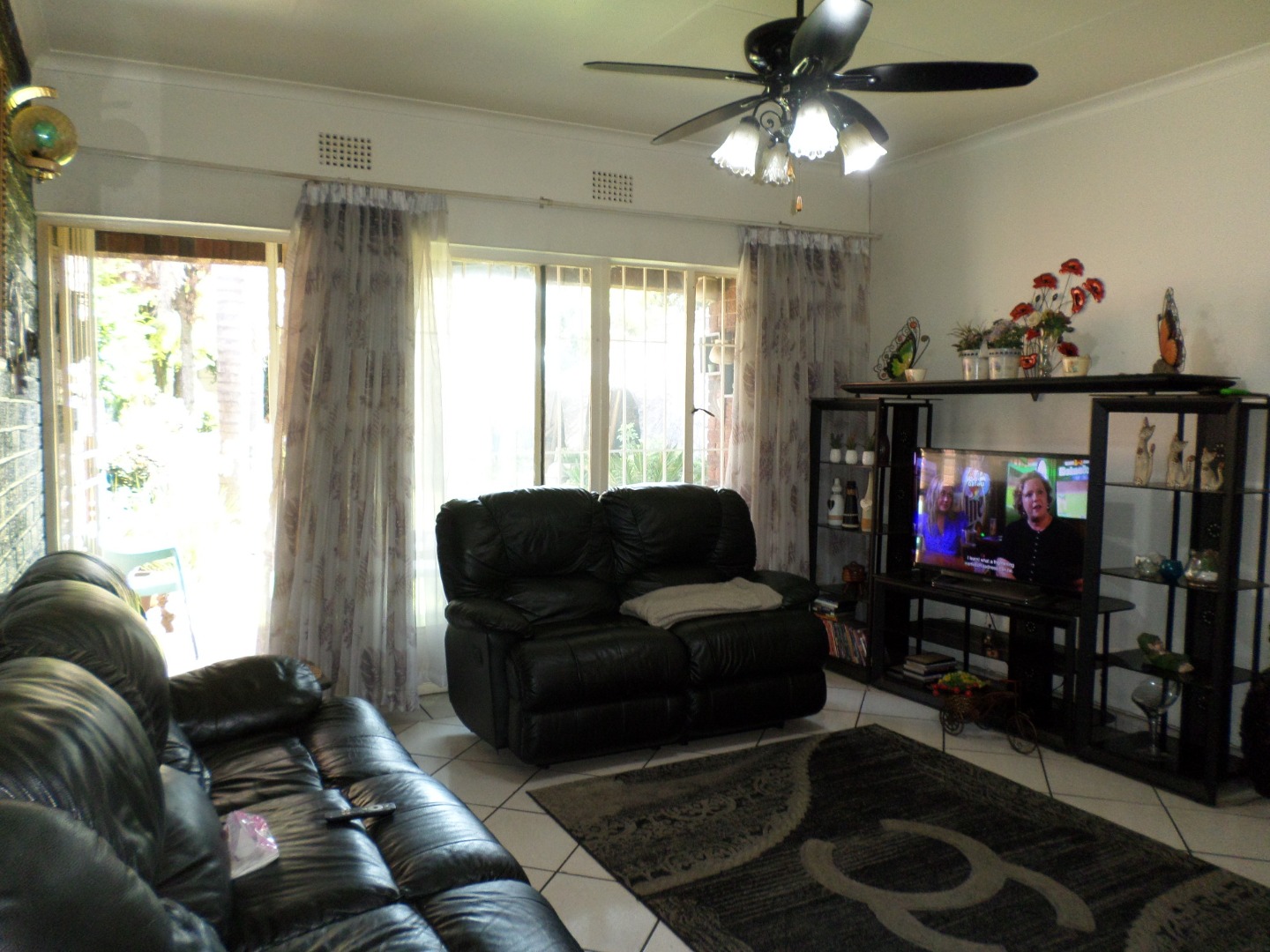 The interior features a functional layout with tiled flooring throughout, ensuring easy maintenance. The living room is bathed in natural light from large windows and a glass sliding door, which also provides access to the outdoor areas. Architectural charm is evident with arched doorways, and a ceiling fan ensures comfort. The kitchen, also fully tiled, offers built- in cupboards and leads out to a court yard area.