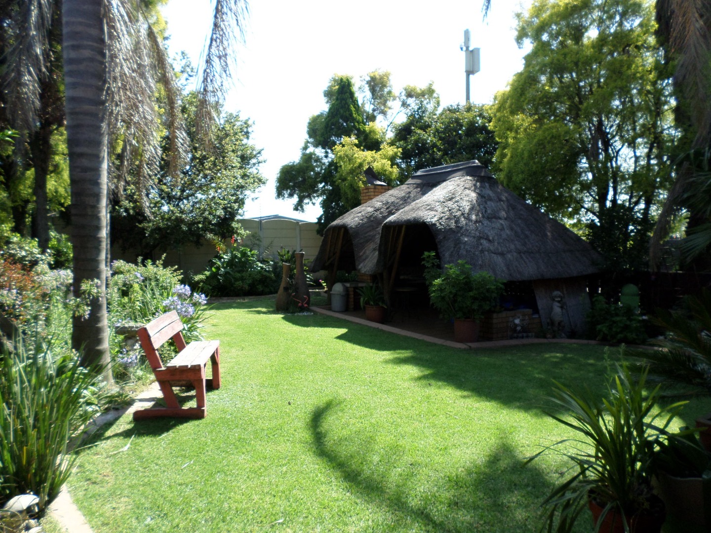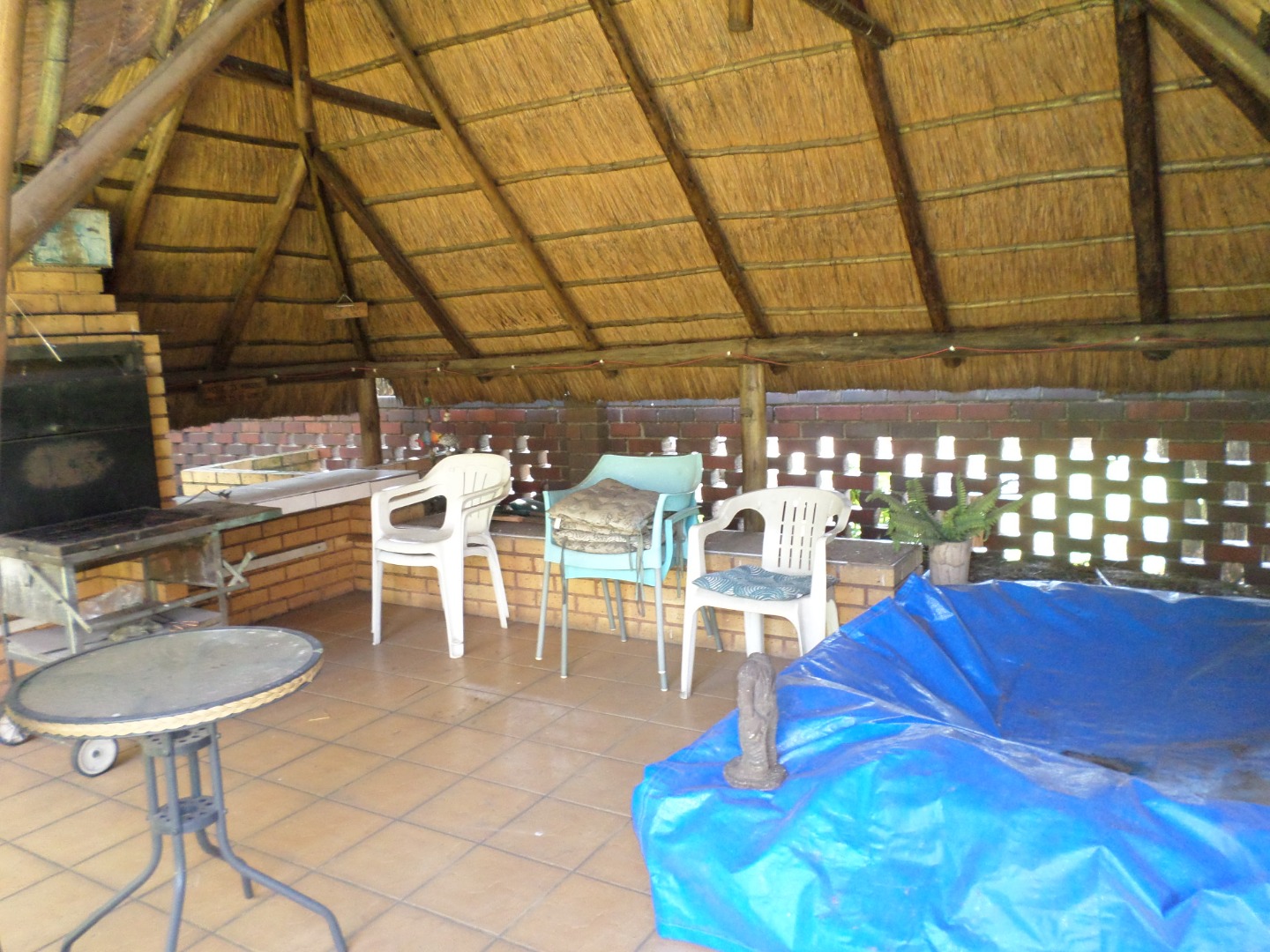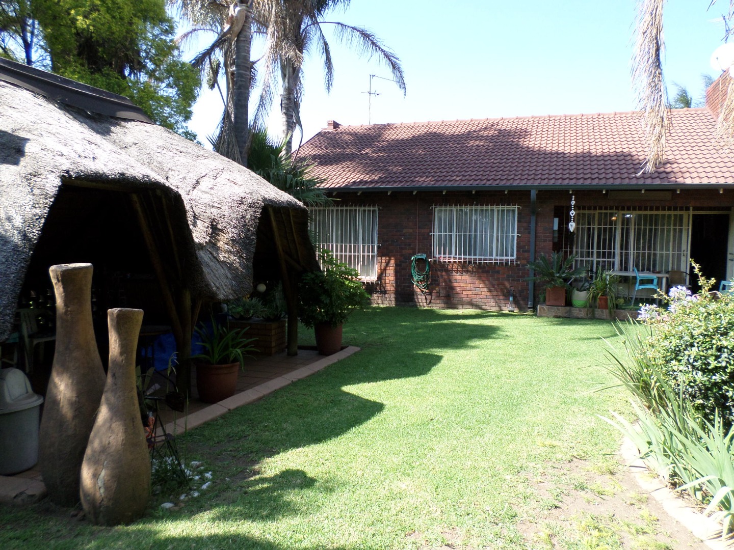 Step outside to a private oasis designed for relaxation and entertainment. The distinctive thatched lapa stands as a focal point, perfect for hosting gatherings or enjoying quiet moments. Abundant tropical landscaping creates a serene atmosphere, while a built-in braai and a jacuzzi promise endless outdoor enjoyment. Pets are allowed, making this an ideal space for animal lovers.