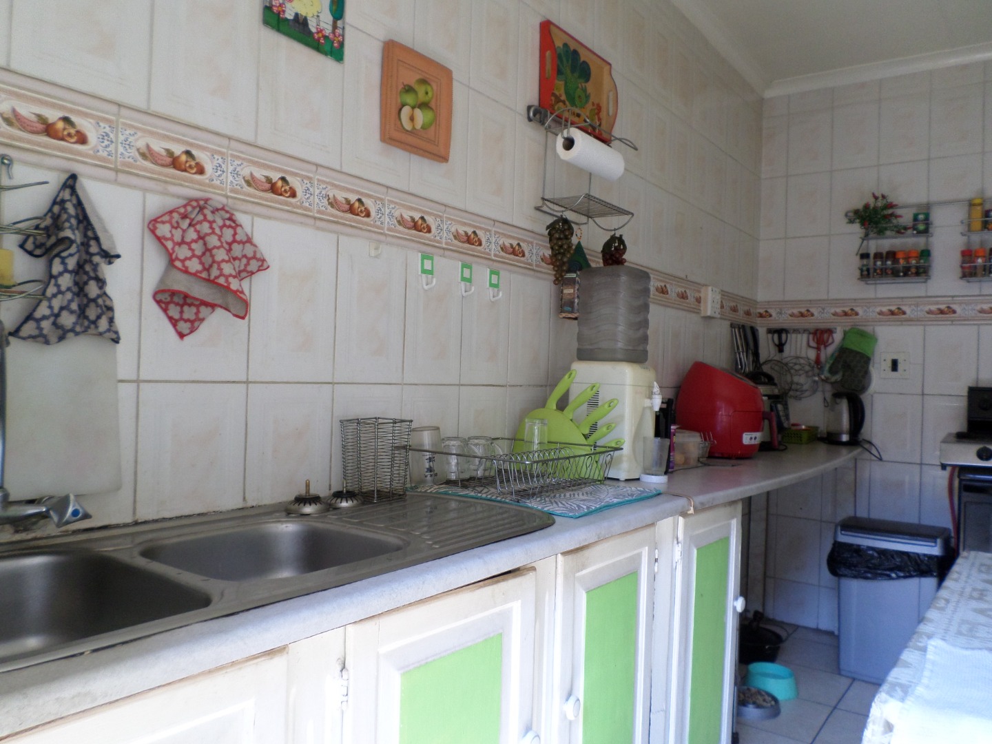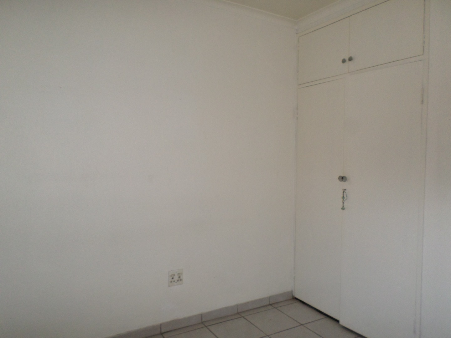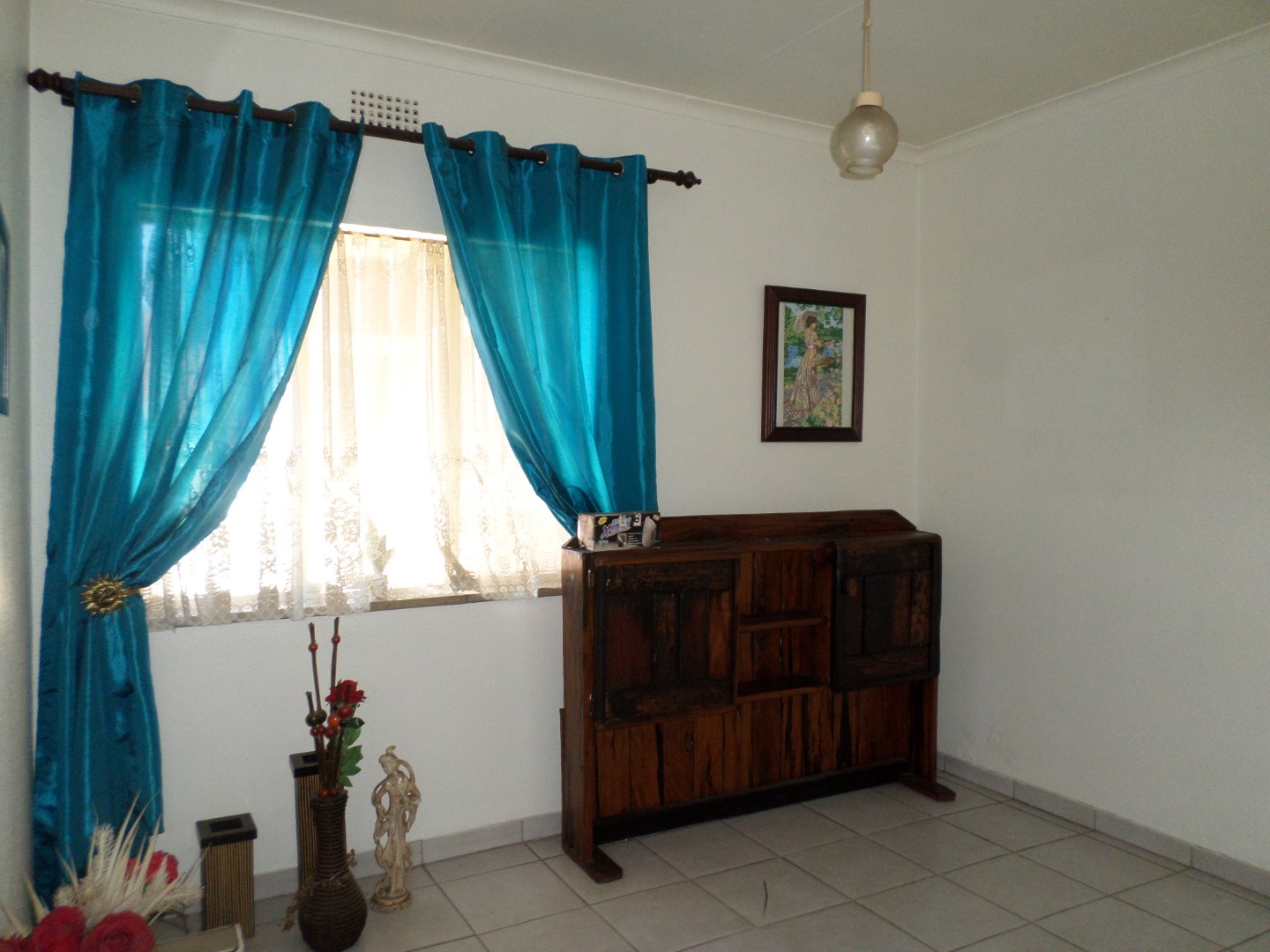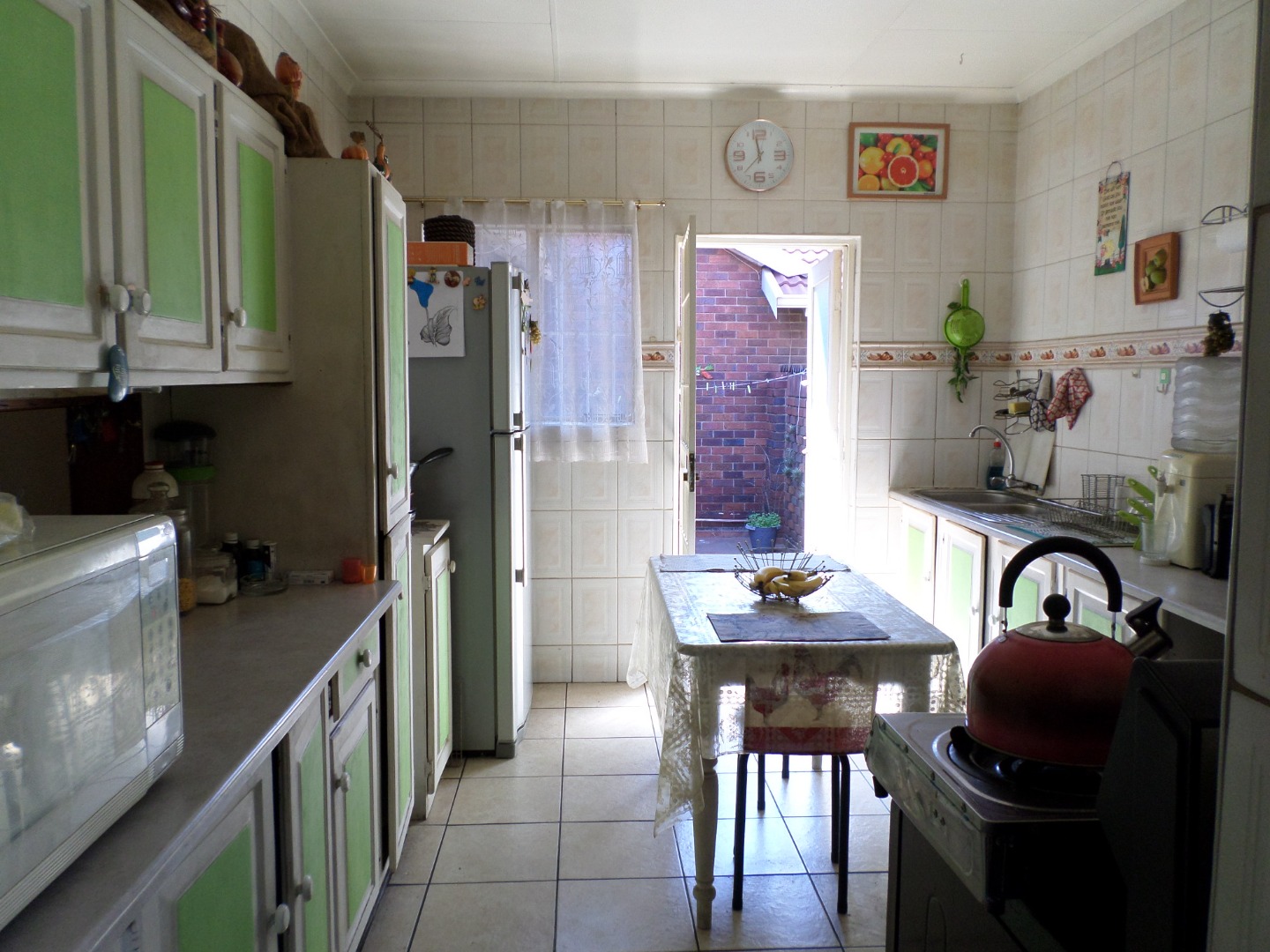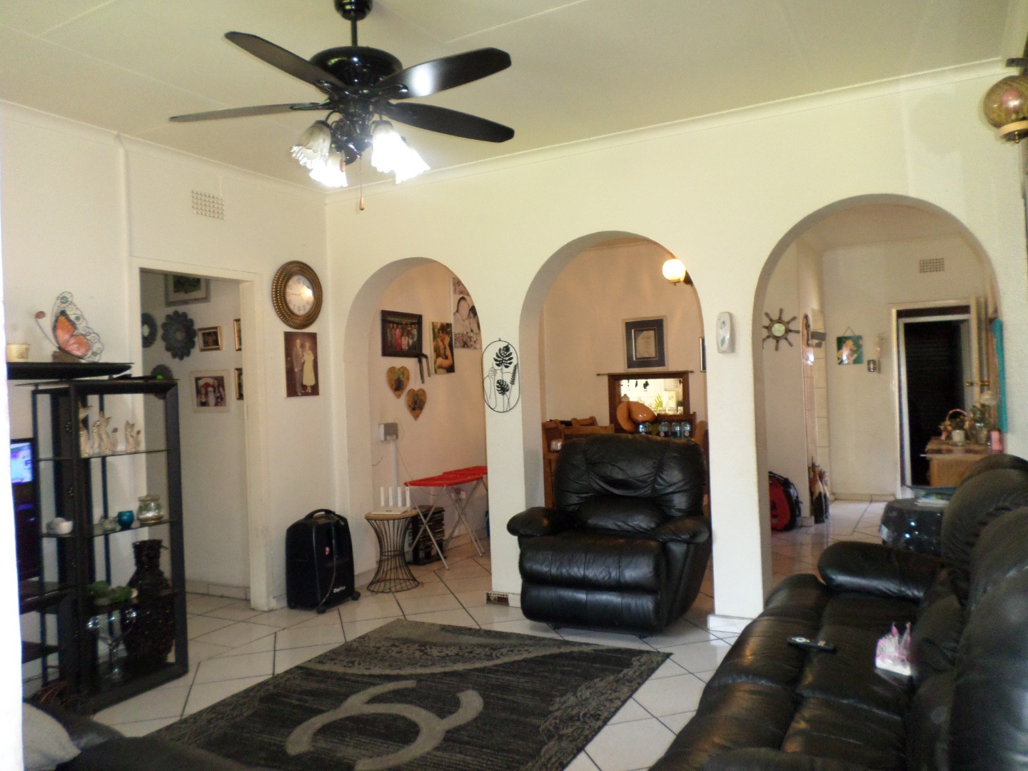 The interior features a functional layout with tiled flooring throughout, ensuring easy maintenance. The living room is bathed in natural light from large windows and a glass sliding door, which also provides access to the outdoor areas. Architectural charm is evident with arched doorways, and a ceiling fan ensures comfort. The kitchen, also fully tiled, offers built- in cupboards and leads out to a court yard area.