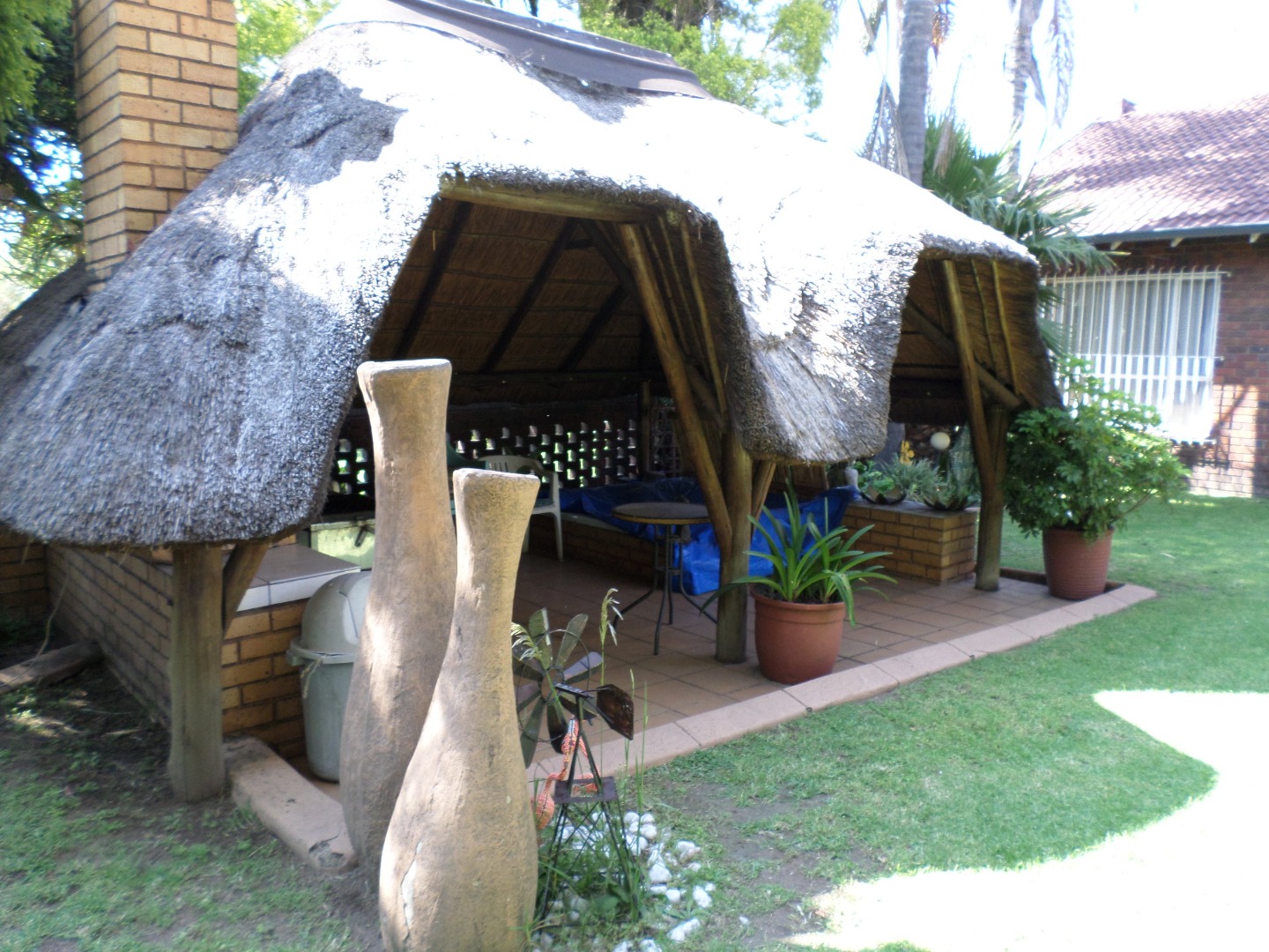 Step outside to a private oasis designed for relaxation and entertainment. The distinctive thatched lapa stands as a focal point, perfect for hosting gatherings or enjoying quiet moments. Abundant tropical landscaping creates a serene atmosphere, while a built-in braai and a jacuzzi promise endless outdoor enjoyment. Pets are allowed, making this an ideal space for animal lovers.