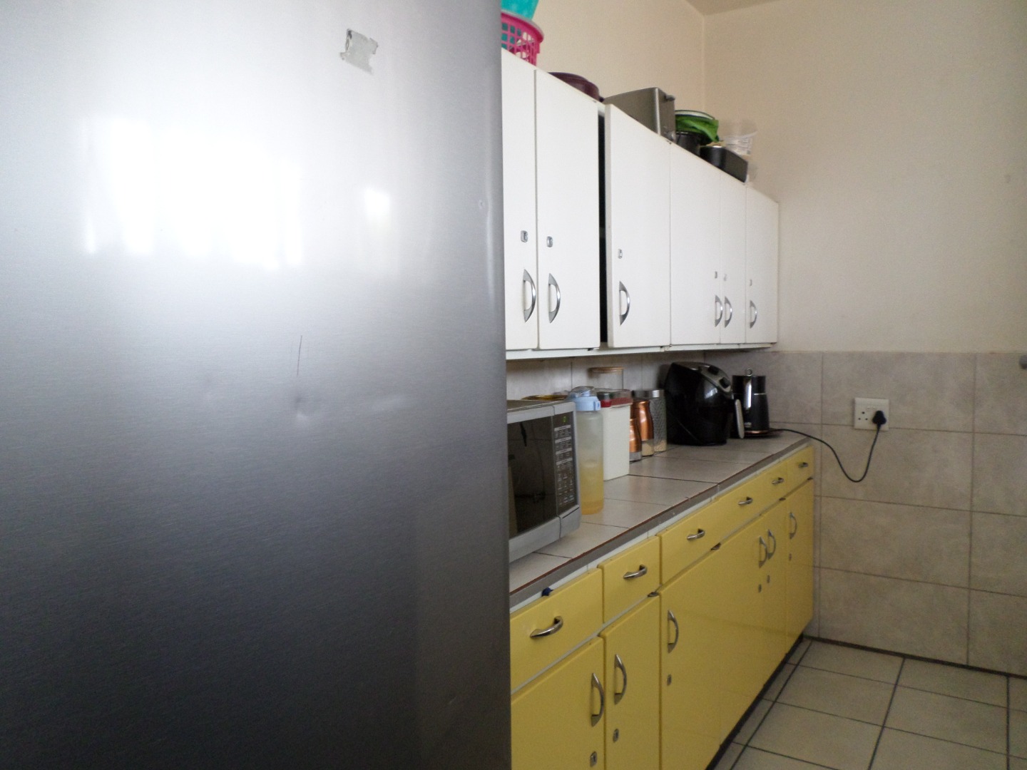 Step inside to a functional interior featuring tiled flooring throughout, ensuring easy maintenance. The apartment comprises a dedicated lounge and a dining room, providing distinct spaces for relaxation and meals. Natural light floods the living areas through large windows, creating a bright and inviting atmosphere. The compact kitchen is equipped with built-in cupboards, and tiled floors.