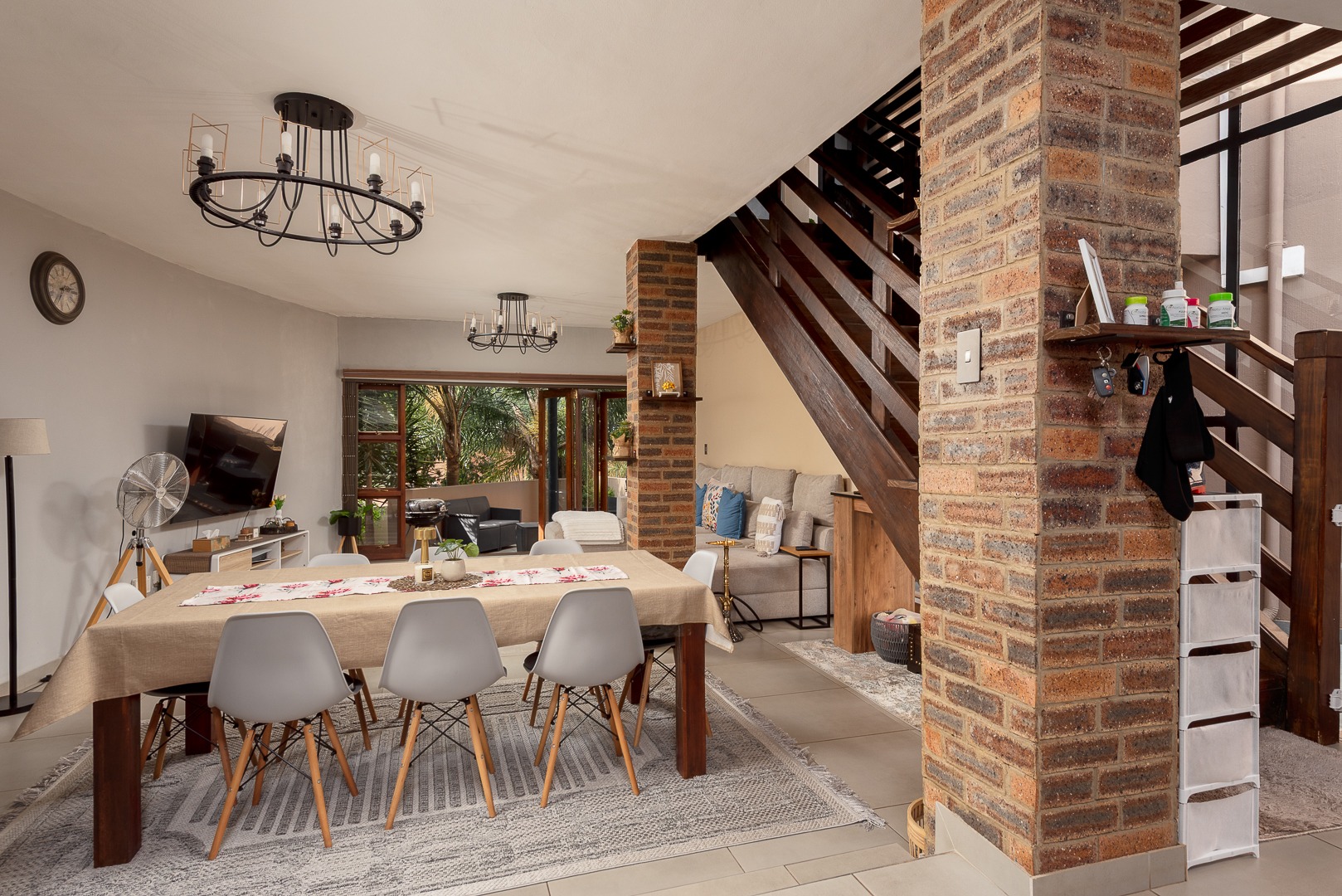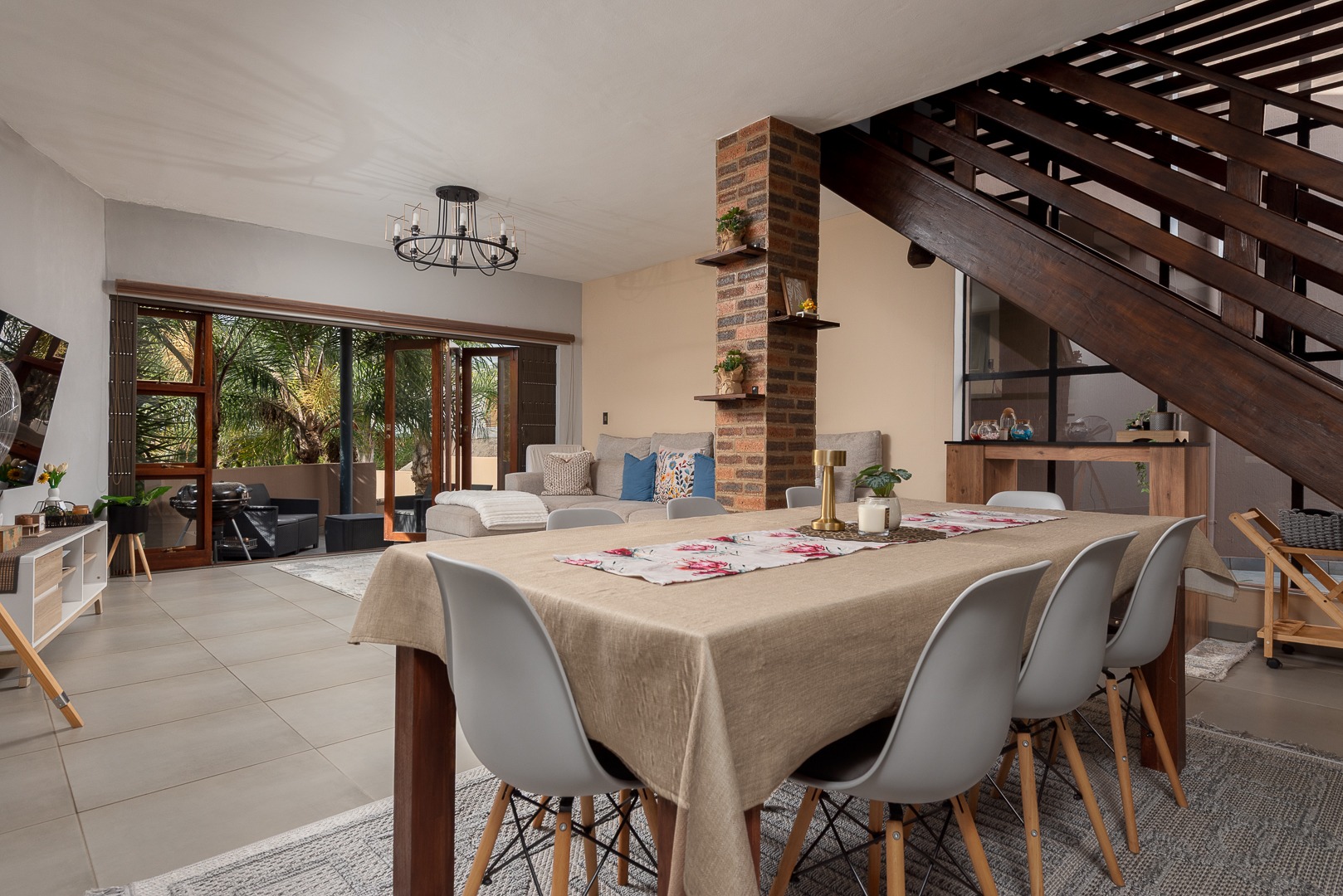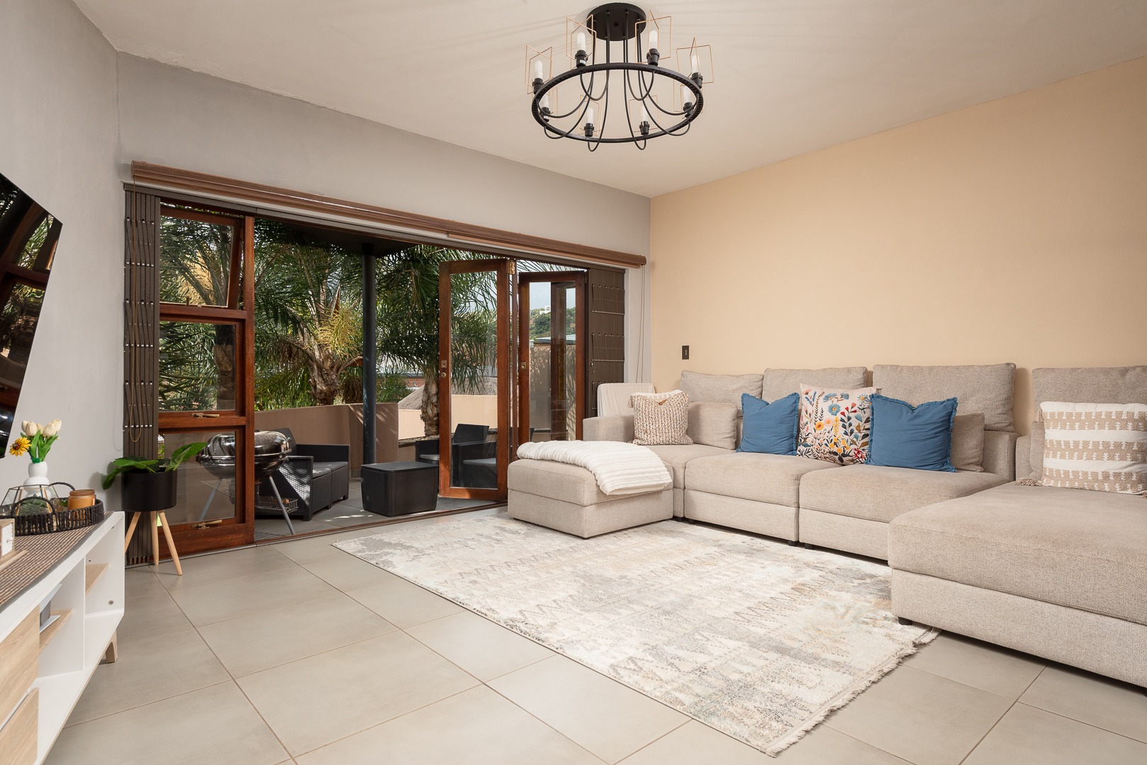 The spacious lounge flows seamlessly into a covered patio with garden trellidoors, creating the perfect indoor-outdoor living space, while a separate dining area offers an ideal setting for entertaining. A guest loo adds to the home’s practicality.