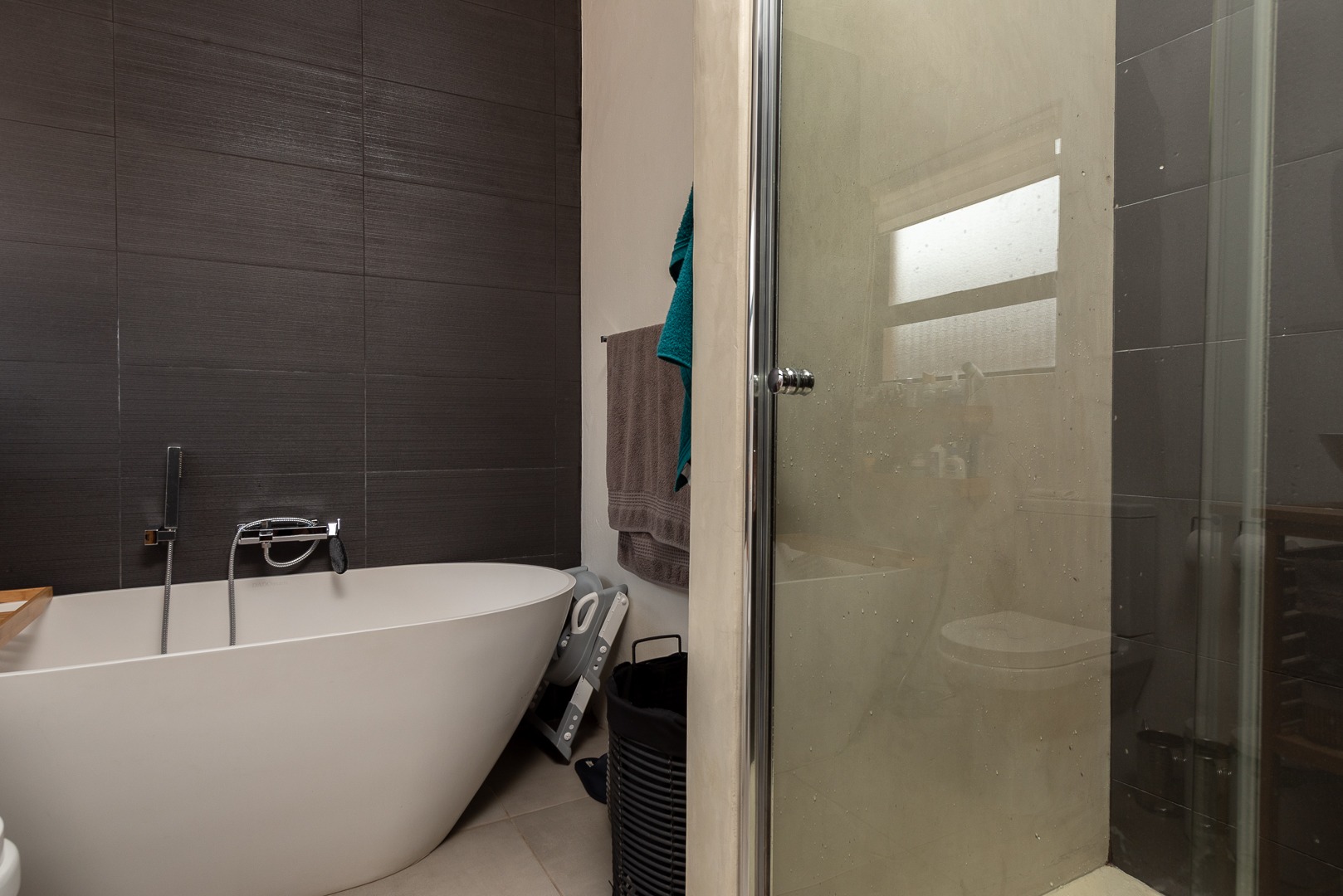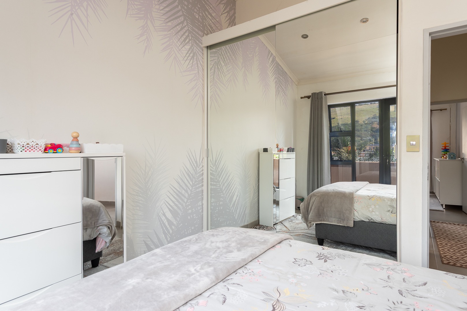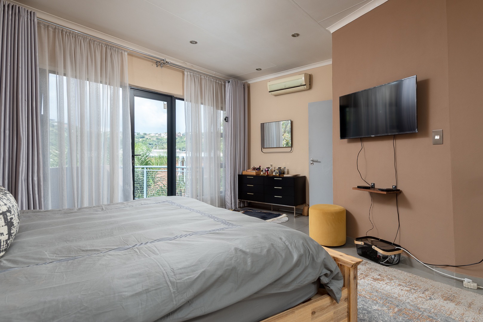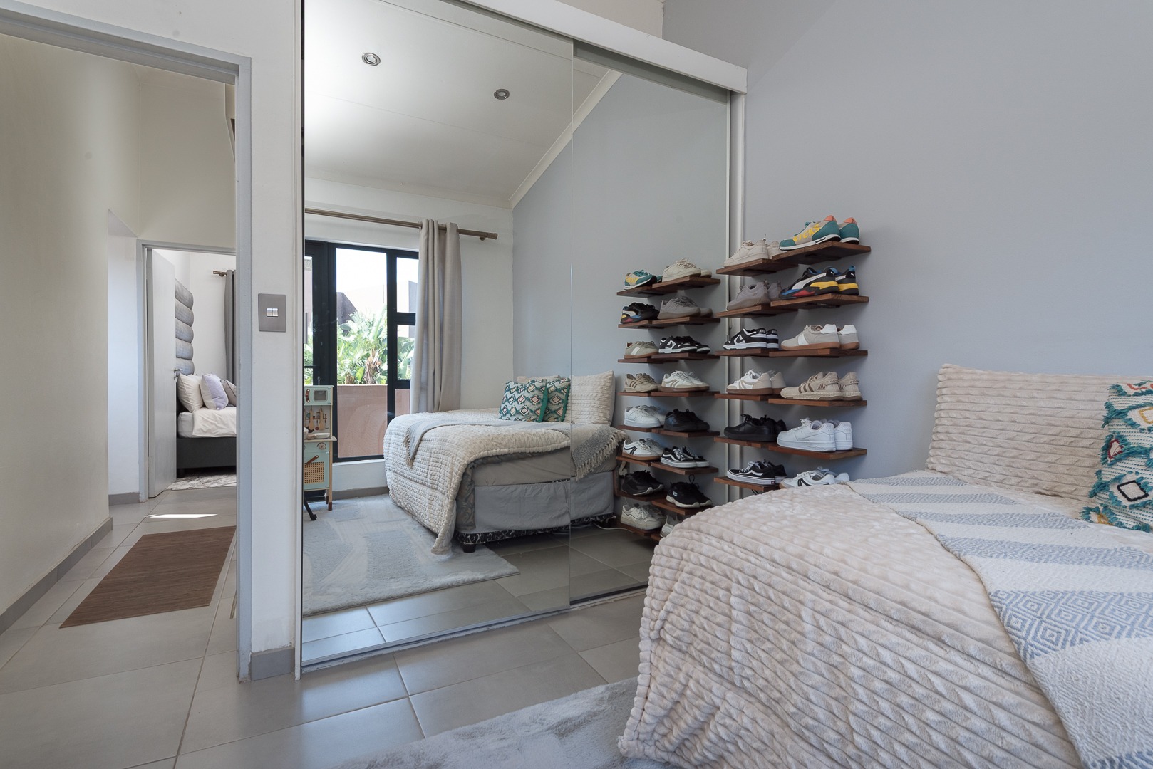 Upstairs, the main bedroom is a tranquil retreat with mirrored sliding cupboards, leading into a luxurious en-suite bathroom featuring a freestanding bath and shower, plus access to a private balcony. The second and third bedrooms are both generously sized with high-volume ceilings, mirrored cupboards, and their own balconies. A modern shared bathroom includes a shower and skylight, allowing for beautiful natural light.