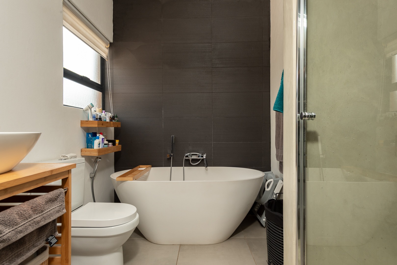 The kitchen is a standout feature, fitted with sleek Caesarstone countertops, a central island, a 5-burner gas stove with electric oven, space for a double-door fridge and three appliances, as well as a walk-in pantry and water filtration system. A private courtyard completes this functional space.