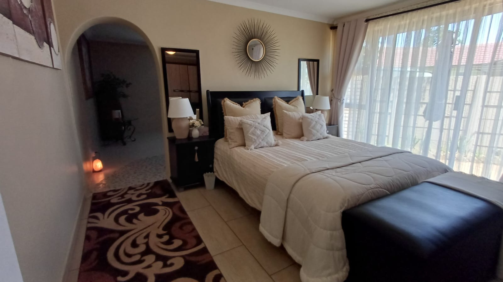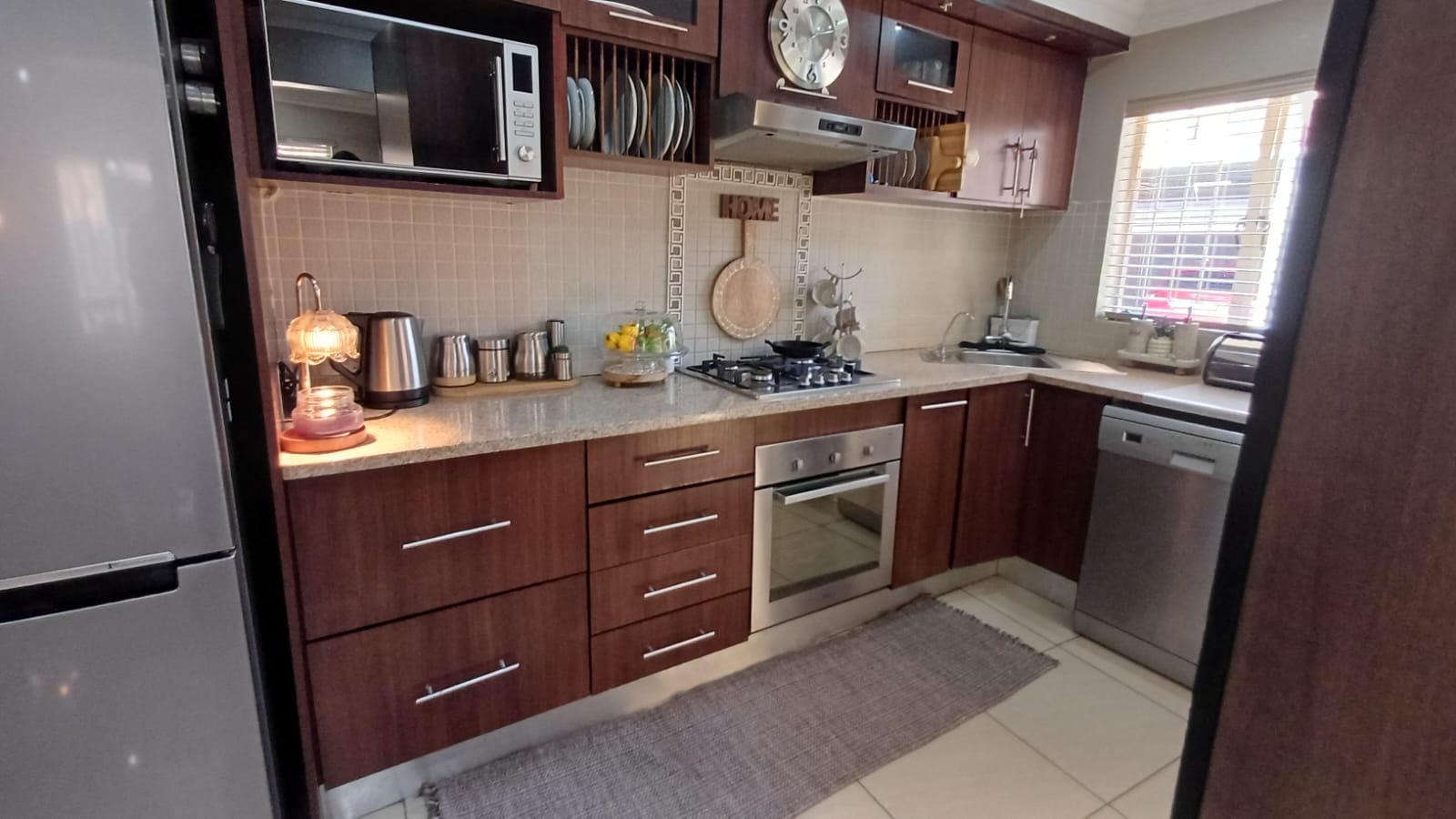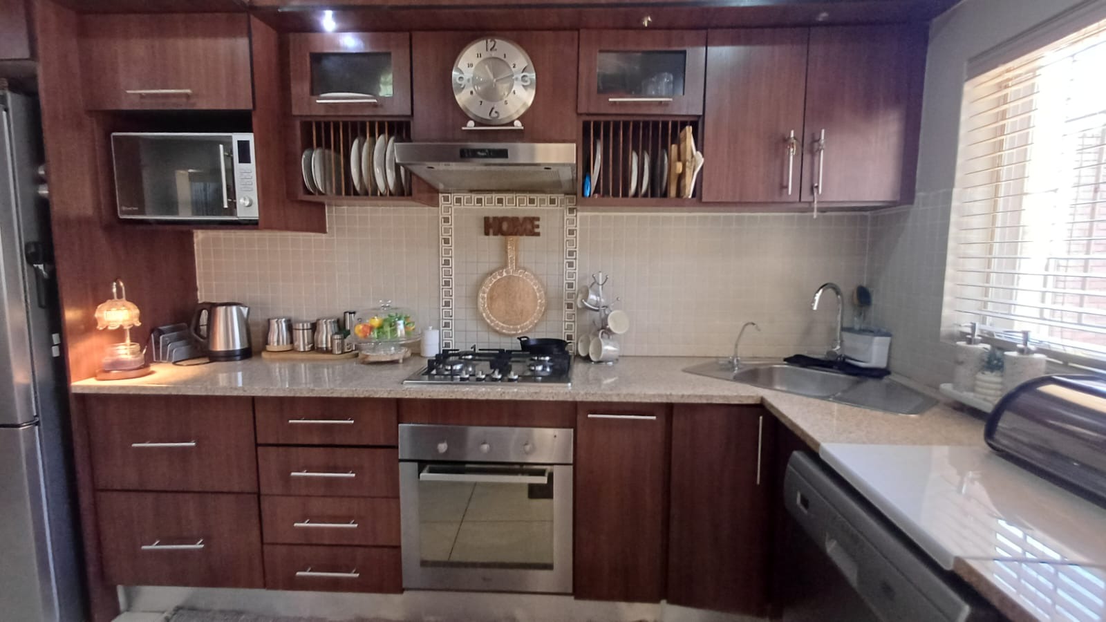 Step into this lovely home in Elandspark, Johannesburg, where comfort meets convenience. The heart of the home is a well-equipped kitchen, boasting modern stainless steel appliances like a gas hob, oven, microwave, and dishwasher, all complemented by dark wood cabinetry, granite countertops, and a tiled backsplash. It’s an open-plan space that flows effortlessly into the living area, perfect for entertaining or just relaxing. The living room itself is a cozy spot with a stylish geometric accent wall, a large, comfortable sectional sofa, and a sliding glass door that opens up to the outdoors, letting in plenty of natural light. You'll also find a charming dining area with an exposed brick archway and another large window, creating a warm atmosphere for meals. This home offers two comfortable bedrooms and three bathrooms, including two ensuites and a handy guest toilet, ensuring everyone has their own space. Need a quiet spot to work? There's a dedicated home office or study with a glass desk and ample natural light. The entire house features easy-to-maintain tiled flooring throughout. Outside, you’ll appreciate the private garden, paving, and a secure fence, making it a great space for pets, which are welcome here! Parking is a breeze with a double garage and additional space for four more vehicles. For your peace of mind, the property is fitted with burglar bars and a security gate. Located in the metropolitan and suburban area of Elandspark, Johannesburg, this home offers a fantastic blend of city access and a relaxed neighborhood vibe. Key Features: * 2 Bedrooms, 3 Bathrooms (2 en-suite) * Modern kitchen with stainless steel appliances * Open-plan living and dining areas * Dedicated home office/study * Double garage + 4 additional parking spaces * Private garden and patio access * Security features: burglar bars, security gate, fence * Tiled flooring throughout * Pets allowed